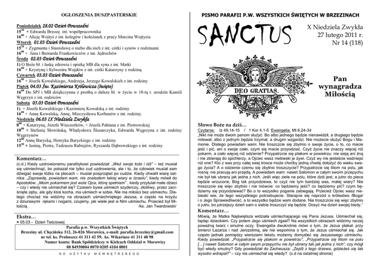 OGŁOSZENIA DUSZPASTERSKIE Poniedziałek 28.02 Dzień Powszedni 1530 + Edwarda Brzozę int. współpracownika 1600 + Alicję Wojtyś z int. kolegów i koleżanek z pracy Marcina Wojtysia Wtorek 01.03 Dzień Powszedni 1530 + Zygmunta i Stanisławę o niebo dla nich z int. córki i synów z rodzinami 1600 + Jana i Bernarda Frankowiczów z int. Jędrochów Środa 02.03 Dzień Powszedni 1) O Boże bł. i łaskę zdrowia i opiekę MB dla syna z int. Matki 1600 + Krystynę i Sylwestra Wojdów z int. córki Katarzyny z rodziną Czwartek 03.03 Dzień Powszedni 1600 + Józefa Kowalskiego, Andrzeja, Jerzego Kowalskich z int. rodziny Piątek 04.03 Św. Kazimierza Królewicza (święto) (święto) 1600 Do SPJ i MB dziękczynna z prośbą o dalsze bł. w życiu w 18-tą r. urodzin Kamili Węgrzyn z int. rodziców Sobota 05.03 Dzień Powszedni 1) + Józefa Kowalskiego i Kazimierę Kowalską z int. rodziny 1600 + Annę Kowalską, Annę, Mieczysława Korbanów z int. rodziny. Niedziela 06.03 IX Niedziela Zwykła 800 + Katarzynę, Józefa Wieczorków, + Józefa Pabiana z int. Piotrowskiej 1000 + Stefanię Słowińską, Władysława Ślusarczyka, Edwarda Węgrzyna z int. rodziny Węgrzynów 1200 Annę Barycką, Henryka Baryckiego z int. rodziny 1530 + Janinę, Piotra, Tadeusza Rabiejów, Ryszarda Dąbrowskiego z int. rodziny Komentarz… (c.d.) Kiedy uzdrowionemu paralitykowi powiedział: „Weź swoje łoże i idź” – też musiał się uśmiechnąć, bo pokazał nie tylko cud uzdrowienia, ale i to, że człowiek musiał sam dźwigać swoje łóżko na plecach – musiał posprzątać po cudzie. Kiedy chwalił wiarę setnika: „Zaprawdę, powiadam wam, nie znalazłem takiej wiary w Izraelu”, kiedy mówił do Apostołów: „Moim pokarmem jest wola Ojca, którą spełniam” , kiedy przytulał małe dzieci – czy i wtedy nie uśmiechał się? Czasem bywa uśmiech szyderczy, złośliwy, przez zaciśnięte zęby, ale gdy ktoś kocha, ma uśmiech w sobie. Nie ma miłości bez uśmiechu. Dlatego chociaż nie widzimy na obrazach uśmiechniętego Jezusa, a często na krzyżu z dziurawymi rękami i nogami, czujemy, jak wiele jest w Nim uśmiechu. Przecież był Miłością. /ks. Jan Twardowski/ PISMO PARAFII P.W. WSZYSTKICH ŚWIĘTYCH W BRZEZINACH SANC SANCTUS X Niedziela Zwykła 27 lutego 2011 r. Nr 14 (118) Pan wynagradza Miłością Słowo Boże na dziś… Czytania: Iz 49,14-15 / 1 Kor 4,1-5 Ewangelia: Mt 6,24-34 „Nikt nie może dwom panom służyć. Bo albo jednego będzie nienawidził, a drugiego będzie miłował; albo z jednym będzie trzymał, a drugim wzgardzi. Nie możecie służyć Bogu i Mamonie. Dlatego powiadam wam: Nie troszczcie się zbytnio o swoje życie, o to, co macie jeść i pić, ani o swoje ciało, czym się macie przyodziać. Czyż życie nie znaczy więcej niż pokarm, a ciało więcej niż odzienie? Przypatrzcie się ptakom w powietrzu: nie sieją ani żną i nie zbierają do spichlerzy, a Ojciec wasz niebieski je żywi. Czyż wy nie jesteście ważniejsi niż one? Kto z was przy całej swej trosce może choćby jedną chwilę dołożyć do wieku swego życia? A o odzienie czemu się zbytnio troszczycie? Przypatrzcie się liliom na polu, jak rosną: nie pracują ani przędą. A powiadam wam: nawet Salomon w całym swoim przepychu nie był tak ubrany jak jedna z nich. Jeśli więc ziele na polu, które dziś jest, a jutro do pieca będzie wrzucone, Bóg tak przyodziewa, to czyż nie tym bardziej was, małej wiary? Nie troszczcie się więc zbytnio i nie mówcie: co będziemy jeść? co będziemy pić? czym będziemy się przyodziewać? Bo o to wszystko poganie zabiegają. Przecież Ojciec wasz niebieski wie, że tego wszystkiego potrzebujecie. Starajcie się naprzód o królestwo /Boga/ i o Jego Sprawiedliwość, a to wszystko będzie wam dodane. Nie troszczcie się więc zbytnio o jutro, bo jutrzejszy dzień sam o siebie troszczyć się będzie. Dosyć ma dzień swojej biedy.” Komentarz… Ekstra… × 05.03 - Dzień Teściowej Parafia p.w. Wszystkich Świętych Brzeziny ul. Chęcińska 312, 26-026 Morawica, e-mail: [email protected] nr tel. ks. Proboszcz 41 311 42 59, ks. Wikariusz 41 311 48 98 Numer konta: Bank Spółdzielczy w Kielcach Oddział w Morawicy 08 84930004 0070 0205 4104 0001 D O U Ż Y T K U W E W N Ę T R Z N E G O Mówią, że Matka Najświętsza widziała uśmiechającego się Pana Jezusa. Uśmiechał się, będąc dzieckiem. Czy potem Jego uśmiech zgasł? Na wszystkich obrazach widzimy raczej poważną twarz i smutne oczy. Ewangelia dwukrotnie mówi o tym, że Jezus płakał: przy śmierci Łazarza i nad Jerozolimą, ale nie wspomina o tym, że Jezus uśmiechał się. Jak często jednak pomiędzy wierszami tekstu możemy domyśleć się Jezusowego uśmiechu. Kiedy powiedział: „Przypatrzcie się ptakom w powietrzu”, „Przypatrzcie się liliom na polu […] nawet Salomon w całym swym przepychu nie był ubrany tak jak jedna z nich”, czy mógł być wtedy smutny? Gdy powiedział do Zacheusza: „Zejdź z tego drzewa, gdzieżeś się tak wysoko wdrapał?” – czy nie uśmiechał się wtedy? (c.d na ostatniej stronie) A w parafii… Boży człowiek… - św. Roman Jurajski (29 lutego) ▪ 4 marca przypada wspomnienie św. Kazimierz Królewicza - odpust w parafii Bilcza ▪ 5 marca dwie osoby z naszej parafii, będą przeżywały ważny dzień w swoim życiu. Kleryk Dariusz otrzyma święcenia diakonatu, a brat Jakub Edward złoży zakonne śluby czasowe. Pamiętajmy w tym czasie szczególnie o modlitwie w intencji ich powołania, aby ich serca zawsze były nastawione na słuchanie głosu Pana. ▪ Reprezentacja Polski po raz trzeci z rzędu sięgnęła po złoty medal mistrzostw Europy księży w halowej piłce nożnej. W finale rozgrywanego w Kielcach turnieju, "biało–czerwoni" wygrali z Chorwacją 4:2. Na meczu finałowym nie zabrakło kibiców z naszej parafii. Intencja różańcowa na marzec „Kwiatki Jana Pawła II” ogólna: Aby tożsamo