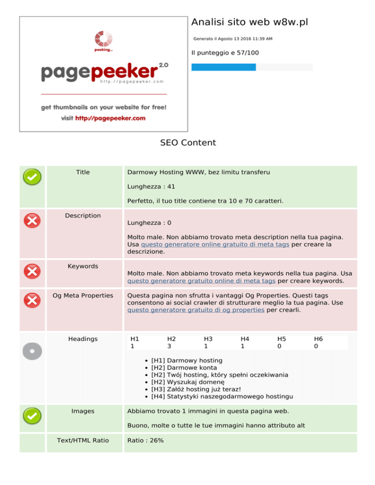 Analisi sito web w8w.pl Generato il Agosto 13 2016 11:39 AM Il punteggio e 57/100 SEO Content Title Darmowy Hosting WWW, bez limitu transferu Lunghezza : 41 Perfetto, il tuo title contiene tra 10 e 70 caratteri. Description Lunghezza : 0 Molto male. Non abbiamo trovato meta description nella tua pagina. Usa questo generatore online gratuito di meta tags per creare la descrizione. Keywords Molto male. Non abbiamo trovato meta keywords nella tua pagina. Usa questo generatore gratuito online di meta tags per creare keywords. Og Meta Properties Headings Questa pagina non sfrutta i vantaggi Og Properties. Questi tags consentono ai social crawler di strutturare meglio la tua pagina. Use questo generatore gratuito di og properties per crearli. H1 1 H2 3 [H1] [H2] [H2] [H2] [H3] [H4] Images H3 1 H4 1 H5 0 Darmowy hosting Darmowe konta Twój hosting, który spełni oczekiwania Wyszukaj domenę Załóż hosting już teraz! Statystyki naszegodarmowego hostingu Abbiamo trovato 1 immagini in questa pagina web. Buono, molte o tutte le tue immagini hanno attributo alt Text/HTML Ratio Ratio : 26% H6 0 SEO Content Ideale! Il rapporto testo/codice HTML di questa pagina e tra 25 e 70 percento. Flash Iframe Perfetto, non e stato rilevato contenuto Flash in questa pagina. Grande, non sono stati rilevati Iframes in questa pagina. SEO Links URL Rewrite Buono. I tuoi links appaiono friendly! Underscores in the URLs Perfetto! Non sono stati rilevati underscores nei tuoi URLs. In-page links Abbiamo trovato un totale di 13 links inclusi 0 link(s) a files Statistics External Links : noFollow 7.69% External Links : Passing Juice 76.92% Internal Links 15.38% In-page links Anchor Type Juice Hosting Externo Passing Juice Statystyki stron Externo Passing Juice filmiki Externo Passing Juice fora Externo Passing Juice pogoda Externo Passing Juice gry online Externo Passing Juice programy Externo Passing Juice Katalog Firm Externo Passing Juice In-page links Ipla Film Externo Passing Juice Załóż darmowy hosting Externo Passing Juice Katalog stron Interno Passing Juice Zgadzam się Interno Passing Juice Polityka cookies Externo noFollow SEO Keywords Keywords Cloud cookies spełni aby się hosting bez zgadzam oczekiwania darmowy załóż Consistenza Keywords Keyword Contenuto hosting 8 się 5 cookies 4 bez 3 darmowy 3 Title Keywords Description Usabilita Url Dominio : w8w.pl Lunghezza : 6 Favicon Grande, il tuo sito usa una favicon. Stampabilita Non abbiamo riscontrato codice CSS Print-Friendly. Lingua Buono. La tua lingua dichiarata pl. Dublin Core Questa pagina non sfrutta i vantaggi di Dublin Core. Headings Usabilita Documento Doctype HTML 5 Encoding Perfetto. Hai dichiarato che il tuo charset e UTF-8. Validita W3C Errori : 2 Avvisi : 0 Email Privacy Grande. Nessun indirizzo mail e stato trovato in plain text! Deprecated HTML Grande! Non abbiamo trovato tags HTML deprecati nel tuo codice. Suggerimenti per velocizzare Eccellente, il tuo sito web non utilizza nested tables. Molto male, il tuo sito web utilizza stili CSS inline. Grande, il tuo sito web ha pochi file CSS. Perfetto, il tuo sito web ha pochi file JavaScript. Perfetto, il vostro sito si avvale di gzip. Mobile Mobile Optimization Apple Icon Meta Viewport Tag Flash content Ottimizzazione XML Sitemap Non trovato Il tuo sito web non ha una sitemap XML - questo può essere Ottimizzazione problematico. A elenca sitemap URL che sono disponibili per la scansione e possono includere informazioni aggiuntive come gli ultimi aggiornamenti del tuo sito, frequenza delle variazioni e l'importanza degli URL. In questo modo i motori di ricerca di eseguire la scansione del sito in modo più intelligente. Robots.txt Non trovato Il tuo sito web non dispone di un file robots.txt - questo può essere problematico. Un file robots.txt consente di limitare l'accesso dei robot dei motori di ricerca che strisciano sul web ed è possibile evitare che questi robot di accedere directory e pagine specifiche. Specifica anche il luogo dove si trova il file sitemap XML. Analytics Grande, il vostro sito ha uno strumento di analisi dei dati. Google Analytics Powered by TCPDF (www.tcpdf.org)