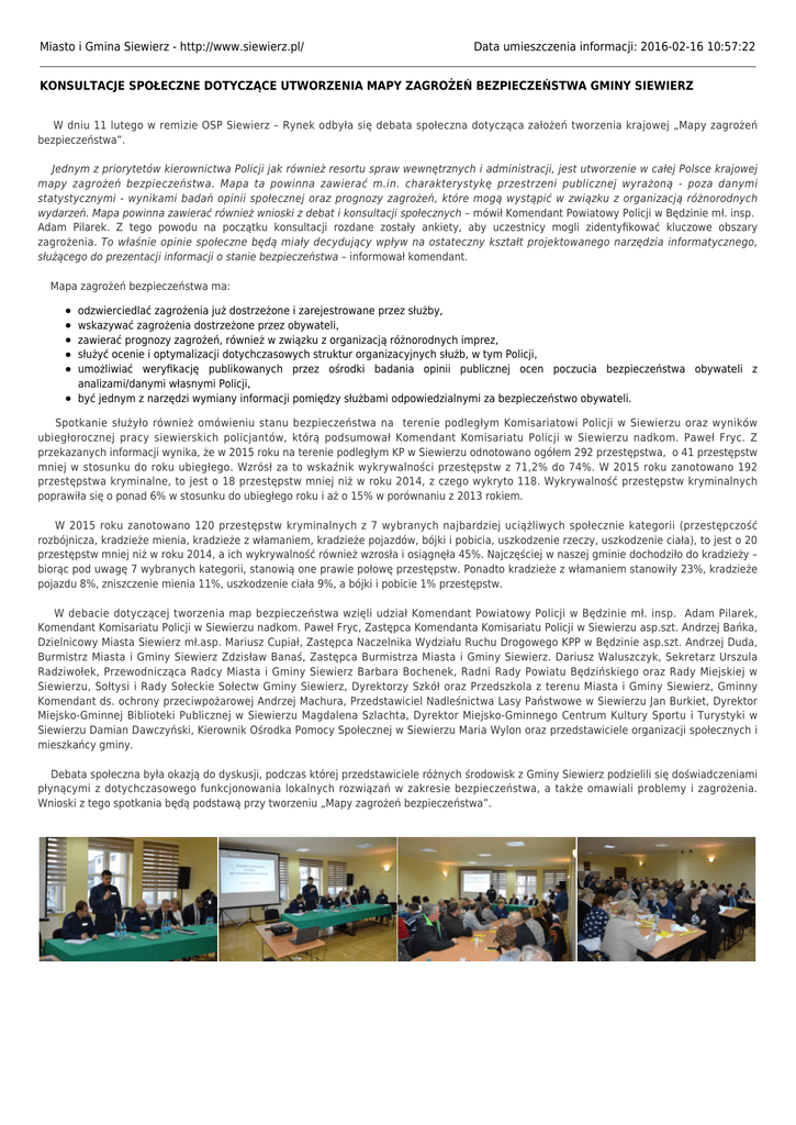Miasto i Gmina Siewierz - http://www.siewierz.pl/ Data umieszczenia informacji: 2016-02-16 10:57:22 KONSULTACJE SPOŁECZNE DOTYCZĄCE UTWORZENIA MAPY ZAGROŻEŃ BEZPIECZEŃSTWA GMINY SIEWIERZ W dniu 11 lutego w remizie OSP Siewierz – Rynek odbyła się debata społeczna dotycząca założeń tworzenia krajowej „Mapy zagrożeń bezpieczeństwa”. Jednym z priorytetów kierownictwa Policji jak również resortu spraw wewnętrznych i administracji, jest utworzenie w całej Polsce krajowej mapy zagrożeń bezpieczeństwa. Mapa ta powinna zawierać m.in. charakterystykę przestrzeni publicznej wyrażoną - poza danymi statystycznymi - wynikami badań opinii społecznej oraz prognozy zagrożeń, które mogą wystąpić w związku z organizacją różnorodnych wydarzeń. Mapa powinna zawierać również wnioski z debat i konsultacji społecznych – mówił Komendant Powiatowy Policji w Będzinie mł. insp. Adam Pilarek. Z tego powodu na początku konsultacji rozdane zostały ankiety, aby uczestnicy mogli zidentyfikować kluczowe obszary zagrożenia. To właśnie opinie społeczne będą miały decydujący wpływ na ostateczny kształt projektowanego narzędzia informatycznego, służącego do prezentacji informacji o stanie bezpieczeństwa – informował komendant. Mapa zagrożeń bezpieczeństwa ma: odzwierciedlać zagrożenia już dostrzeżone i zarejestrowane przez służby, wskazywać zagrożenia dostrzeżone przez obywateli, zawierać prognozy zagrożeń, również w związku z organizacją różnorodnych imprez, służyć ocenie i optymalizacji dotychczasowych struktur organizacyjnych służb, w tym Policji, umożliwiać weryfikację publikowanych przez ośrodki badania opinii publicznej ocen poczucia bezpieczeństwa obywateli z analizami/danymi własnymi Policji, być jednym z narzędzi wymiany informacji pomiędzy służbami odpowiedzialnymi za bezpieczeństwo obywateli. Spotkanie służyło również omówieniu stanu bezpieczeństwa na terenie podległym Komisariatowi Policji w Siewierzu oraz wyników ubiegłorocznej pracy siewierskich policjantów, którą podsumował Komendant Komisariatu Policji w Siewierzu nadkom. Paweł Fryc. Z przekazanych informacji wynika, że w 2015 roku na terenie podległym KP w Siewierzu odnotowano ogółem 292 przestępstwa, o 41 przestępstw mniej w stosunku do roku ubiegłego. Wzrósł za to wskaźnik wykrywalności przestępstw z 71,2% do 74%. W 2015 roku zanotowano 192 przestępstwa kryminalne, to jest o 18 przestępstw mniej niż w roku 2014, z czego wykryto 118. Wykrywalność przestępstw kryminalnych poprawiła się o ponad 6% w stosunku do ubiegłego roku i aż o 15% w porównaniu z 2013 rokiem. W 2015 roku zanotowano 120 przestępstw kryminalnych z 7 wybranych najbardziej uciążliwych społecznie kategorii (przestępczość rozbójnicza, kradzieże mienia, kradzieże z włamaniem, kradzieże pojazdów, bójki i pobicia, uszkodzenie rzeczy, uszkodzenie ciała), to jest o 20 przestępstw mniej niż w roku 2014, a ich wykrywalność również wzrosła i osiągnęła 45%. Najczęściej w naszej gminie dochodziło do kradzieży – biorąc pod uwagę 7 wybranych kategorii, stanowią one prawie połowę przestępstw. Ponadto kradzieże z włamaniem stanowiły 23%, kradzieże pojazdu 8%, zniszczenie mienia 11%, uszkodzenie ciała 9%, a bójki i pobicie 1% przestępstw. W debacie dotyczącej tworzenia map bezpieczeństwa wzięli udział Komendant Powiatowy Policji w Będzinie mł. insp. Adam Pilarek, Komendant Komisariatu Policji w Siewierzu nadkom. Paweł Fryc, Zastępca Komendanta Komisariatu Policji w Siewierzu asp.szt. Andrzej Bańka, Dzielnicowy Miasta Siewierz mł.asp. Mariusz Cupiał, Zastępca Naczelnika Wydziału Ruchu Drogowego KPP w Będzinie asp.szt. Andrzej Duda, Burmistrz Miasta i Gminy Siewierz Zdzisław Banaś, Zastępca Burmistrza Miasta i Gminy Siewierz. Dariusz Waluszczyk, Sekretarz Urszula Radziwołek, Przewodnicząca Radcy Miasta i Gminy Siewierz Barbara Bochenek, Radni Rady Powiatu Będzińskiego oraz Rady Miejskiej w Siewierzu, Sołtysi i Rady Sołeckie Sołectw Gminy Siewierz, Dyrektorzy Szkół oraz Przedszkola z terenu Miasta i Gminy Siewierz, Gminny Komendant ds. ochrony przeciwpożarowej Andrzej Machura, Przedstawiciel Nadleśnictwa Lasy Państwowe w Siewierzu Jan Burkiet, Dyrektor Miejsko-Gminnej Biblioteki Publicznej w Siewierzu Magdalena Szlachta, Dyrektor Miejsko-Gminnego Centrum Kultury Sportu i Turystyki w Siewierzu Damian Dawczyński, Kierownik Ośrodka Pomocy Społecznej w Siewierzu Maria Wylon oraz przedstawiciele organizacji społecznych i mieszkańcy gminy. Debata społeczna była okazją do dyskusji, podczas której przedstawiciele różnych środowisk z Gminy Siewierz podzielili się doświadczeniami płynącymi z dotychczasowego funkcjonowania lokalnych rozwiązań w zakresie bezpieczeństwa, a także omawiali problemy i zagrożenia. Wnioski z tego spotkania będą podstawą przy tworzeniu „Mapy zagrożeń bezpieczeństwa”. Urząd Miasta i Gminy Siewierz, 42-470 Siewierz, ul. Żwirki i WIgury 16, tel. 32 64 99 400, e-mail: [email protected] Burmistrz Miasta i Gminy Siewierz mgr Zdzisław Banaś