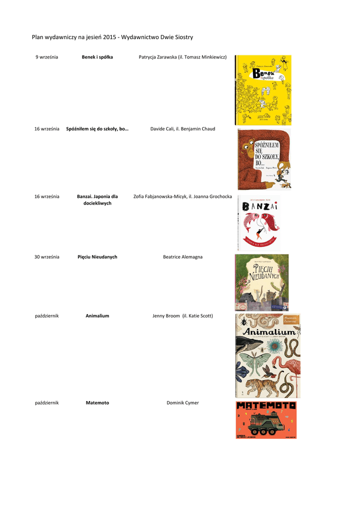 Plan wydawniczy na jesień 2015 - Wydawnictwo Dwie Siostry 9 września Benek i spółka Patrycja Zarawska (il. Tomasz Minkiewicz) 16 września Spóźniłem się do szkoły, bo… Davide Cali, il. Benjamin Chaud 16 września Banzai. Japonia dla dociekliwych Zofia Fabjanowska-Micyk, il. Joanna Grochocka 30 września Pięciu Nieudanych Beatrice Alemagna październik Animalium Jenny Broom (il. Katie Scott) październik Matemoto Dominik Cymer październik METO 2. Wyspa Yves Grevet październik Sto nóg stonogi Fruzi Agnieszka Horubała (il. Zosia Dzierżawska) październik Pszczoły Piotr Socha październik Suwała, Baron i inni. Przepisy i opowieści Paweł Suwała, Aleksander Baron, Grzegorz Kwapniewski, Dariusz Wolszczak, Julian Karewicz październik Pożyczalscy pomszczeni Mary Norton (il. Emilia Dziubak) listopad Tata Toon Tellegen (il. Rotraut Susanne Berner ) listopad Idziemy na niedźwiedzia Michael Rosen (il. Helen Oxenbury) listopad MAPY wydanie III Aleksandra Mizielińska , Daniel Mizieliński listopad Felek i Tola i porywacze Sylvia Vanden Heede (il. Thé Tjong-Khing) listopad O.G.R.Ó.D. Ewa Kołaczyńska (il. Adam Wójcicki ) listopad Zakątki, czyli kto tu mieszka Michalina Rolnik listopad Jejku-Jejku chce coś zmienić Magali Le Huche listopad Ciężar wody Sarah Crossan