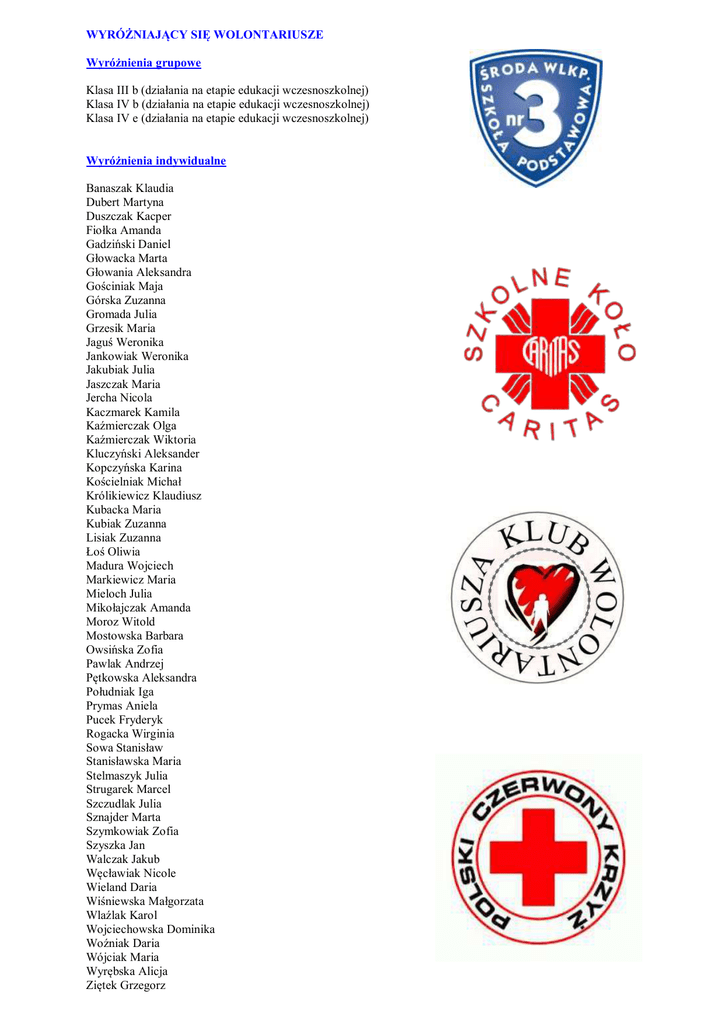 WYRÓŻNIAJĄCY SIĘ WOLONTARIUSZE Wyróżnienia grupowe Klasa III b (działania na etapie edukacji wczesnoszkolnej) Klasa IV b (działania na etapie edukacji wczesnoszkolnej) Klasa IV e (działania na etapie edukacji wczesnoszkolnej) Wyróżnienia indywidualne Banaszak Klaudia Dubert Martyna Duszczak Kacper Fiołka Amanda Gadziński Daniel Głowacka Marta Głowania Aleksandra Gościniak Maja Górska Zuzanna Gromada Julia Grzesik Maria Jaguś Weronika Jankowiak Weronika Jakubiak Julia Jaszczak Maria Jercha Nicola Kaczmarek Kamila Kaźmierczak Olga Kaźmierczak Wiktoria Kluczyński Aleksander Kopczyńska Karina Kościelniak Michał Królikiewicz Klaudiusz Kubacka Maria Kubiak Zuzanna Lisiak Zuzanna Łoś Oliwia Madura Wojciech Markiewicz Maria Mieloch Julia Mikołajczak Amanda Moroz Witold Mostowska Barbara Owsińska Zofia Pawlak Andrzej Pętkowska Aleksandra Południak Iga Prymas Aniela Pucek Fryderyk Rogacka Wirginia Sowa Stanisław Stanisławska Maria Stelmaszyk Julia Strugarek Marcel Szczudlak Julia Sznajder Marta Szymkowiak Zofia Szyszka Jan Walczak Jakub Węcławiak Nicole Wieland Daria Wiśniewska Małgorzata Wlaźlak Karol Wojciechowska Dominika Woźniak Daria Wójciak Maria Wyrębska Alicja Ziętek Grzegorz