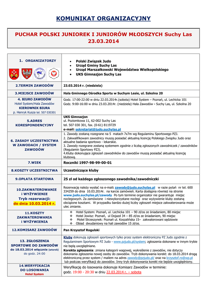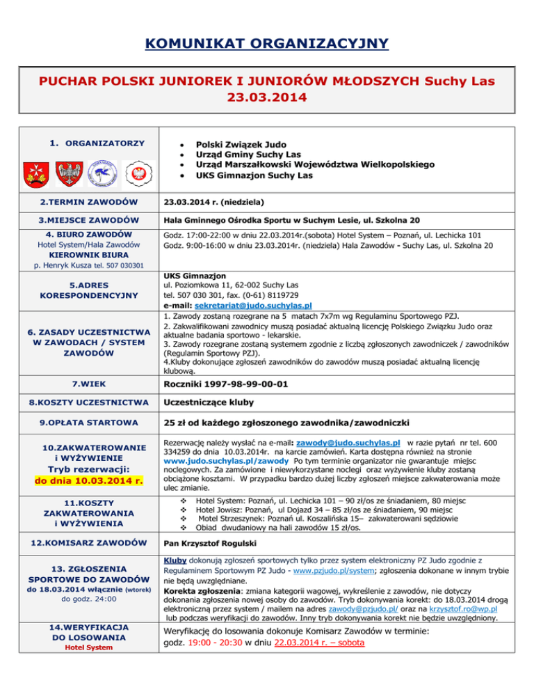 KOMUNIKAT ORGANIZACYJNY PUCHAR POLSKI JUNIOREK I JUNIORÓW MŁODSZYCH Suchy Las 23.03.2014 1. ORGANIZATORZY Polski Związek Judo Urząd Gminy Suchy Las Urząd Marszałkowski Województwa Wielkopolskiego UKS Gimnazjon Suchy Las 2.TERMIN ZAWODÓW 23.03.2014 r. (niedziela) 3.MIEJSCE ZAWODÓW Hala Gminnego Ośrodka Sportu w Suchym Lesie, ul. Szkolna 20 4. BIURO ZAWODÓW Hotel System/Hala Zawodów KIEROWNIK BIURA p. Henryk Kusza tel. 507 030301 5.ADRES KORESPONDENCYJNY 6. ZASADY UCZESTNICTWA W ZAWODACH / SYSTEM ZAWODÓW 7.WIEK 8.KOSZTY UCZESTNICTWA 9.OPŁATA STARTOWA 10.ZAKWATEROWANIE i WYŻYWIENIE Tryb rezerwacji: do dnia 10.03.2014 r. 11.KOSZTY ZAKWATEROWANIA i WYŻYWIENIA 12.KOMISARZ ZAWODÓW 13. ZGŁOSZENIA SPORTOWE DO ZAWODÓW do 18.03.2014 włącznie (wtorek) do godz. 24:00 14.WERYFIKACJA DO LOSOWANIA Hotel System Godz. 17:00-22:00 w dniu 22.03.2014r.(sobota) Hotel System – Poznań, ul. Lechicka 101 Godz. 9:00-16:00 w dniu 23.03.2014r. (niedziela) Hala Zawodów - Suchy Las, ul. Szkolna 20 UKS Gimnazjon ul. Poziomkowa 11, 62-002 Suchy Las tel. 507 030 301, fax. (0-61) 8119729 e-mail: [email protected] 1. Zawody zostaną rozegrane na 5 matach 7x7m wg Regulaminu Sportowego PZJ. 2. Zakwalifikowani zawodnicy muszą posiadać aktualną licencję Polskiego Związku Judo oraz aktualne badania sportowo - lekarskie. 3. Zawody rozegrane zostaną systemem zgodnie z liczbą zgłoszonych zawodniczek / zawodników (Regulamin Sportowy PZJ). 4.Kluby dokonujące zgłoszeń zawodników do zawodów muszą posiadać aktualną licencję klubową. Roczniki 1997-98-99-00-01 Uczestniczące kluby 25 zł od każdego zgłoszonego zawodnika/zawodniczki Rezerwację należy wysłać na e-mail: [email protected] w razie pytań nr tel. 600 334259 do dnia 10.03.2014r. na karcie zamówień. Karta dostępna również na stronie www.judo.suchylas.pl/zawody Po tym terminie organizator nie gwarantuje miejsc noclegowych. Za zamówione i niewykorzystane noclegi oraz wyżywienie kluby zostaną obciążone kosztami. W przypadku bardzo dużej liczby zgłoszeń miejsce zakwaterowania może ulec zmianie. Hotel System: Poznań, ul. Lechicka 101 – 90 zł/os ze śniadaniem, 80 miejsc Hotel Jowisz: Poznań, ul Dojazd 34 – 85 zł/os ze śniadaniem, 90 miejsc Motel Strzeszynek: Poznań ul. Koszalińska 15– zakwaterowani sędziowie Obiad dwudaniowy na hali zawodów 15 zł/os. Pan Krzysztof Rogulski Kluby dokonują zgłoszeń sportowych tylko przez system elektroniczny PZ Judo zgodnie z Regulaminem Sportowym PZ Judo - www.pzjudo.pl/system; zgłoszenia dokonane w innym trybie nie będą uwzględniane. Korekta zgłoszenia: zmiana kategorii wagowej, wykreślenie z zawodów, nie dotyczy dokonania zgłoszenia nowej osoby do zawodów. Tryb dokonywania korekt: do 18.03.2014 drogą elektroniczną przez system / mailem na adres [email protected]/ oraz na [email protected] lub podczas weryfikacji do zawodów. Inny tryb dokonywania korekt nie będzie uwzględniony. Weryfikację do losowania dokonuje Komisarz Zawodów w terminie: godz. 19:00 - 20:30 w dniu 22.03.2014 r. – sobota 15.KONFERENCJA TECHNICZNA I LOSOWANIE Godz. 21:00 w dniu 22.03.2014 r. – sobota Hotel System 16.SĘDZIA GŁÓWNY 17.JUDOGI 18.WAŻENIE Hotel System i hala zawodów. Pan Jarosław Niewiadomski - tel. 603 759691. Sędzia Główny uczestniczy w Konferencji technicznej. Obowiązują judogi białe i niebieskie. Pierwszy wyczytany zawodnik/zawodniczka ubiera judogi białe, drugi zawodnik/zawodniczka judogi niebieskie. Kontrola judogi odbywa się zgodnie z zasadami Sokuteiki. Do dekoracji obowiązują judogi koloru białego. Waga kontrolna: 22.03.2014 r. – sobota w godz. 17:00 – 22:00 Waga nieoficjalna: 23.03.2014 r. – niedziela w godz. 6:00 – 7:00 Waga oficjalna: 23.03.2014 r. – niedziela w godz. 7:00 – 9:00 Nie zezwala się na ważenie zawodniczek i zawodników bez bielizny osobistej; Limity wagowe są powiększone o dodatkowe 100g. Podczas ważenia należy posiadać dokument tożsamości oraz ważne badania lekarskie. 19.PRZEGLĄD LEKARSKI na hali zawodów. 20. CZAS WALKI 21.PROGRAM ZAWODÓW 22. TRANSPORT 23.INNE INFORMACJE 24. WYRÓŻNIENIA I NAGRODY Przegląd lekarski: 23.03.2014 r. – niedziela w godz. 8:00 – 9:30 Czas walki – 4 minuty, Golden Score z otwartym czasem walki 22.03.2014 r. – sobota Godz. 17:00 – 21:00 – przyjazd i zakwaterowanie ekip w Biurze Zawodów - Hotel System 23.03.2014 r. – niedziela Kategorie wagowe: jun. młodsze 40kg, 44kg, 48kg, 52kg, 57kg, 63kg, 70kg, +70kg. Kategorie wagowe: jun. młodsi 46kg, 50kg, 55kg, 60kg, 66kg, 73kg, 81kg, 90kg, +90kg. Godz. 10:00 - Ceremonia uroczystego otwarcie zawodów Godz. 10:15 - Rozpoczęcie walk eliminacyjnych Po zakończeniu walk eliminacyjnych i repasażowych w kategoriach wagowych walki o medale brązowe, walki finałowe, dekoracja medalistów. Organizator zapewnia transport osób zakwaterowanych w Hotelu System i Jowisz. Wymagane wcześniejsze zgłoszenie w biurze zawodów. Najpóźniej podczas weryfikacji. 1. Wszyscy zawodnicy i zawodniczki muszą posiadać ważne ubezpieczenie od następstw nieszczęśliwych wypadków (NNW). Odpowiedzialność za zapewnienie ubezpieczenia dla uczestników zawodów spoczywa na Klubach. 2. Wszyscy zawodnicy muszą posiadać aktualne orzeczenie lekarskie. Odpowiedzialność za ważność i posiadanie orzeczenia przez zawodniczki i zawodników ponoszą trenerzy klubowi. Orzeczenie wydaje lekarz specjalista w dziedzinie medycyny sportowej, w przypadku braku lekarza specjalisty w dziedzinie medycyny sportowej, orzeczenie, może wydać lekarz posiadający certyfikat ukończenia kursu wprowadzającego do specjalizacji w dziedzinie medycyny sportowej. Badania nie spełniające powyższych wymogów nie będą uwzględnione, tym samym zawodniczka / zawodnik nie będą dopuszczeni do udziału w zawodach. 3. Organizator nie ponosi odpowiedzialności za zaistniałe wydarzenia. 4. Obwiązują zasady Dress Code oraz Code of Conduct for Judo Coeches W klasyfika