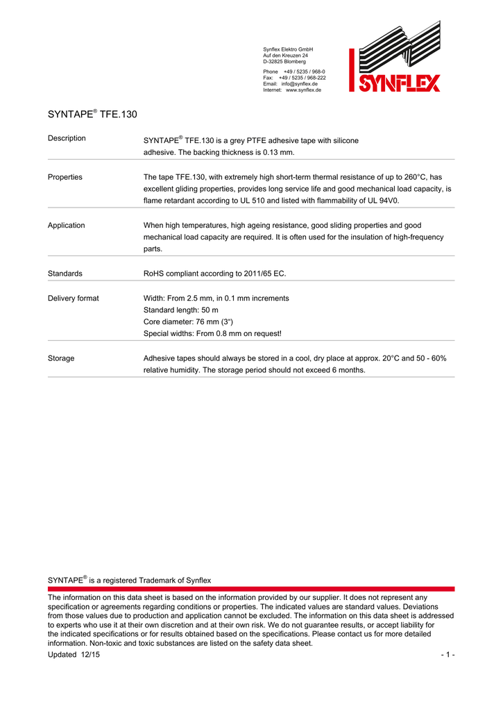 Synflex Elektro GmbH Auf den Kreuzen 24 D-32825 Blomberg Phone +49 / 5235 / 968-0 Fax: +49 / 5235 / 968-222 Email: [email protected] Internet: www.synflex.de SYNTAPE TFE.130 ® Description ® SYNTAPE TFE.130 is a grey PTFE adhesive tape with silicone adhesive. The backing thickness is 0.13 mm. Properties The tape TFE.130, with extremely high short-term thermal resistance of up to 260°C, has excellent gliding properties, provides long service life and good mechanical load capacity, is flame retardant according to UL 510 and listed with flammability of UL 94V0. Application When high temperatures, high ageing resistance, good sliding properties and good mechanical load capacity are required. It is often used for the insulation of high-frequency parts. Standards RoHS compliant according to 2011/65 EC. Delivery format Width: From 2.5 mm, in 0.1 mm increments Standard length: 50 m Core diameter: 76 mm (3“) Special widths: From 0.8 mm on request! Storage Adhesive tapes should always be stored in a cool, dry place at approx. 20°C and 50 - 60% relative humidity. The storage period should not exceed 6 months. ® SYNTAPE is a registered Trademark of Synflex The information on this data sheet is based on the information provided by our supplier. It does not represent any specification or agreements regarding conditions or properties. The indicated values are standard values. Deviations from those values due to production and application cannot be excluded. The information on this data sheet is addressed to experts who use it at their own discretion and at their own risk. We do not guarantee results, or accept liability for the indicated specifications or for results obtained based on the specifications. Please contact us for more detailed information. Non-toxic and toxic substances are listed on the safety data sheet. Updated 12/15 -1- Synflex Elektro GmbH Auf den Kreuzen 24 D-32825 Blomberg Phone +49 / 5235 / 968-0 Fax: +49 / 5235 / 968-222 Email: [email protected] Internet: http://www.synflex.de ® SYNTAPE TFE.130 Technical data Type/ Ordering information TFE.130 Standard colours Grey Backing PTFE film Backing thickness 0.130 mm +/- 10 % Adhesive Silicone Total thickness 0.180 mm +/- 10 % Tear force Average value 38 N/ 10 mm (min. 35 N/ 10 mm) Elongation at break Average value 320 % (min. 300 %) Adhesiveness / Adhesion to steel Average value 3,0 N/ 10 mm (min. 2,4 N/ 10 mm) Dielectric strength Average value 11500 Veff (min. 11000 Veff) Thermal class 180 °C/ H Flame retardant UL510 Flammability UL94V0 temperature range -50 / +260 °C ® SYNTAPE is a registered Trademark of Synflex The information on this data sheet is based on the information provided by our supplier. It does not represent any specification or agreements regarding conditions or properties. The indicated values are standard values. Deviations from those values due to production and application cannot be excluded. The information on this data sheet is addressed to experts who use it at their own discretion and at their own risk. We do not guarantee results, or accept liability for the indicated specifications or for results obtained based on the specifications. Please contact us for more detailed information. Non-toxic and toxic substances are listed on the safety data sheet. Updated 12/15 -2-