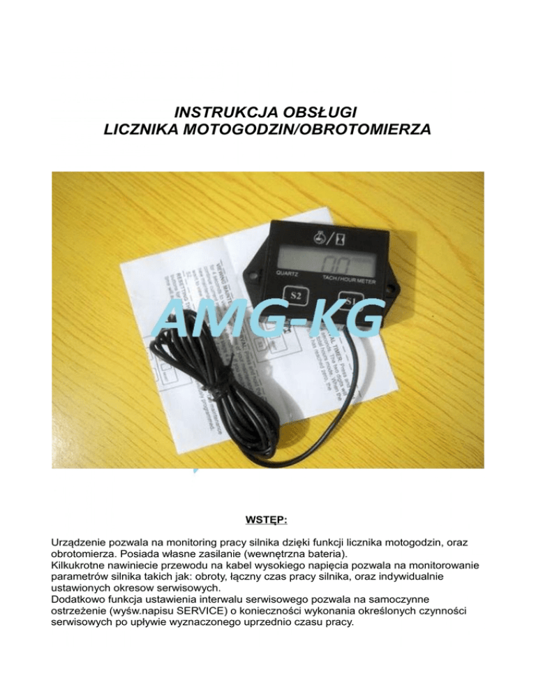 INSTRUKCJA OBSŁUGI LICZNIKA MOTOGODZIN/OBROTOMIERZA WSTĘP: Urządzenie pozwala na monitoring pracy silnika dzięki funkcji licznika motogodzin, oraz obrotomierza. Posiada własne zasilanie (wewnętrzna bateria). Kilkukrotne nawiniecie przewodu na kabel wysokiego napięcia pozwala na monitorowanie parametrów silnika takich jak: obroty, łączny czas pracy silnika, oraz indywidualnie ustawionych okresow serwisowych. Dodatkowo funkcja ustawienia interwalu serwisowego pozwala na samoczynne ostrzeżenie (wyśw.napisu SERVICE) o konieczności wykonania określonych czynności serwisowych po upływie wyznaczonego uprzednio czasu pracy. UWAGA!!!!! Wprowadzanie wszelkich zmian w ustawieniach urządzenia dokonywać przy zgaszonym silniku (w czasie jego pracy i odbioru impulsów urządzenie nie pozwoli na ich zmianę) 1) INSTALACJA: Urządzenie należy zamontować w dowolnym miejscu, najlepiej jednak w miejscu umożliwiającym łatwe śledzenie wyświetlanych parametrów, oraz dostęp i ustawianie jego funkcji. Końcówkę przewodu należy kilkukrotnie (min.3-4 zwoje) owinąć na kablu wysokiego napięcia zasilającym świece zapłonową i zabezpieczyć miejsce montażu w sposób uniemożliwiający jego zsuniecie. Standardowo w trakcie pracy silnika na LCD wyświetlane będą obroty silnika (uśredniane co 1s), natomiast po jego zgaszeniu łączny czas jego pracy w mtg 2) USTAWIENIE OBROTOMIERZA (ILOSCI IMPULSOW): W celu prawidłowego ustawienia obrotomierza należy wcisnąć i przytrzymać przycisk S1 przez ok.4s. Na wyświetlaczu zostanie wyświetlone 01 (odpowiadające ustawieniu 2 imp./obr.), po dłuższym przytrzymaniu 02 (1 imp./obr.), 03 (impuls co drugi obrót walu), 04 (wyłączenie funkcji obrotomierza – patrz pkt.6), 05 (reset urządzenia – patrz pkt.7). Po ustawieniu odpowiedniej ilości impulsów wystarczy puścić przycisk S1 i po ok.8-10s pulsowania LCD wyświetlającego wybrana opcje urządzenie samoczynnie powróci do trybu czuwania (HOURS). 3) USTAWIENIE CZASU INTERWALU SERWISOWEGO: Aby ustawić i uruchomić funkcje interwalu serwisowego należy w pierwszej kolejności wcisnąć i przytrzymać ok.4s przycisk S2, spowoduje to wyświetlenie "0000.0 SERVICE". Następnie przytrzymując przycisk S1 dokonujemy zmiany wartości migającej cyfry w gore, a przyciskiem S2 zmianę w lewo na kolejna wyższą. Czynności te można powtarzać, aż do ustawienia odpowiedniej wartości określającej pozostały czas do wykonania najbliższej czynności serwisowej. Po upływie ok.14-16s urządzenie powróci do trybu czuwania (HOURS). W celu aktywacji funkcji interwalu serwisowego należy w trybie czuwania równocześnie wcisnąć i przytrzymać przyciski S1 i S2 co spowoduje po ok.4s. wyświetlanie kolejno 0109 (nie puszczać wciśniętych przycisków!!!) a następnie powrót do trybu HOURS. Po wykonaniu tej czynności w czasie pracy silnika urządzenie będzie automatycznie odliczać czas pozostały do okresu serwisu, a po jego upływie na wyświetlaczu pojawi się napis SERVICE 4) SPRAWDZENIE POZOSTALEGO CZASU INTERWALU SERWISOWEGO: W celu kontroli i wyświetlenia pozostałego czasu ustawionego uprzednio interwalu serwisowego należy wcisnąć i przytrzymać ok.4s. przycisk S2, po upływie kilku sekund urządzenie automatycznie powróci do normalnego trybu. Aby ewentualnie zmienić aktualne ustawienia interwalu należy każdorazowo powtórzyć czynności z pkt.4 instrukcji. 5) RESET KOMUNIKATU SERVICE: Po wykonaniu czynności serwisowych, aby wykonać reset i kasacje wyświetlanego komunikatu SERVICE należy jednocześnie wcisnąć i przytrzymać przyciski S1 i S2 przez ok.20s (dwukrotny cykl 01-09) - komunikat SERVICE zostanie wyłączony, a urządzenie automatycznie rozpocznie ponowne odliczanie czasu do kolejnego serwisu zgonie z zaprogramowanymi uprzednio parametrami. 6) WYLACZENIE FUNKCJI OBROTOMIERZA: W celu wyłączenia funkcji obrotomierza należy wcisnąć przycisk S1 i przytrzymać do chwili wyświetlenia komunikatu 04 (patrz pkt.2) po czym zwolnic przycisk. Po upływie kilku sekund urządzenie automatycznie wróci do domyślnego trybu czuwania. Od tego momentu w czasie pracy silnika wyświetlacz będzie pokazywał jedynie aktualna liczbę przepracowanych motogodzin. Aby ponownie włączyć obrotomierz należy powtórzyć czynności z pkt.2 i ustawić odpowiedni tryb (01-03) 7) RESET URZADZENIA I ZEROWANIE PRZEPRACOWANYCH GODZIN: W celu całkowitego resetu urządzenia należy wcisnąć przycisk S1 i przytrzymać do chwili wyświetlenia komunikatu 05 (patrz pkt.2) po czym zwolnic przycisk. Następnie po kilku sekundach i automatycznym powrocie urządzenia do trybu czuwania (HOURS) wcisnąć jednocześnie przyciski S1 i S2 i przytrzymać przez okres ok 20s (dwukrotny cykl 01-09) Licznik dotychczas przepracowanych godzin, oraz ustawienia interwalu serwisowego zostaną wyzerowane, a licznik po chwili wyłączy sie. 8) WYMIANA BATERII Od momentu pierwszego wciśnięcia któregokolwiek z przycisków licznik będzie już cały czas włączony/aktywny. Wyłączenie może nastąpić dopiero po jego całkowitym resecie, lub ewentualnie po wyczerpaniu się baterii (producent podaje jej żywotność na ok 35000 godzin, czyli ok. 4lata). Baterie (CR2450) można wymienić dostając się do niej przez otwarcie tylnej ścianki. Przy jej wymianie należy zwrócić szczególna uwage na zabezpieczenie jej prze ewentualnym wysunieciem z mocowania i odpowiednim odizolowaniem biegunów celem uniknięcia przedwczesnego rozładowania. ŻYCZE DLUGIEGO I BEZAWARYJNEGO UZYTKOWANIA!!!!!