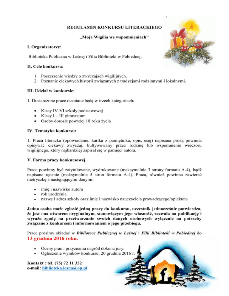REGULAMIN KONKURSU LITERACKIEGO „Moja Wigilia we wspomnieniach” I. Organizatorzy: Biblioteka Publiczna w Leśnej i Filia Biblioteki w Pobiednej. II. Cele konkursu: 1. Poszerzenie wiedzy o zwyczajach wigilijnych. 2. Poznanie ciekawych historii związanych z tradycjami rodzinnymi i lokalnymi. III. Udział w konkursie: 1. Dostarczone prace oceniane będą w trzech kategoriach: Klasy IV-VI szkoły podstawowej Klasy I – III gimnazjum Osoby dorosłe powyżej 18 roku życia IV. Tematyka konkursu: 1. Praca literacka (opowiadanie, kartka z pamiętnika, opis, esej) napisana prozą powinna opisywać ciekawy zwyczaj, kultywowany przez rodzinę lub wspomnienie wieczoru wigilijnego, który najbardziej zapisał się w pamięci autora. V. Forma pracy konkursowej. Prace powinny być zatytułowane, wydrukowane (maksymalnie 3 strony formatu A-4), bądź napisane ręcznie (maksymalnie 5 stron formatu A-4). Praca, również powinna zawierać metryczkę z następującymi danymi: imię i nazwisko autora rok urodzenia nazwę i adres szkoły oraz imię i nazwisko nauczyciela prowadzącego/opiekuna Jedna osoba może zgłosić jedną pracę do konkursu, uczestnik jednocześnie potwierdza, że jest ona utworem oryginalnym, stanowiącym jego własność, zezwala na publikację i wyraża zgodę na przetwarzanie swoich danych osobowych wyłącznie na potrzeby związane z konkursem i informowaniem o jego przebiegu. Prace prosimy składać w Bibliotece Publicznej w Leśnej i Filii Biblioteki w Pobiednej do 13 grudnia 2016 roku. Oceny prac i przyznania nagród dokona jury. Ogłoszenie wyników konkursu: 20 grudnia 2016 r. Kontakt : tel. (75) 72 11 332 e-mail: [email protected]