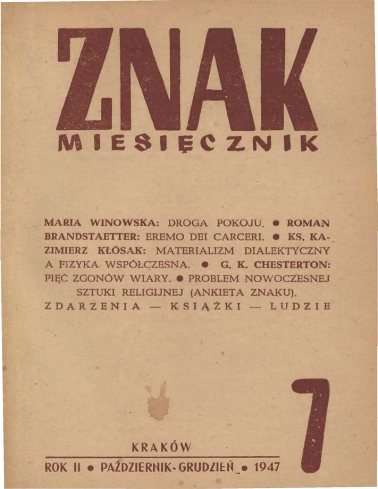 MIESI5eZNIK MARIA WINOWSKA: DROGA POKOJU. • ROMAN BRANOSTAETIER: EREMO DEl CARCER!. • KS. KA ZIMIERZ KtOSAK: MATERIALIZM DIALEKTYCZ:N"Y A FIZYKA WSPOI:.GZESNA. • G. K. CHESTERTON: Pll~C ZGONOW \VIARY. • PROBLEM NOWOCZESNEJ SZTUKI RELIGIJNEJ (ANKIETA ZNAKU). ZDARZENIA KSIAZKI LUDZIE KRAKOW ROK II • PAIOZIERHIK- GRUOlIU~ • 1947 REDAGUJE ZESPOI:.