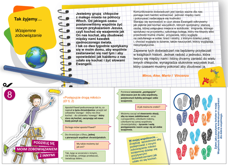 Tak żyjemy… Wzajemne zobowiązanie Jesteśmy grupą chłopców z małego miasta na północy Włoch. Od jakiegoś czasu postanowiliśmy wspólnie żyć nowym przykazaniem Jezusa, czyli kochać się wzajemnie jak On nas kochał, aby zbudować między nami kawałek zjednoczonego świata. I tak co dwa tygodnie spotykamy się w moim domu, aby wspólnie zastanawiać się nad tym i aby opowiedzieć jak każdemu z nas udało się kochać i żyć słowami Ewangelii. Komunikowanie doświadczeń jest bardzo ważne dla nas: pomaga nam bardzo wzmacniać jedność między nami i pokonywać nadarzające się trudności. Starając się wprowadzić w czyn słowa Ewangelii odkrywamy jak pięknie jest kochać wszystkich, których spotykamy: starszą osobę, której ustępujesz miejsca w autobusie; imigranta, którego spotykasz na przystanku; szkolnego kolegę, który ma kłopoty albo przechodzi trudne chwile; przyjaciela, który wygląda na zadufanego w sobie; braci i siostry, z którymi dzielisz pokój; i, chociaż wygląda to dziwnie, także nauczycieli, którzy wyglądają niesympatycznie. Zapewne tych doświadczeń nie będziemy przytaczali w książkach historii. Jednak radość z jedności, która tworzy się między nami i którą chcemy zanieść do wielu innych chłopców, wynagradza stukrotnie wszystek trud, który czasami musimy pokonać aby zbudować ją. 8 «Postępujcie drogą miłości» (Ef 5, 2) Apostoł Paweł podsumowuje tak to, co napisał o życiu chrześcijanina: przejść od człowieka 'starego' - który nie chce kochać - do człowieka ‘nowego’- który stara się kochać, zaczynając od nowa kiedy pomyli się. Do kogo mówi apostoł Paweł? Do chrześcijan z Efezu, jednej z pierwszych wspólnot chrześcijańskich. MOIM ZOBOWIĄZANIEM My także możemy żyć jak oni? Tak, żyjąc w szczerości z innymi, nie kradnąc, umiejąc przebaczać, świadcząc dobro… Ponieważ wezwanie „postępujcie” skierowane jest do całej wspólnoty, pożytecznym byłoby pomagać sobie wzajemnie. A jak można to zrobić? Możemy zacząć od stworzenia okazji, aby na nowo zadeklarować - wraz z przyjaciółmi, członkami rodziny, członkami tej samej wspólnoty chrześcijańskiej – życzenie i wolę postępowania razem ucząc się od siebie wzajemnie. Żyłem jako pozytywny bohater w mojej Wspólnocie dzieląc się konkretnymi uczynkami dla dobra wspólnego. Mirco, Alex, Mario i Vincenzo