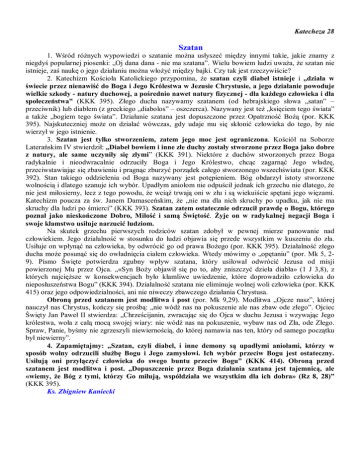 Katecheza 28 Szatan 1. Wśród różnych wypowiedzi o szatanie można usłyszeć między innymi takie, jakie znamy z niegdyś popularnej piosenki: „Oj dana dana - nie ma szatana”. Wielu bowiem ludzi uważa, że szatan nie istnieje, zaś naukę o jego działaniu można włożyć między bajki. Czy tak jest rzeczywiście? 2. Katechizm Kościoła Katolickiego przypomina, że szatan czyli diabeł istnieje i „działa w świecie przez nienawiść do Boga i Jego Królestwa w Jezusie Chrystusie, a jego działanie powoduje wielkie szkody - natury duchowej, a pośrednio nawet natury fizycznej - dla każdego człowieka i dla społeczeństwa” (KKK 395). Złego ducha nazywamy szatanem (od hebrajskiego słowa „satan” – przeciwnik) lub diabłem (z greckiego „diabolos” – oszczerca). Nazywany jest też „księciem tego świata” a także „bogiem tego świata”. Działanie szatana jest dopuszczone przez Opatrzność Bożą (por. KKK 395). Najskuteczniej może on działać wówczas, gdy udaje mu się skłonić człowieka do tego, by nie wierzył w jego istnienie. 3. Szatan jest tylko stworzeniem, zatem jego moc jest ograniczona. Kościół na Soborze Laterańskim IV stwierdził: „Diabeł bowiem i inne złe duchy zostały stworzone przez Boga jako dobre z natury, ale same uczyniły się złymi” (KKK 391). Niektóre z duchów stworzonych przez Boga radykalnie i nieodwracalnie odrzuciły Boga i Jego Królestwo, chcąc zagarnąć Jego władzę, przeciwstawiając się zbawieniu i pragnąc zburzyć porządek całego stworzonego wszechświata (por. KKK 392). Stan takiego oddzielenia od Boga nazywany jest potępieniem. Bóg obdarzył istoty stworzone wolnością i dlatego szanuje ich wybór. Upadłym aniołom nie odpuścił jednak ich grzechu nie dlatego, że nie jest miłosierny, lecz z tego powodu, że wciąż trwają oni w złu i są wiekuiście spętani jego więzami. Katechizm poucza za św. Janem Damasceńskim, że „nie ma dla nich skruchy po upadku, jak nie ma skruchy dla ludzi po śmierci” (KKK 393). Szatan zatem ostatecznie odrzucił prawdę o Bogu, którego poznał jako nieskończone Dobro, Miłość i samą Świętość. Żyje on w radykalnej negacji Boga i swoje kłamstwo usiłuje narzucić ludziom. Na skutek grzechu pierwszych rodziców szatan zdobył w pewnej mierze panowanie nad człowiekiem. Jego działalność w stosunku do ludzi objawia się przede wszystkim w kuszeniu do zła. Usiłuje on wpłynąć na człowieka, by odwrócić go od prawa Bożego (por. KKK 395). Działalność złego ducha może posunąć się do owładnięcia ciałem człowieka. Wtedy mówimy o „opętaniu” (por. Mk 5, 29). Pismo Święte potwierdza zgubny wpływ szatana, który usiłował odwrócić Jezusa od misji powierzonej Mu przez Ojca. „«Syn Boży objawił się po to, aby zniszczyć dzieła diabła» (1 J 3,8), z których najcięższe w konsekwencjach było kłamliwe uwiedzenie, które doprowadziło człowieka do nieposłuszeństwa Bogu” (KKK 394). Działalność szatana nie eliminuje wolnej woli człowieka (por. KKK 415) oraz jego odpowiedzialności, ani nie niweczy zbawczego działania Chrystusa. Obroną przed szatanem jest modlitwa i post (por. Mk 9,29). Modlitwa „Ojcze nasz”, której nauczył nas Chrystus, kończy się prośbą: „nie wódź nas na pokuszenie ale nas zbaw ode złego”. Ojciec Święty Jan Paweł II stwierdza: „Chrześcijanin, zwracając się do Ojca w duchu Jezusa i wzywając Jego królestwa, woła z całą mocą swojej wiary: nie wódź nas na pokuszenie, wybaw nas od Zła, ode Złego. Spraw, Panie, byśmy nie zgrzeszyli niewiernością, do której namawia nas ten, który od samego początku był niewierny”. 4. Zapamiętajmy: „Szatan, czyli diabeł, i inne demony są upadłymi aniołami, którzy w sposób wolny odrzucili służbę Bogu i Jego zamysłowi. Ich wybór przeciw Bogu jest ostateczny. Usiłują oni przyłączyć człowieka do swego buntu przeciw Bogu” (KKK 414). Obroną przed szatanem jest modlitwa i post. „Dopuszczenie przez Boga działania szatana jest tajemnicą, ale «wiemy, że Bóg z tymi, którzy Go miłują, współdziała we wszystkim dla ich dobra» (Rz 8, 28)” (KKK 395). Ks. Zbigniew Kaniecki