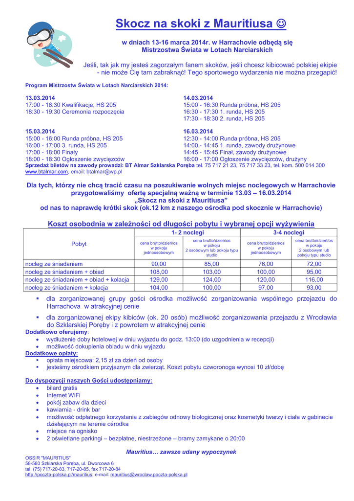 Skocz na skoki z Mauritiusa w dniach 13-16 marca 2014r. w Harrachovie odbędą się Mistrzostwa Świata w Lotach Narciarskich Jeśli, tak jak my jesteś zagorzałym fanem skoków, jeśli chcesz kibicować polskiej ekipie - nie może Cię tam zabraknąć! Tego sportowego wydarzenia nie można przegapić! Program Mistrzostw Świata w Lotach Narciarskich 2014: 13.03.2014 17:00 - 18:30 Kwalifikacje, HS 205 18:30 - 19:30 Ceremonia rozpoczęcia 14.03.2014 15:00 - 16:30 Runda próbna, HS 205 16:30 - 17:30 1. runda, HS 205 17:30 - 18:30 2. runda, HS 205 15.03.2014 15:00 - 16:00 Runda próbna, HS 205 16:00 - 17:00 3. runda, HS 205 17:00 - 18:00 Finały 18:00 - 18:30 Ogłoszenie zwycięzców 16.03.2014 12:30 - 14:00 Runda próbna, HS 205 14:00 - 14:45 1. runda, zawody drużynowe 14:45 - 15:45 Finał, zawody drużynowe 16:00 - 17:00 Ogłoszenie zwycięzców, drużyny Sprzedaż biletów na zawody prowadzi: BT Almar Szklarska Poręba tel. 75 717 21 23, 75 717 33 23, tel. kom. 500 014 300 www.btalmar.com, email: [email protected] Dla tych, którzy nie chcą tracić czasu na poszukiwanie wolnych miejsc noclegowych w Harrachovie przygotowaliśmy ofertę specjalną ważną w terminie 13.03 – 16.03.2014 „Skocz na skoki z Mauritiusa” od nas to naprawdę krótki skok (ok.12 km z naszego ośrodka pod skocznie w Harrachovie) Koszt osobodnia w zależności od długości pobytu i wybranej opcji wyżywienia 1- 2 noclegi Pobyt nocleg ze śniadaniem nocleg ze śniadaniem + obiad nocleg ze śniadaniem + obiad + kolacja nocleg ze śniadaniem + kolacja 3-4 noclegi cena brutto/dzień/os w pokoju jednoosobowym cena brutto/dzień/os w pokoju 2 osobowym lub pokoju typu studio cena brutto/dzień/os w pokoju jednoosobowym cena brutto/dzień/os w pokoju 2 osobowym lub pokoju typu studio 90,00 108,00 129,00 104,00 85,00 103,00 124,00 100,00 76,00 100,00 120,00 97,00 72,00 95,00 116,00 93,00 dla zorganizowanej grupy gości ośrodka możliwość zorganizowania wspólnego przejazdu do Harrachova w atrakcyjnej cenie dla zorganizowanej ekipy kibiców (ok. 20 osób) możliwość zorganizowania przejazdu z Wrocławia do Szklarskiej Poręby i z powrotem w atrakcyjnej cenie Dodatkowo oferujemy: wydłużenie doby hotelowej w dniu wyjazdu do godz. 13:00 (do uzgodnienia w recepcji) możliwość dokupienia obiadu w dniu wyjazdu Dodatkowe opłaty: opłata miejscowa: 2,15 zł za dzień od osoby jesteśmy ośrodkiem przyjaznym dla zwierząt. Koszt pobytu czworonoga wynosi 10 zł/dobę Do dyspozycji naszych Gości udostępniamy: bilard gratis Internet WiFi pokój zabaw dla dzieci kawiarnia - drink bar możliwość odpłatnego korzystania z zabiegów odnowy biologicznej oraz kosmetyki twarzy i ciała w gabinecie działającym na terenie ośrodka miejsce na ognisko 2 oświetlane parkingi – bezpłatne, niestrzeżone – bramy zamykane o 20:00 Mauritius… zawsze udany wypoczynek OSSiR "MAURITIUS" 58-580 Szklarska Poręba, ul. Dworcowa 6 tel. (75) 717-20-83, 717-20-85, fax 717-20-84 http://poczta-polska.pl/mauritius; e-mail: [email protected]