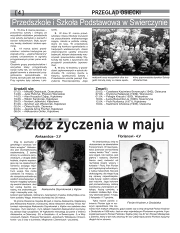 [4] PRZEGLĄD OSIECKI Przedszkole i Szkoła Podstawowa w Świerczynie 1. W dniu 8 marca panowie – pracownicy szkoły i chłopcy ze wszystkich oddziałów, przedszkola oraz szkoły pamiętali o paniach i swoich koleżankach. Były życzenia, kwiaty, słodkości i drobne upominki. 2. 19 marca dzieci przedszkolne i szkolne tradycyjnie pożegnały zimę – „piękne Marzanny” zostały unicestwione w ognisku przygotowanym przez pana woźnego. Obydwie grupy przedszkolaków i wszystkie klasy przygotowały swoje kukły tak, że korowód wyglądał barwnie a staranność przygotowania spowodowała, że trochę żal było palić tak ładne lale. Przy ognisku były zabawy i pio- senki. 3. W dniu 31 marca przedszkolacy i klasy młodsze wyruszyli na poszukiwanie wielkanocnego zająca, młodsi w pobliżu szkoły, starsi do lasu. W przedszkolu odbył się konkurs opowiadania o tradycjach wielkanocnych, dzieci własnoręcznie upiekły smaczne babeczki, którymi obdarowały nauczycieli i pracowników szkoły. Wykonały też kartki z życzeniami dla przyjaciół przedszkola (sponsorów). 4. W dniu 12 kwietnia, w przeddzień zaplanowanych w szkole obchodów 70. rocznicy mordu w Katyniu, społeczność Szkoły i Przedszkola uczciła pamięć Prezydenta Rzeczpospolitej, Jego Urodzili się: 07.03. – Mikołaj Olejniczak, Drzeczkowo 14.03. – Julia Pietrzyk, Popowo Wonieskie 14.03. – Alan Krzysztof Zając, Kąkolewo 19.03. – Wiktor Karolczak, Kąkolewo 29.03. – Norbert Jabłoński, Kąkolewo 31.03. – Szymon Jan Wieczorek, Kąkolewo 02.04. – Oliwia Koźlik, Ziemnice 04.04. – Jagoda Anna Fischer, Kąkolewo 08.04. – Aleksandra Girtler, Kąkolewo małżonki oraz wszystkich ofiar tragedii minutą ciszy w czasie apelu, który poprowadziła dyrektor Szkoły Wioletta Klak. Zmarli: 20.03. – Czesława Kazimiera Borowczyk (1943), Osieczna 27.03. – Krystyna Ratajczak (1939), Wojnowice 01.04. – Pelagia Krauze (1920), Wojnowice 10.04. – Łucja Bogumiła Lis (1926), Świerczyna 12.04. – Piotr Runowicz (1971), Kąkolewo 13.04. – Kazimierz Cholewa (1935), Osieczna ZłóŜ Ŝyczenia w maju Aleksandrze - 3.V Imię to pochodzi z greckiego i oznacza "odbiera wrogów". Aleksandra jest skomplikowaną osobowością. Z jednej strony to urodzona przywódczyni, z drugiej słaba kobieta, chętnie wspierająca się na opiekuńczym ramieniu swojego mężczyzny. Lubi być w centrum uwagi. Nie może usiedzieć na miejscu, a do szczęścia potrzeba jej wielkich przedsięwzięć, w których mogłaby wykazać się swoimi talentami. Jest też osobą bardzo zaAleksandra Szymkowiak z Kątów radną, ma znakomitą pamięć i niezwykły urok. Jej kolorem jest niebieski, rośliną len, zwierzęciem myszka, liczbą trójka a znakiem zodiaku Waga. Imieniny obchodzi też 20 marca. W gminie Osieczna mieszka 66 pań o imieniu Aleksandra. Najstarszą jest Aleksandra Kraśner z Osiecznej, która niebawem skończy 78 lat. Natomiast najmniejsza Aleksandra Szymkowiak z Kątów ma zaledwie dwa miesiące. I tym starszym, i tym całkiem maleńkim Aleksandrom życzymy, by zawsze były szczęśliwe. W Kąkolewie mieszkają 22 panie o imieniu Aleksandra, w Osiecznej - 20, w Grodzisku - 6, w Świerczynie - 3, w Wojnowicach, Kątach, Popowie Wonieskim, Jeziorkach, Witosławiu i Drzeczkowie - po 2 oraz w Łoniewie, Miąskowie i Ziemnicach - po jednej. Florianowi - 4.V W średniowieczu imię to utożsamiano ze słowiańskim Tworzymirem. W rzeczywistości pochodzi od łacińskiej nazwy kwiatu "flos" i oznacza kogoś, kto kwitnie, jest piękny i radosny. Słowem bierze swój rodowód od rzymskiej bogini wiosny i kwiatów - Flory. Pan Florian jest mężczyzną kulturalnym, z nutką melancholii. Nie jest drobiazgowy, dla niego liczą się sprawy najważniejsze. Całą duszą i ciałem oddany jest rodzinie. Jego kolorem jest pomarańczowy, rośliną wiciokrzew, zwierzęciem antylopa, liczbą czwórka, a znakiem zodiaku Byk. Imieniny obchodzi także: 7 maja, 5 listopada i 17 grudnia. Tylko trzech panów o Florian Kraśner z Grodziska imieniu Florian żyje w naszym sąsiedztwie. Nie ma wśród nich małych chłopców, gdyż ostatni raz to imię otrzymał Florian Kraśner z Grodziska w 1958 roku. Jest on więc najmłodszym Florianem w gminie. A pozostali panowie to Florian Pietrzak z Kątów, który ma 57 lat i Florian Mikołajczak z Ziemnic, który w tym roku skończy 61 lat. Całej trójce panów Florków życzymy długich lat w zdrowiu.