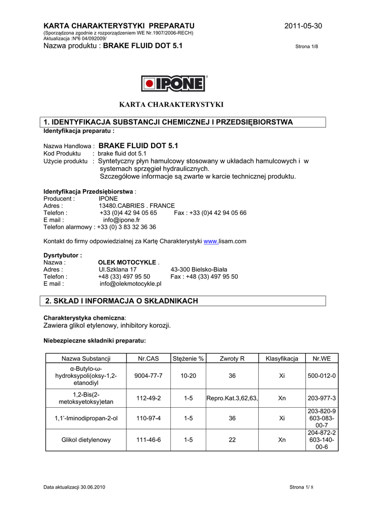 KARTA CHARAKTERYSTYKI PREPARATU 2011-05-30 (Sporządzona zgodnie z rozporządzeniem WE Nr.1907/2006-RECH) Aktualizacja :Nº6 04/092009/ Nazwa produktu : BRAKE FLUID DOT 5.1 Strona 1/8 KARTA CHARAKTERYSTYKI 1. IDENTYFIKACJA SUBSTANCJI CHEMICZNEJ I PRZEDSIĘBIORSTWA Identyfikacja preparatu : Nazwa Handlowa : BRAKE FLUID DOT 5.1 Kod Produktu : brake fluid dot 5.1 Użycie produktu : Syntetyczny płyn hamulcowy stosowany w układach hamulcowych i w systemach sprzęgieł hydraulicznych. Szczegółowe informacje są zwarte w karcie technicznej produktu. Identyfikacja Przedsiębiorstwa : Producent : IPONE Adres : 13480.CABRIES . FRANCE Telefon : +33 (0)4 42 94 05 65 Fax : +33 (0)4 42 94 05 66 E mail : [email protected] Telefon alarmowy : +33 (0) 3 83 32 36 36 Kontakt do firmy odpowiedzialnej za Kartę Charakterystyki www.lisam.com Dysrtybutor : Nazwa : Adres : Telefon : E mail : OLEK MOTOCYKLE . Ul.Szklana 17 +48 (33) 497 95 50 [email protected] 43-300 Bielsko-Biała Fax : +48 (33) 497 95 50 2. SKŁAD I INFORMACJA O SKŁADNIKACH Charakterystyka chemiczna: Zawiera glikol etylenowy, inhibitory korozji. Niebezpieczne składniki preparatu: Nazwa Substancji Nr.CAS Stężenie % Zwroty R Klasyfikacja Nr.WE α-Butylo-ωhydroksypoli(oksy-1,2etanodiyl 9004-77-7 10-20 36 Xi 500-012-0 1,2-Bis(2metoksyetoksy)etan 112-49-2 1-5 Repro.Kat.3,62,63, Xn 203-977-3 1,1’-Iminodipropan-2-ol 110-97-4 1-5 36 Xi Glikol dietylenowy 111-46-6 1-5 22 Xn Data aktualizacji 30.06.2010 203-820-9 603-08300-7 204-872-2 603-14000-6 Strona 1/ 8 KARTA CHARAKTERYSTYKI PREPARATU 2011-05-30 (Sporządzona zgodnie z rozporządzeniem WE Nr.1907/2006-RECH) Aktualizacja :Nº6 04/092009/ Nazwa produktu : BRAKE FLUID DOT 5.1 Strona 2/8 Wyjaśnienie symboli i zwrotów: Xn – produkt szkodliwy; Xi – produkt drażniący; 22 – działa szkodliwie po połknięciu; 36 – działa drażniąco na oczy; 62 – możliwe ryzyko upośledzenia płodności; 63 – możliwe ryzyko szkodliwego działania na dziecko w łonie matki 3. IDENTYFIKACJA ZAGROŻEŃ Produkt nie podlega klasyfikacji jako niebezpieczny 4. PIERWSZA POMOC Drogi oddechowe : Wynieść poszkodowanego na świeże powietrze. Jeżeli objawy narażenia wystąpią,skontaktować się z lekarzem. Kontakt z oczami: Natychmiast płukać dużą ilością wody, przez co najmniej 15 minut. Zwrócić się pomoc medyczną w przypadku wystąpienia objawów podrażnienia. Kontakt ze skórą: Zanieczyszczoną skórę natychmiast przemyć dużą ilością wody. Zdjąć zanieczyszczoną odzież i buty. W przypadku wystąpienia objawów podrażnienia, skontaktować się z lekarzem. Zanieczyszczoną odzież i buty oczyścić przed ponownym użyciem. Połknięcie: W przypadku połknięcia dużej dawki preparatu natychmiast wezwać pomoc medyczną. Nie wywoływać wymiotów bez konsultacji z lekarzem. Jeśli poszkodowany jest nieprzytomny nie podawać nic do picia. Wskazówki ogólne: Wskazówki dla lekarza: postępowanie objawowe. 5. POSTEPOWANIE W RAZIE POŻARU Odpowiednie środki gaśnicze: Woda – rozproszone prądy wodne, dwutlenek węgla, proszki gaśnicze, gaśnice pianowe. Środki gaśnicze, których nie wolno używać ze względów bezpieczeństwa: Nie stosować zwartych strumieni wody. Szczególne zagrożenia: Nieznane. Niebezpieczne produkty rozkładu: Możliwe jest powstanie ditlenku węgla (CO2), tlenku węgla (CO), tlenki azotu (NO, NO2), tlenków metali. Specjalne wyposażenie ochronne dla strażaków: Podczas pożaru mogą powstawać substancje szkodliwe dla zdrowia. Nałożyć odzież ochronną gazoszczelną i aparat izolujący drogi oddechowe (aparat tlenowy skompletowany z maską). Data aktualizacji 30.06.2010 Strona 2/ 8 KARTA CHARAKTERYSTYKI PREPARATU 2011-05-30 (Sporządzona zgodnie z rozporządzeniem WE Nr.1907/2006-RECH) Aktualizacja :Nº6 04/092009/ Nazwa produktu : BRAKE FLUID DOT 5.1 Strona 3/8 Inne informacje: Woda skażona środkami gaśniczymi musi być usuwana jako odpad niebezpieczny. Zanieczyszczoną wodę nie wlewać do kanalizacji. Zawiadomić otoczenie o pożarze. Usunąć z obszaru zagrożenia wszystkie osoby niebiorące udziału w likwidowaniu pożaru. Powiadomić Państwową Straż Pożarną, a w razie konieczności także Policję Państwową, najbliższe władze terenowe i najbliższą jednostkę Ratownictwa Chemicznego. 6. POSTĘPOWANIE W PRZYPADKU NIEZAMIERZONEGO UWOLNIENIA DO ŚRODOWISKA Indywidualne środki ostrożności: Środki ochrony indywidualnej jak podano w punkcie 8. Środki ostrożności w zakresie ochrony środowiska: W razie awarii nie dopuszczać do zrzutów do środowiska. Zabezpieczyć produkt przed przedostaniem się do kanałów ściekowych, wód powierzchniowych i gruntowych oraz do gleby. Próbować zebrać jak tylko to możliwe, do odpowiednich pojemników celem dalszej utylizacji. Metody oczyszczania: Czynności mogą być podejmowane tylko przy pełnym zabezpieczeniu – gogle chroniące przed kroplami cieczy, ubranie ochronne, buty, rękawice. Jeżeli to możliwe, zlikwidować wyciek (zamknąć dopływ cieczy, uszczelnić, uszkodzone opakowanie umieścić w szczelnym opakowaniu ochronnym); w razie dużego wycieku miejsce gromadzenia się cieczy obwałować, zebraną ciecz odpompować; małe ilości rozlanej cieczy przysypać niepalnym materiałem chłonnym, zebrać do zamykanego pojemnika; zanieczyszczoną powierzchnię spłukać wodą. Usuwać jako odpad niebezpieczny. 7. OBCHODZENIE SIĘ Z PRODUKTEM I MAGAZYNOWANIE Obchodzenie się z produktem: Myć ręce zawsze po kontakcie z preparatem i przed jedzeniem. Stanowiska pracy powinny być wyposażone w prysznic i urządzenie do płukania oczu. Zabezpieczenia przed pożarem i wybuchem: Nie dotyczy. Magazynowanie: Opakowania, gdy nie są używane, przechowywać zamknięte. Przechowywać w miejscach chłodnych, dobrze wentylowanych. Inne informacje: Przechowywać zawsze w oryginalnych opakowaniach. Nie używać zanieczyszczonych, pustych opakowań do innych celów. Data aktualizacji 30.06.2010 S