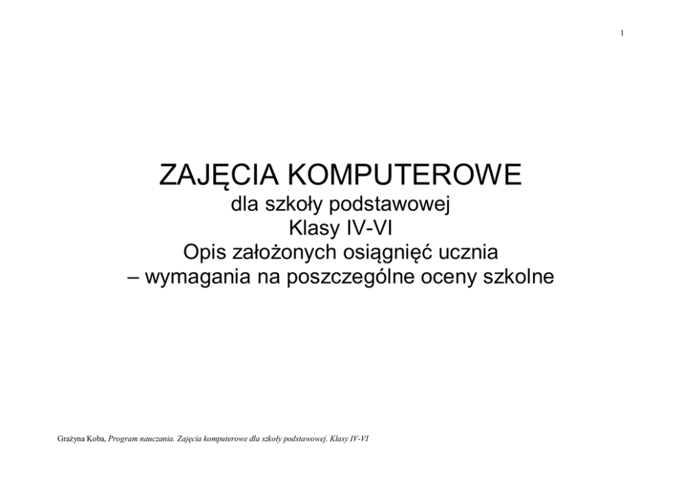 1 ZAJĘCIA KOMPUTEROWE dla szkoły podstawowej Klasy IV-VI Opis założonych osiągnięć ucznia – wymagania na poszczególne oceny szkolne Grażyna Koba, Program nauczania. Zajęcia komputerowe dla szkoły podstawowej. Klasy IV-VI 2 1. Podstawowe zasady posługiwania się komputerem i programem komputerowym Osiągnięcia wychowawcze Uczeń: 1. przestrzega zasad bezpiecznej pracy przy komputerze, 2. jest odpowiedzialny za ogólny porządek na stanowisku komputerowym, 3. stosuje zasady zdrowej pracy przy komputerze, w tym planuje przerwy w pracy i rekreację na świeżym powietrzu, 4. przestrzega zasad korzystania z licencjonowanego oprogramowania, 5. potrafi uszanować pracę innych, m.in. nie usuwa plików i nie kopiuje ich bez zgody autora lub nauczyciela, 6. potrafi z zaangażowaniem argumentować zagrożenia wynikające z korzystania z niewłaściwych gier komputerowych, m.in. nie korzysta z gier zawierających elementy przemocy i okrucieństwa oraz nie nakłania kolegów do korzystania z takich gier. 2 dba o porządek na stanowisku komputerowym posługuje się myszą i klawiaturą; określa typ komputera (komputerów) w pracowni komputerowej (np. IBM, Macintosh); z pomocą nauczyciela poprawnie loguje się do szkolnej sieci komputerowej i kończy pracę z komputerem Komputer i praca w sieci komputerowej 3 4 5 wymienia podstawowe wymienia zasady zachowania omawia zasady zachowania zasady zachowania się się w pracowni komputerowej się w pracowni komputerowej w pracowni komputerowej i przestrzega ich i przestrzega ich i przestrzega ich rozróżnia elementy zestawu omawia ogólne omawia przeznaczenie komputerowego; przeznaczenie elementów elementów zestawu podaje ich przeznaczenie; zestawu komputerowego; komputerowego; potrafi samodzielnie wymienia elementy zestawu wie, czym jest pamięć i poprawnie zalogować się do komputerowego i nośniki operacyjna; szkolnej sieci komputerowej pamięci masowej; wie, czym jest system i wylogować się wie, na czym polega operacyjny; uruchomienie komputera zna jednostki pamięci; i programu komputerowego omawia procesy zachodzące podczas uruchamiania programu komputerowego; wymienia cechy środowiska graficznego; wie, czym jest system operacyjny Grażyna Koba, Program nauczania. Zajęcia komputerowe dla szkoły podstawowej. Klasy IV-VI 6 omawia szczegółowo zasady zachowania się w pracowni komputerowej i przestrzega ich omawia wewnętrzną budowę komputera – rodzaje pamięci; omawia nośniki pamięci masowej ze względu na ich pojemność i przeznaczenie; omawia procesy zachodzące w komputerze podczas jego uruchamiania; wymienia funkcje systemu operacyjnego; omawia cechy środowiska graficznego; omawia funkcje systemu operacyjnego 3 Program komputerowy 2 3 4 uruchamia programy uruchamia programy omawia przeznaczenie korzystając z ikon na pulpicie; z wykazu programów w menu elementów okna programu potrafi poprawnie zakończyć Start; komputerowego; pracę programu; nazywa elementy okna wykonuje operacje na oknie rozróżnia elementy okna programu; programu; programu; wykonuje niektóre operacje pod kierunkiem nauczyciela pod kierunkiem nauczyciela na oknie programu; pracuje z dwoma wykonuje operacje w oknie według wskazówek jednocześnie uruchomionymi programu; nauczyciela wykonuje oknami programów; jest świadom istnienia operacje w oknie programu; samodzielnie wykonuje wirusów komputerowych potrafi omówić ogólne operacje w oknie programu; niebezpieczeństwa związane wymienia sposoby ochrony z zarażeniem wirusem przed wirusami komputerowym komputerowymi; stosuje niektóre z nich 2 wymienia przynajmniej trzy zastosowania komputera podaje przykład urządzenia ze swojego otoczenia, opartego na technice komputerowej 5 wie, że nie wolno bezprawnie kopiować programów i kupować ich nielegalnych kopii; wybraną metodą samodzielnie kopiuje pliki na zewnętrzny nośnik danych; samodzielnie pracuje z dwoma jednocześnie uruchomionymi oknami programów; sprawnie korzysta z menu kontekstowego; zna podstawowe skróty klawiaturowe; wie, czym są wirusy komputerowe; potrafi ogólnie omówić ich działanie Zastosowania komputera i programów komputerowych 3 4 5 podaje przykłady wskazuje zastosowania wskazuje użyteczność zastosowania komputera komputera w różnych zastosowania komputera do w szkole i w domu dziedzinach życia usprawnienia uczenia się; korzysta z programów edukacyjnych podaje przykłady urządzeń ze omawia działanie podaje przykłady swojego otoczenia, opartych przykładowych urządzeń ze zastosowania komputera na technice komputerowej swojego otoczenia, opartych w domu; na technice komputerowej wymienia zagrożenia wynikające z korzystania z niewłaściwych gier komputerowych Grażyna Koba, Program nauczania. Zajęcia komputerowe dla szkoły podstawowej. Klasy IV-VI 6 instaluje programy i zna zasady odinstalowywania ich; zna podstawowe rodzaje licencji komputerowych i zasady korzystania z nich; wskazaną metodą samodzielnie kopiuje pliki na zewnętrzne nośniki danych; stosuje skróty klawiaturowe; potrafi wskazać podobieństwa i różnice w budowie różnych okien programów; stosuje sposoby ochrony przed wirusami komputerowymi, np. używa programu antywirusowego dla dysku twardego i innych nośników danych 6 korzystając z dodatkowych źródeł, odszukuje informacje na temat zastosowań komputera omawia historię komputerów; wyszukuje w różnych źródłach, w tym w Internecie, informacje na temat najnowszych zastosowań komputerów; omawia zagrożenia wynikające z korzystania z niewłaściwych gier komputerowych 4 2 pod kierunkiem nauczyciela zapisuje dokument w pliku, w folderze domyślnym 2 z pomocą nauczyciela odszukuje zapisane pliki i otwiera je Dokument komputerowy 3 4 pod kierunkiem nauczyciela samodzielnie zapisuje zapisuje dokument w pliku we dokument w pliku w wybranej wskazanej lokalizacji; lokalizacji; pod kierunkiem nauczyciela pod kierunkiem nauczyciela potrafi wydrukować dokument z