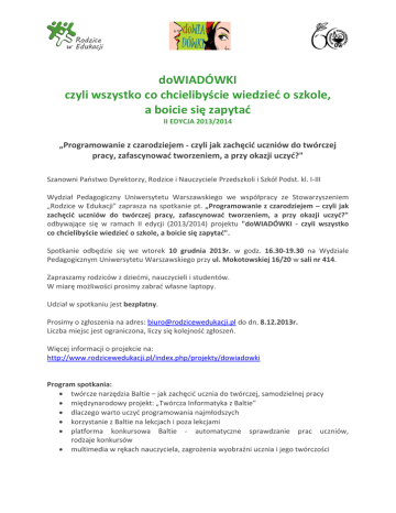 doWIADÓWKI czyli wszystko co chcielibyście wiedzieć o szkole, a boicie się zapytać II EDYCJA 2013/2014 „Programowanie z czarodziejem - czyli jak zachęcić uczniów do twórczej pracy, zafascynować tworzeniem, a przy okazji uczyć?" Szanowni Państwo Dyrektorzy, Rodzice i Nauczyciele Przedszkoli i Szkół Podst. kl. I-III Wydział Pedagogiczny Uniwersytetu Warszawskiego we współpracy ze Stowarzyszeniem „Rodzice w Edukacji" zaprasza na spotkanie pt. „Programowanie z czarodziejem – czyli jak zachęcić uczniów do twórczej pracy, zafascynować tworzeniem, a przy okazji uczyć?" odbywające się w ramach II edycji (2013/2014) projektu "doWIADÓWKI - czyli wszystko co chcielibyście wiedzieć o szkole, a boicie się zapytać". Spotkanie odbędzie się we wtorek 10 grudnia 2013r. w godz. 16.30-19.30 na Wydziale Pedagogicznym Uniwersytetu Warszawskiego przy ul. Mokotowskiej 16/20 w sali nr 414. Zapraszamy rodziców z dziećmi, nauczycieli i studentów. W miarę możliwości prosimy zabrać własne laptopy. Udział w spotkaniu jest bezpłatny. Prosimy o zgłoszenia na adres: [email protected] do dn. 8.12.2013r. Liczba miejsc jest ograniczona, liczy się kolejność zgłoszeń. Więcej informacji o projekcie na: http://www.rodzicewedukacji.pl/index.php/projekty/dowiadowki Program spotkania: twórcze narzędzia Baltie – jak zachęcić ucznia do twórczej, samodzielnej pracy międzynarodowy projekt: „Twórcza Informatyka z Baltie” dlaczego warto uczyć programowania najmłodszych korzystanie z Baltie na lekcjach i poza lekcjami platforma konkursowa Baltie - automatyczne sprawdzanie prac uczniów, rodzaje konkursów multimedia w rękach nauczyciela, zagrożenia wyobraźni ucznia i jego twórczości Korzyści dla uczestników: na spotkaniu uczestnicy dowiedzą się, jak w ciągu 2 godzin lekcyjnych nauczyć uczniów podstawy programowania i zachęcić ich do samodzielnej pracy programistycznej w domu wszystkie szkoły uczestniczące na spotkaniu otrzymają niebieską licencję Baltie dla całej szkoły i dla wszystkich uczniów w domu ważną do 30.10.2014r. Więcej informacji: www.baltie.pl - strona Baltie www.baltie.net - strona platformy konkursowej Baltie www.tib.sk/pl - strona projektu „Twórcza Informatyka z Baltie“ Zapraszamy nauczycieli i rodziców do przyjścia z dziećmi wówczas zrobimy lekcję pokazową, którą nauczyciele/rodzice będą mogli powtórzyć w swojej szkole/domu i sprawdzić sami, że ta metodyka działa. To jest dla wszystkich największa korzyść z tego spotkania. Dlatego zapraszamy Państwa z dziećmi i laptopami. Zachęcamy również do obejrzenia lekcji pokazowej z uczniami w Dąbrowie Górniczej: http://www.kuratorium.katowice.pl/?page=EventPage&eventId=312 na uczelni