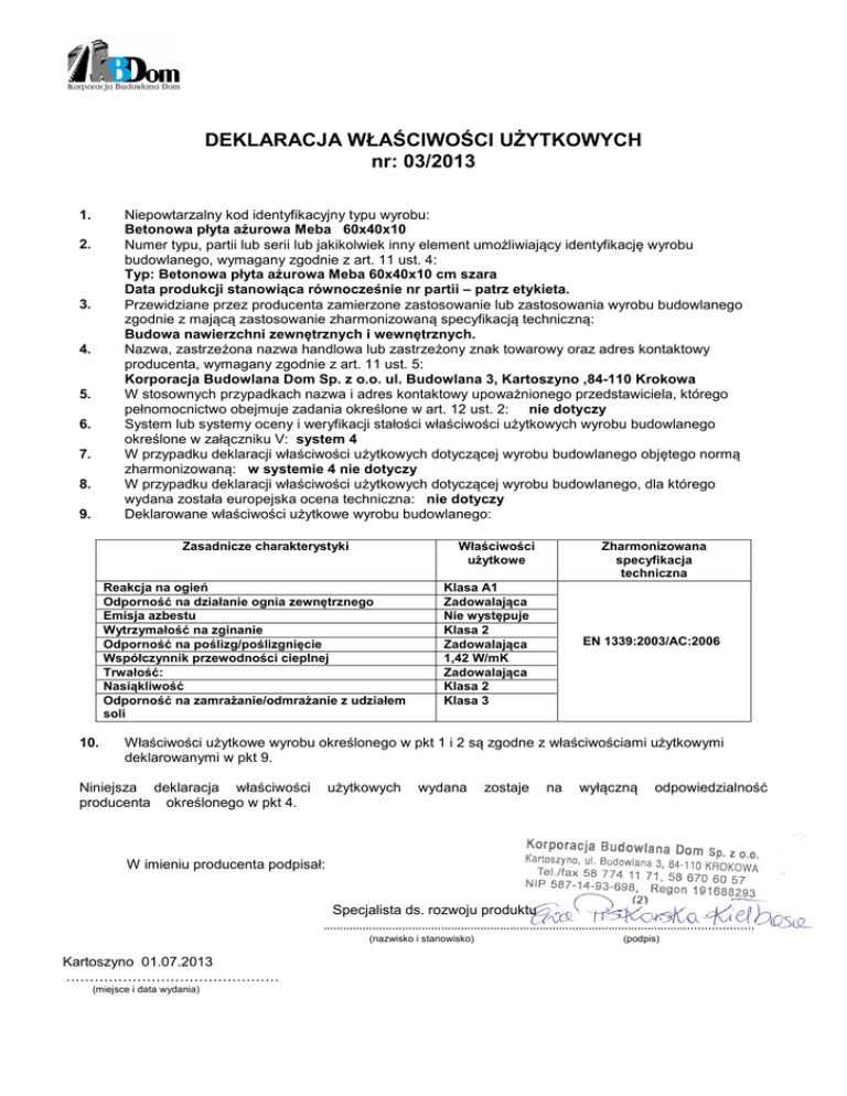 DEKLARACJA WŁAŚCIWOŚCI UŻYTKOWYCH nr: 03/2013 1. Niepowtarzalny kod identyfikacyjny typu wyrobu: Betonowa płyta ażurowa Meba 60x40x10 Numer typu, partii lub serii lub jakikolwiek inny element umożliwiający identyfikację wyrobu budowlanego, wymagany zgodnie z art. 11 ust. 4: Typ: Betonowa płyta ażurowa Meba 60x40x10 cm szara Data produkcji stanowiąca równocześnie nr partii – patrz etykieta. Przewidziane przez producenta zamierzone zastosowanie lub zastosowania wyrobu budowlanego zgodnie z mającą zastosowanie zharmonizowaną specyfikacją techniczną: Budowa nawierzchni zewnętrznych i wewnętrznych. Nazwa, zastrzeżona nazwa handlowa lub zastrzeżony znak towarowy oraz adres kontaktowy producenta, wymagany zgodnie z art. 11 ust. 5: Korporacja Budowlana Dom Sp. z o.o. ul. Budowlana 3, Kartoszyno ,84-110 Krokowa W stosownych przypadkach nazwa i adres kontaktowy upoważnionego przedstawiciela, którego pełnomocnictwo obejmuje zadania określone w art. 12 ust. 2: nie dotyczy System lub systemy oceny i weryfikacji stałości właściwości użytkowych wyrobu budowlanego określone w załączniku V: system 4 W przypadku deklaracji właściwości użytkowych dotyczącej wyrobu budowlanego objętego normą zharmonizowaną: w systemie 4 nie dotyczy W przypadku deklaracji właściwości użytkowych dotyczącej wyrobu budowlanego, dla którego wydana została europejska ocena techniczna: nie dotyczy Deklarowane właściwości użytkowe wyrobu budowlanego: 2. 3. 4. 5. 6. 7. 8. 9. Zasadnicze charakterystyki Właściwości użytkowe Reakcja na ogień Odporność na działanie ognia zewnętrznego Emisja azbestu Wytrzymałość na zginanie Odporność na poślizg/poślizgnięcie Współczynnik przewodności cieplnej Trwałość: Nasiąkliwość Odporność na zamrażanie/odmrażanie z udziałem soli 10. Zharmonizowana specyfikacja techniczna Klasa A1 Zadowalająca Nie występuje Klasa 2 Zadowalająca 1,42 W/mK Zadowalająca Klasa 2 Klasa 3 EN 1339:2003/AC:2006 Właściwości użytkowe wyrobu określonego w pkt 1 i 2 są zgodne z właściwościami użytkowymi deklarowanymi w pkt 9. Niniejsza deklaracja właściwości producenta określonego w pkt 4. użytkowych wydana zostaje na wyłączną odpowiedzialność W imieniu producenta podpisał: Specjalista ds. rozwoju produktu …………………………………………………………………………………………………................... (nazwisko i stanowisko) Kartoszyno 01.07.2013 ……………………………………… (miejsce i data wydania) (podpis)