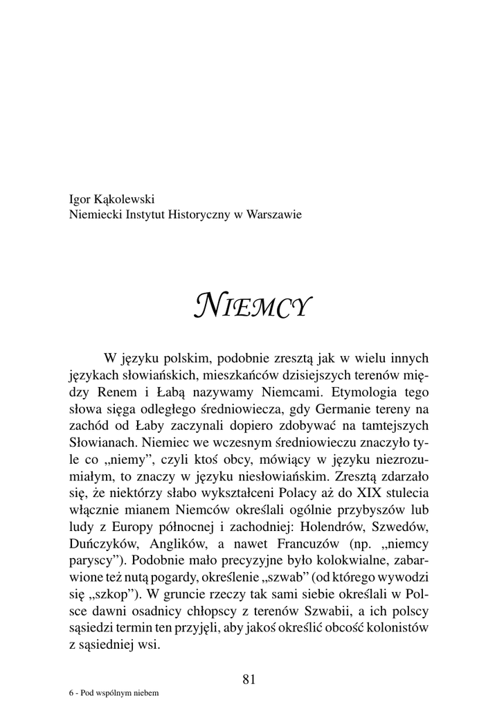 Igor Kąkolewski Niemiecki Instytut Historyczny w Warszawie Niemcy W języku polskim, podobnie zresztą jak w wielu innych językach słowiańskich, mieszkańców dzisiejszych terenów między Renem i Łabą nazywamy Niemcami. Etymologia tego słowa sięga odległego średniowiecza, gdy Germanie tereny na zachód od Łaby zaczynali dopiero zdobywać na tamtejszych Słowianach. Niemiec we wczesnym średniowieczu znaczyło tyle co „niemy”, czyli ktoś obcy, mówiący w języku niezrozumiałym, to znaczy w języku niesłowiańskim. Zresztą zdarzało się, że niektórzy słabo wykształceni Polacy aż do XIX stulecia włącznie mianem Niemców określali ogólnie przybyszów lub ludy z Europy północnej i zachodniej: Holendrów, Szwedów, Duńczyków, Anglików, a nawet Francuzów (np. „niemcy paryscy”). Podobnie mało precyzyjne było kolokwialne, zabarwione też nutą pogardy, określenie „szwab” (od którego wywodzi się „szkop”). W gruncie rzeczy tak sami siebie określali w Polsce dawni osadnicy chłopscy z terenów Szwabii, a ich polscy sąsiedzi termin ten przyjęli, aby jakoś określić obcość kolonistów z sąsiedniej wsi. 81 6 − Pod wspólnym niebem Niemcy Pierwsi Niemcy zaczęli napływać na tereny państwa polskiego i osiedlać się tutaj już w czasach Mieszka I i jego następców. Można ich zaliczyć do trzech grup: niemieckich duchownych przybywających na ziemie polskie w celach chrystianizacyjnych; rycerzy oferujących swe służby nowej dynastii; a także... żon książąt i królów polskich. Wystarczy spojrzeć na statystykę małżeństw tylko tych Piastów, którzy zasiadali na tronie polskim od połowy X do połowy XIV wieku – liczebnie dominowały związki z córkami różnych władców terytorialnych państw niemieckich. Małżeństwa te nie odgrywały zresztą wyłącznie roli politycznej, ale umożliwiały coś, co dziś nazwać można „transferem kulturalnym”. Dzięki nim powstawały pomosty łączące dwór polski z innymi regionami Niemiec, na przykład z odległą Lotaryngią dzięki małżeństwu Mieszka II z córką palatyna reńskiego, Rychezą, która jednak w pamięci historycznej Polaków – ze względu na splot niekorzystnych wypadków politycznych – nie cieszy się dobrą sławą. Natomiast w oczach jej współczesnych uchodziła za jedną z najlepiej wykształRycheza, królowa Polski, żona conych kobiet w ówczesnej Europie. Mieszka II, wg Jana Matejki Poza tym spokrewniła Piastów z domem cesarskim. Dzięki koneksjom rodzinnym Rychezy, w Nadrenii edukację odebrał jej syn i przyszły książę Polski, Kazimierz Odnowiciel, później zaś w oparciu o nadreńsko-lotaryńskich duchownych, których do Polski wysyłał wuj tego władcy, biskup Kolonii Herman, możliwa była odbudowa Kościoła polskiego, zniszczonego w czasie tak zwanej reakcji pogańskiej i czeskiego najazdu w latach 30. XI wieku. Do Polski trafiło wówczas wielu wybitnych duchownych z tej właśnie części Niemiec, na przykład biskup krakowski Aron, 82 Igor Kąkolewski a także benedyktyni do klasztoru w Mogilnie. Duchowni ci wprowadzili na ziemie polskie zaczyn reformy gregoriańskiej, zaszczepili kult kolońskich świętych (Gerona i Leonarda), przywieźli ze sobą cenne księgi (rękopis tyniecki, jedno z najznakomitszych dzieł szkoły kolońskiej z XI wieku) oraz wzorce architektury mozańsko-kolońskiej (kolegiata w Tumie koło Łęczycy, kościół katedralny w Płocku). Ów nadreński wpływ w sferze kultury materialnej mógł być jednak jeszcze bardziej ważki. Niewykluczone bowiem, że Kraków za panowania Kazimierza Odnowiciela był architektoniczną kopią cesarskiego Akwizgranu, który być może na własne oczy wcześniej ujrzał jego dziad Bolesław Chrobry, podróżując u boku swego oficjalnego „przyjaciela”, cesarza Ottona III. Zresztą związki pomiędzy państwem piastowskim a odległą Nadrenią musiały być rzeczywiście trwałe, skoro jeszcze ponad wiek po śmierci Kazimierza Odnowiciela na dworze jego prawnuka Mieszka III działał pochodzący z Nadrenii złotnik Konrad. Zanim zwrócimy uwagę na zwykłych emigrantów z Niemiec, to znaczy chłopów, rzemieślników i kupców, jeszcze jedna uwaga dotycząca koronowanych głów. Otóż na paradoks zakrawa fakt, że dynastia piastowska, która wprowadziła w Polsce chrześcijaństwo, nie doczekała się ani jednego kanonizowanego, czy choćby beatyfikowanego, przedstawiciela rodu – inaczej niż na przykład czescy Przemyślidzi, ruscy Rurykowicze czy węgierscy Arpadowie. Honor pierwszej dynastii polskiej ratuje więc Niemka, św. Jadwiga Śląska, urodzona na zamku Andechs w Bawarii i poślubiona Piastowi śląskiemu, Henrykowi Brodatemu. Jej syn, książę śląski Henryk Pobożny, zdobył sławę, dowodząc zastępami rycerstwa polskiego i niemieckiego (wśród którego znaleźli się członkowie rodów już osiadłych na Śląsku, a także jeszcze lojalni Krzyżacy), ponosząc śmierć w bitwie pod Legnicą w 1241 roku w obronie łacińskiego chrześcijaństwa przed Mongołami. Wnuk Jadwigi, książę Henryk III Biały oraz prawnuk, Henryk IV Probus (zarazem książę 83 Niemcy krakowski i pretendent do korony polskiej, piszący poetyckie utwory po niemiecku) zadomowili na dworze wrocławskim i język środkowo-górnoniemiecki, i modne wówczas niemieckie obyczaje rycerskie, włącznie z tak wysoko cenioną wówczas w Europie poezją dworską minnesingerów. Na marginesie wypada wspomnieć, że zarówno słowo rycerz (niemieckie Ritter), jak i szlachta (od niemieckiego Geschlecht – ród) są zapożyczeniami z języka niemieckiego. Od XIII wieku na Śląsku kultura niemiecka – wspierana nadaniami dla osiedlającego się tu licznie niemieckiego rycerstwa, duchowieństwa, przede wszystkim zaś mieszczaństwa i chłopstwa – zacznie swój zwycięski pochód. Dodatkowo, na skutek skomplikowanego splotu wydarzeń politycznych, losy tej prowincji od XIV stulecia sta