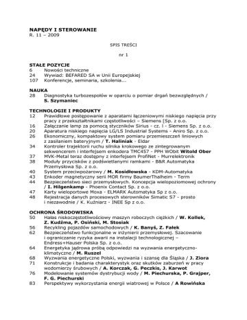NAPĘDY I STEROWANIE R. 11 – 2009 SPIS TREŚCI nr 1 STAŁE POZYCJE 6 Nowości techniczne 24 Wywiad: BEFARED SA w Unii Europejskiej 107 Konferencje, seminaria, szkolenia... NAUKA 28 Diagnostyka turbozespołów w oparciu o pomiar drgań bezwzględnych / S. Szymaniec TECHNOLOGIE I PRODUKTY 12 Prawidłowe postępowanie z aparatami łączeniowymi niskiego napięcia przy pracy z przekształtnikami częstotliwości – Siemens [Sp. z o.o. 16 Załączanie lamp za pomocą styczników Sirius - cz. l - Siemens Sp. z o.o. 20 Aparatura niskiego napięcia LG/LS Industrial Systems - Aniro Sp. z o.o. 26 Ekonomiczny, kompaktowy system pomiaru przemieszczeń liniowych z zasilaniem bateryjnym / T. Haliniak - Eldar 34 Kontroler trajektorii ruchu silnika krokowego ze zintegrowanym sekwencerem i interfejsem enkodera TMC457 - PPH WObit Witold Ober 37 MVK-Metal teraz dostępny z interfejsem ProfiNet - Murrelektronik 38 Moduły przycisków z podświetlanymi ramkami - B&R Automatyka Przemysłowa Sp. z o.o. 40 System przeciwpoŜarowy / M. Kosidłowska - KDM-Automatyka 43 Enkoder magnetyczny serii MOR firmy BaumerThalheim - Term 44 Bezpieczeństwo sieci przemysłowych. Koncepcja wielopoziomowej ochrony / I. Hilgenkamp - Phoenix Contact Sp. z o.o. 47 Karty wieloportowe Moxa - ELMARK Automatyka Sp z o.o. 48 Rejestracja danych procesowych sterowników Simatic S7 - prosto i niezawodnie / K. Kuźniarz - INEE Sp z o.o. OCHRONA ŚRODOWISKA 50 Hałas niskoczęstotliwościowy maszyn roboczych cięŜkich / W. Kollek, Z. Kudźma, P. Osiński, M. Stosiak 56 Recykling pojazdów samochodowych / K. Banyś, Z. Fałek 62 Bezpieczeństwo funkcjonalne w inŜynierii przemysłowej. Szacowanie i ograniczanie ryzyka awarii na instalacji technologicznej – Endress+Hauser Polska Sp. z o.o. 64 Energetyka jądrowa próbą odpowiedzi na wyzwania energetycznoklimatyczne / M. Ruszel 68 Wyzwania energetyczne Polski, wyzwania i szansę dla Śląska / J. Ziora 71 Konstrukcje i badania charakterystyk oraz skutków zaburzeń w pracy wodomierzy śrubowych / A. Korczak, G. Peczkis, J. Karwot 76 Modelowanie systemów dystrybucji wody / M. Piechurska, P. Grajper, F. G. Piechurski 83 Perspektywy wykorzystania energii wiatrowej w Polsce / A Rowińska 86 90 91 92 Polityka energetyczna i ekologiczna państwa w świetle rozwoju odnawialnych źródeł energii / A. Pultowicz Hałas uciąŜliwym zanieczyszczeniem / M. A. Jończy Algi nie tylko biopaliwem przyszłości / M. A. Jończy Technika sterowań hydraulicznych dla siłowni wiatrowych - Bosch Rexroth Sp. z o. o. INFORMACJE BRANśOWE 94 Lenze wspiera Politechnikę Śląską / M. J. Jończy 97 Dotacje UE - sposób na kryzys gospodarczy / B. Popowska - MSConsulting 98 Jubileusz firmy Balluff. 10 lat inteligentnego biznesu we Wrocławiu / E. Osiecka 100 Targi Protech'08. Ekspozycja wielu moŜliwości / M. Dudek 102 Konkurs „Napędów i Sterowania" na najlepsze rozwiązanie - PRODUKT ROKU 2008 nr 2 STAŁE POZYCJE 6 Nowości techniczne 124 Konferencje, seminaria, szkolenia... NAUKA 92 Sieci neuronowe jako narzędzia do rozwiązywania zadań inŜynierskich / R. Tadeusiewucz 103 Zastosowanie sztucznych sieci neuronowych do przewidywania slammingu / T. Cepowski 107 Klasyfikacja stanu i rodzaju noŜy głowicy wielonarzędziowej z wykorzystaniem sieci neuronowych / J. Jonak, J. Gajewski TECHNOLOGIE I PRODUKTY 12 Logistyka o wysokiej skuteczności dzięki wykorzystaniu elektrycznego transportu szynowego palet ze zdecentralizowaną techniką napędową. Praca przez całą dobę w firmie Helia / M. Walz, G. Wurzreiner- Lenze Rotiw Sp. z o. o. 15 Partnerstwo i jakość dostaw jako recepta na czas kryzysu - Radius-Radpol 16 Rozwiązania firmy SEW-EURODRIVE w zakresie TCO* pomagają zredukować zuŜycie energii i koszty całkowite - cz. I. Energia jako czynnik ekonomiczny - SEW-EURODRIVE POLSKA Sp. z o.o. 20 Bezdotykowe przetworniki połoŜenia liniowego - pomiar absolutny, wysoka dokładność - Newtech Engineering Sp. z o.o. 22 Co warto wiedzieć...? Nadzór nad poborem obciąŜenia dla odbiorów rezystancyjnych (obwody grzejne) w układach trójfazowych - Siemens Sp. z o.o. 27 Załączanie lamp za pomocą styczników Sirius- cz. II - Siemens Sp. z o.o. 32 Współpraca elementów inicjujących i wykonawczych z programowalnymi przekaźnikami bezpieczeństwa MSS w systemie sterowania bezpieczeństwem maszyny - cz. l / M. Trajdos, W. Monkiewicz Siemens Sp. z o.o. 36 Przemienniki częstotliwości firmy Eaton w ofercie firmy Moeller / P. Zianio – Moeller Electric Sp. z o.o. 38 Decentralizacja sterowania siłą motoryzacji. Napędy firmy NORD pracujące w fabryce Audi - NORD Napędy Sp. z o.o. 40 Danfoss rozszerza ofertę prostych napędów małych mocy. Nowa odsłona VLT® Micro FC 51 / T. Minksztym - Danfoss Sp. z o.o. 42 Archiwizacja danych za pomocą paneli operatorskich serii DOP-AE / D. Kasperski - Apator Control Sp. z o.o. 45 Wyłączniki MICO - Murrelektronik Polska Sp. z o.o. 46 Najbardziej ekonomiczne napędy - B&R Automatyka Przemysłowa Sp. z o.o. 48 Kontrola zuŜycia energii w zakładzie przemysłowym / J. Straszewski KDM-automatyka M. Zwierzchowski i Wspólnicy Sp.j. 50 Bezstykowy pomiar róŜnicowy wielkości geometrycznych za pomocą laserowych czujników odległości – PPH WObit Witold Ober 53 Rockwell Automation: PowerFlex 40 – ELMARK Automatyka Sp. z o.o. 55 EDS-G509 - gigabitowy switch firmy MOXA do zastosowań przemysłowych - ELMARK Automatyka Sp. z o.o. 57 58 61 Czujnik detekcji wody i jej roztworów w procesach butelkowania i napełniania - Turek Sp. z o.o. Sterownik CNC Goya marki S&H / T. Maliniak - Eldar Firma Schleicher Electronic w Polsce - TERM NAPĘDY I STEROWANIA HYDRAULICZNE I PNEUMATYCZNE 62 Analiza porównawcza klasycznych i hybrydowych hydrostatycznych układów napędowych / K. Kędzia, H. Chrostowski, W. Sradomski 68 Nowe standardy w pneumatyce! - Festo Sp. z o.o. 72 Miniaturyzacja elementów i układów hydraulicznych / W. Kollek, Z. Kudźma, J. Rutański, M. Stosiak 78 Przegl