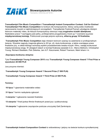 Transatlantyk Film Music Competition i Transatlantyk Instant Composition Contest. Call for Entries! Transatlantyk Film Music Competition to konkurs dla kompozytorów, którzy cenią sobie możliwość opracowania muzyki w najdrobniejszych szczegółach. Transatlantyk Festival Poznań udostępnia młodym twórcom materiały video, do których kompozytorzy stworzyć mają oryginalne ścieżki dźwiękowe. Nadesłane prace ? wymagany jest pełny, profesjonalnie przygotowany mock-up ? oceniane są przez międzynarodową komisję. Publiczność poznaje jedynie wybraną, elitarną grupę 10 finalistów. Transatlantyk Film Music Competition daje młodym twórcom szansę na zaistnienie w profesjonalnym świecie. Wysokie nagrody (nagroda główna to 20 tys. zł), duża konkurencja, a także oceniające prace finalistów jury, w skład którego wchodzą wybitni przedstawiciele świata muzyki i filmu, nadają konkursowi międzynarodową rangę. W ubiegłych latach w komisji finałowej zasiadali m.in.: Marco Beltrami, Christopher Young, Richard Gladstein, Petr Zelenka, Jan A.P. Kaczmarek, Robert Townson, Mark Isham i in. Zwycięzca konkursu otrzyma: Tytuł Transatlantyk Young Composer 2015 oraz Transatlantyk Young Composer Award ? First Prize w wysokości 20 000 PLN Jury przyzna również: Transatlantyk Young Composer Award ? Second Prize (7 500 PLN) Transatlantyk Young Composer Award ? Third Prize (2 500 PLN). Terminy: 10 lipca ? ujawnienie materiałów wideo 31 lipca ? termin nadsyłania zgłoszeń 3 sierpnia ? ogłoszenie nazwisk finalistów 13 sierpnia ? finał (pokaz filmów finałowych przed jury i publicznością) 14 sierpnia ? ogłoszenie zwycięzców podczas uroczystej Gali Zamknięcia Transatlantyk Instant Composition Contest to widowiskowy i jedyny na świecie konkurs symultanicznej 1/3 kompozycji i improwizacji synchronicznej do obrazu, na fortepianie. Młodzi artyści oglądają krótki materiał filmowy po czym na scenie, na oczach widzów muszą stworzyć spójną z obrazem kompozycję. Filmy po raz pierwszy poznają podczas przesłuchań. Po obejrzeniu obrazu niezwłocznie wychodzą na scenę i do tego samego dzieła filmowego tworzą ad hoc muzykę. Transatlantyk Instant Composition Contest przebiega w dwóch etapach. Pierwszy stanowią przesłuchania otwarte, do których mogą przystąpić wszyscy zgłoszeni uczestnicy. Do finału, stanowiącego drugi etap przesłuchań konkursowych, jury wybiera 10 młodych najbardziej kreatywnych muzyków. W komisji w ubiegłych latach zasiadały tak wybitne i znane osobowości, jak: Rolfe Kent, George Clinton, Roy Conli, Mark Marder, Zachary Matz, Leszek Możdżer, Peter Golub, Dave Porter, Vasco Hexel i in. Zwycięzca konkursu otrzyma: Tytuł: Transatlantyk Instant Composer 2015 - First Prize - 15 000 PLN Jury przyzna również: Transatlantyk Instant Composer - Second Prize - 7 500 PLN Transatlantyk Instant Composer - Third Prize ? 2 500 PLN Terminy: 3 sierpnia ? termin nadsyłania zgłoszeń i wpłaty wpisowego 12 sierpnia ? I etap przesłuchań ? eliminacje 13 sierpnia ? II etap przesłuchań ? finał 14 sierpnia ? ogłoszenie zwycięzców podczas uroczystej Gali Zamknięcia Oba etapy przesłuchań odbywają się w Sali Wielkiej Centrum Kultury Zamek w Poznaniu. Więcej informacji tutaj Wszelkie prawa zastrzeżone 2017 ZAiKS / data wygenerowania strony 04.03.2017 11:19:36 PDF ze strony: 2/3 http://zaiks.org.pl/987,0,transatlantyk_film_music_competition_i_transatlantyk_instant_composition_contest_call_for_ 3/3
