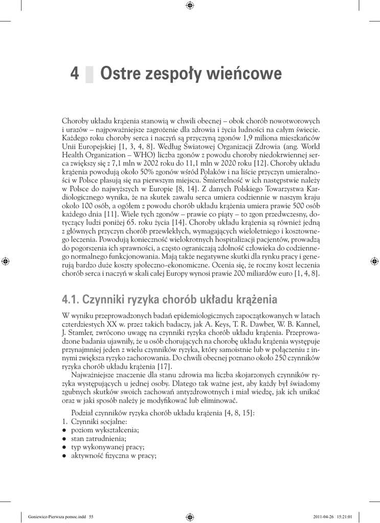 Czynniki ryzyka chorób układu krążenia 55 4 Ostre zespoły wieńcowe Choroby układu krążenia stanowią w chwili obecnej – obok chorób nowotworowych i urazów – najpoważniejsze zagrożenie dla zdrowia i życia ludności na całym świecie. Każdego roku choroby serca i naczyń są przyczyną zgonów 1,9 miliona mieszkańców Unii Europejskiej [1, 3, 4, 8]. Według Światowej Organizacji Zdrowia (ang. World Health Organization – WHO) liczba zgonów z powodu choroby niedokrwiennej serca zwiększy się z 7,1 mln w 2002 roku do 11,1 mln w 2020 roku [12]. Choroby układu krążenia powodują około 50% zgonów wśród Polaków i na liście przyczyn umieralności w Polsce plasują się na pierwszym miejscu. Śmiertelność w ich następstwie należy w Polsce do najwyższych w Europie [8, 14]. Z danych Polskiego Towarzystwa Kardiologicznego wynika, że na skutek zawału serca umiera codziennie w naszym kraju około 100 osób, a ogółem z powodu chorób układu krążenia umiera prawie 500 osób każdego dnia [11]. Wiele tych zgonów – prawie co piąty – to zgon przedwczesny, dotyczący ludzi poniżej 65. roku życia [14]. Choroby układu krążenia są również jedną z głównych przyczyn chorób przewlekłych, wymagających wieloletniego i kosztownego leczenia. Powodują konieczność wielokrotnych hospitalizacji pacjentów, prowadzą do pogorszenia ich sprawności, a często ograniczają zdolność człowieka do codziennego normalnego funkcjonowania. Mają także negatywne skutki dla rynku pracy i generują bardzo duże koszty społeczno-ekonomiczne. Ocenia się, że roczny koszt leczenia chorób serca i naczyń w skali całej Europy wynosi prawie 200 miliardów euro [1, 4, 8]. 4.1. Czynniki ryzyka chorób układu krążenia W wyniku przeprowadzonych badań epidemiologicznych zapoczątkowanych w latach czterdziestych XX w. przez takich badaczy, jak A. Keys, T. R. Dawber, W. B. Kannel, J. Stamler, zwrócono uwagę na czynniki ryzyka chorób układu krążenia. Przeprowadzone badania ujawniły, że u osób chorujących na chorobę układu krążenia występuje przynajmniej jeden z wielu czynników ryzyka, który samoistnie lub w połączeniu z innymi zwiększa ryzyko zachorowania. Do chwili obecnej poznano około 250 czynników ryzyka chorób układu krążenia [17]. Najważniejsze znaczenie dla stanu zdrowia ma liczba skojarzonych czynników ryzyka występujących u jednej osoby. Dlatego tak ważne jest, aby każdy był świadomy zgubnych skutków swoich zachowań antyzdrowotnych i miał wiedzę, jak ich unikać oraz w jaki sposób należy je modyfikować lub eliminować. Podział czynników ryzyka chorób układu krążenia [4, 8, 15]: 1. Czynniki socjalne: zzpoziom wykształcenia; zzstan zatrudnienia; zztyp wykonywanej pracy; zzaktywność fizyczna w pracy; Goniewicz-Pierwsza pomoc.indd 55 2011-04-26 15:21:01 56 Ostre zespoły wieńcowe zznadmierny stres; zzdochód finansowy; zzstan cywilny; zzsytuacja rodzinna; zzwsparcie socjalne; zzkontakty społeczne; zzwiedza zdrowotna. 2. Czynniki behawioralne: typu A (zmierzanie do celu za wszelką cenę, nadmierna rywalizacja, agresywność i wrogość wobec innych, niecierpliwość, stały pośpiech – poczucie presji czasu, energiczność, pewność siebie, szybkość mówienia i poruszania się, żywa mimika twarzy, brak czasu na odpoczynek, duża potrzeba dominacji i odnoszenia zwycięstw zawodowych oraz osobistych); zzpalenie papierosów; palący mężczyźni są co najmniej dwukrotnie bardziej obciążeni prawdopodobieństwem rozwoju choroby wieńcowej niż niepalący; zzspożywanie alkoholu; zzmała aktywność fizyczna, siedzący tryb życia; zznieracjonalne odżywianie; zzzaburzenia snu. 3. Czynniki somatyczne: zznadciśnienie tętnicze; zznadwaga i otyłość; zzcukrzyca; zzzaburzenia gospodarki lipidowej; zzzwiększenie stężenia fibrynogenu; zzzwiększenie stężenia kwasu moczowego. zzzachowanie Oprócz wyżej wymienionych czynników duży wpływ na wystąpienie choroby układu krążenia mają także cechy indywidualne, tj. wiek, płeć, obciążenia genetyczne [4, 8, 15]. Wraz z wiekiem zwiększa się zapadalność na choroby układu krążenia i dotyczy ona 2-krotnie większej liczby mężczyzn niż kobiet. Ryzyko zachorowania zwiększa się u mężczyzn powyżej 45. roku życia oraz kobiet 55-letnich i starszych [1]. U osób chorych na cukrzycę choroby sercowo-naczyniowe rozwijają się u obu płci w tym samym wieku. Obecnie uważa się, że liczba zachorowań w grupie mężczyzn i kobiet jest zbliżona. Wynika to z podobnych negatywnych zachowań zdrowotnych tych grup, tzn. nadużywanie alkoholu, palenie tytoniu, nadmierny stres. W przypadku gdy w najbliższej rodzinie (brat, siostra, rodzice) są osoby, które chorowały na chorobę wieńcową przed 60. rokiem życia, ryzyko jej wystąpienia u bliskich zwiększa się 2,5 raza [8, 9, 15]. W wyniku odpowiedniej zmiany stylu życia można modyfikować niektóre czynniki ryzyka chorób układu krążenia, głównie czynniki behawioralne i somatyczne. Kluczem w profilaktyce chorób układu krążenia są: aktywność fizyczna, rzucenie palenia i zdrowe odżywianie. Goniewicz-Pierwsza pomoc.indd 56 2011-04-26 15:21:01 Choroba niedokrwienna serca 57 4.2. Choroba niedokrwienna serca Do chorób układu krążenia stanowiących najpoważniejsze zagrożenie z punktu widzenia epidemiologii zalicza się chorobę niedokrwienną serca (łac. morbus ischaemicus cordis), chorobę zwyrodnieniowo-wytwórczą tętnic, tzw. miażdżycę tętnic (łac. atheromatosis, atherosclerosis) oraz nadciśnienie tętnicze (łac. hypertonia arterialis) ze wszystkimi jego powikłaniami. Ze względu na to, że w chorobie niedokrwiennej serca główny mechanizm niedokrwienia serca polega na upośledzeniu przepływu wieńcowego, jej synonimem jest termin choroba wieńcowa. Szacuje się, że w większości krajów europejskich stabilną chorobę wieńcową stwierdza się u 20 000–40 000 osób 