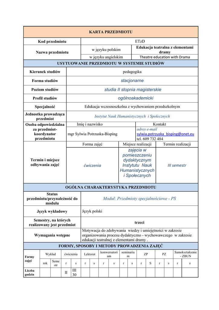 KARTA PRZEDMIOTU ETzD Edukacja teatralna z elementami dramy Theatre education with Drama Kod przedmiotu w języku polskim Nazwa przedmiotu w języku angielskim USYTUOWANIE PRZEDMIOTU W SYSTEMIE STUDIÓW Kierunek studiów pedagogika Forma studiów stacjonarne Poziom studiów studia II stopnia magisterskie ogólnoakademicki Profil studiów Specjalność Edukacja wczesnoszkolna z wychowaniem przedszkolnym Jednostka prowadząca Instytut Nauk Humanistycznych i Społecznych przedmiot Imię i nazwisko Kontakt Osoba odpowiedzialna adres e-mail za przedmiotkoordynator mgr Sylwia Potrzuska-Bisping [email protected] przedmiotu tel. 609 732 484 Forma zajęć Miejsce realizacji Termin realizacji Termin i miejsce odbywania zajęć zajęcia w pomieszczeniu dydaktycznym Instytutu Nauk Humanistycznych i Społecznych ćwiczenia III semestr OGÓLNA CHARAKTERYSTYKA PRZEDMIOTU Status przedmiotu/przynależność do modułu Moduł: Przedmioty specjalnościowe - PS Język polski Język wykładowy Semestry, na których realizowany jest przedmiot trzeci Motywacja do zdobywania wiedzy i umiejętności w zakresie organizowania procesu dydaktyczno - wychowawczego w zakresie edukacji teatralnej z elementami dramy . Wymagania wstępne FORMY, SPOSOBY I METODY PROWADZENIA ZAJĘĆ Formy zajęć Liczba godzin Wykład rok Seme str ćwiczenia r s II III 30 Lektorat r s konwersatori um r s seminariu m r s ZP r Samokształcenie - ZBUN PZ S r s r s Sposób realizacji zajęć Sposób zaliczenia zajęć Zajęcia w grupach 25-30 osobowych, wielkość jednostki zajęć - 2 godziny tygodniowo. Zaliczenie z oceną Metody dydaktyczne: - słowne (podająca, problemowa, poszukująca) Metody dydaktyczne - aktywizujące ( np. zajęcia ruchowe, projekty w grupach, nauczanie przez działanie) - praktyczne (własna działalność praktyczna, przygotowanie prezentacji) Przedmioty powiązane/moduł Dydaktyka ogólna, teoretyczne podstawy wychowania, psychologia ogólna i elementy psychologii rozwojowej, kultura języka. Adamek I., Podstawy edukacji wczesnoszkolnej, Kraków 1997 Czelakowska D., Metodyka edukacji wczesnoszkolnym, Kraków 2010 polonistycznej dzieci w wieku Broszkiewicz B., Warsztaty edukacji teatralnej: teatr dziecięcy/ Jerzy Jarek. Europa, 2009 Wykaz literatury Clifford S., Herrmann A., Teatr Przebudzenia. Praktyczny przewodnik dla instruktorów prowadzących zajęcia teatralne z młodzieżą, Wydawnictwo Cyklady, Warszawa 2003 Podstawowa Dziamska D., Gudro M., Bawię się i uczę. Edukacja przez ruch i drama w kształceniu wczesnoszkolnym, Wydawnictwo ZNP, Kielce 2010 Dziedzic A., Drama w wychowanie, Wydawnictwa CODN, Warszawa 2001 Filipiak E., Konteksty rozwoju aktywności językowej dzieci w wieku wczesnoszkolnym, Bydgoszcz 2002 Królica M., Drama i happening w edukacji przedszkolnej/. Impuls, 2009 Lewandowska-Kidoń T, Drama w kształceniu pedagogicznym, Wyd. UMCS 2001 Machulska H, Pruszkowska A, Tatarowicz J,Drama w szkole podstawowej, WSiP 1997. Megrier D., Zabawy teatralne w przedszkolu Wydawnictwo Cyklady Warszawa 2000 Pankowska K., Pedagogika dramy. Teoria i praktyka, Wydawnictwo Akademickie „Żak”, Warszawa 2000 Uzupełniająca Pertler C. R.. Pertler, Baśnie w przedszkolu: bajkoterapia w pracy z dziećmi/, Jedność, 2012 Way B., Drama w wychowaniu dzieci i młodzieży, WSiP, Warszawa 1995 Witerska K., Drama na różnych poziomach kształcenia, Wydawnictwo AHE w Łodzi, Łódź 2010 Vopel K.W,Gry i zabawy interakcyjne dla dzieci, Wyd. Jedność 1999. CELE, TREŚCI I EFEKTY KSZTAŁCENIA Cele przedmiotu (ogólne, szczegółowe) Zapoznanie studentów z wiedzą dotyczącą edukacji teatralnej z elementami dramy na poziomie kształcenia elementarnego oraz dotyczącą organizacji procesu dydaktyczno – wychowawczego w obszarze edukacji teatralnej. Rozwijanie umiejętności projektowania zajęć edukacyjnych z wykorzystaniem technik parateatralnych i dramowych z wykorzystaniem własnych rozwiązań metodycznych. Kreowanie sytuacji dydaktycznych inspirujących do twórczej działalności praktycznej ucznia. Treści programowe Efekty kształcenia (kody) W_09 Forma zajęć ćw ćw. W_09 W_09 U_12 ćw. Temat 1. Podstawowe założenia edukacji teatralnej z elementami dramy w kształceniu przedszkolnym i zintegrowanym. Liczba godzin Suma liczby godzin 2 2 2. Rola edukacji teatralnej i stosowania technik dramowych w kształceniu 2 przedszkolnym i zintegrowanym 3. Zabawy teatralne w nauczaniu zintegrowanym przedszkolu 2 i 2 2 W_15 U_ 09 ćw. 4. Techniki dramowe i parateatralne 4 wprowadzenie i zastosowanie ćw. 5. Techniki dramowe i parateatralne w czytaniu tekstów literackich i tworzeniu historii w kształceniu przedszkolnym i 4 zintegrowanym W_15 U_ 09 ćw. 4 4 6. Ćwiczenia dramowe i parateatralne U_09 U_12 prowadzące do naturalnego i świadomego posługiwania się językiem, 2 7. Projektowanie zajęć edukacyjnych w przedszkolu i klasach I-III z wykorzystaniem technik dramowych i parateatralnych – 4 tworzenie scenariuszy; pomocy dydaktycznych 2 U_09 U_12 Ćw. U_09 U_12 Ćw. 8. Prezentacja teatralnych 4 4 W_10 U_09 U_12 Ćw. 9. Przygotowanie inscenizacji w przedszkolu i 6 klasach I-III 6 projektów 4 dramowo- Efekty kształcenia Student, który zaliczył przedmiot kod w zakresie WIEDZY W15 W09 W10 U02 Odniesienie do efektów kształcenia dla kierunku Posiada podstawy teoretyczne w zakresie organizacji procesu K_W15 dydaktyczno – wychowawczego w obszarze edukacji teatralnej z elementami dramy ma uporządkowaną wiedzę o kulturowych uwarunkowaniach procesów edukacyjnych K_W09 ma uporządkowaną wiedzę o celach, organizacji i funkcjonowaniu instytucji edukacyjnych i kulturalnych K_W10 w zakresie UMIEJĘTNOŚCI Projektuje zajęcia z wykorzystaniem technik dramowych i K_U02 dla obszaru S2A_W04 S2A_W03 S2A_W05 S2A_W02 S2A_W03 S2A_W07 parateatralnych S2A_U02 H2A_U01 U03 potrafi sprawnie porozumiewać się przy użyciu rożnych kanałów i technik komunikacyjnych ze specjalistami w zakresie pedagogiki, jak i z odbiorcami 