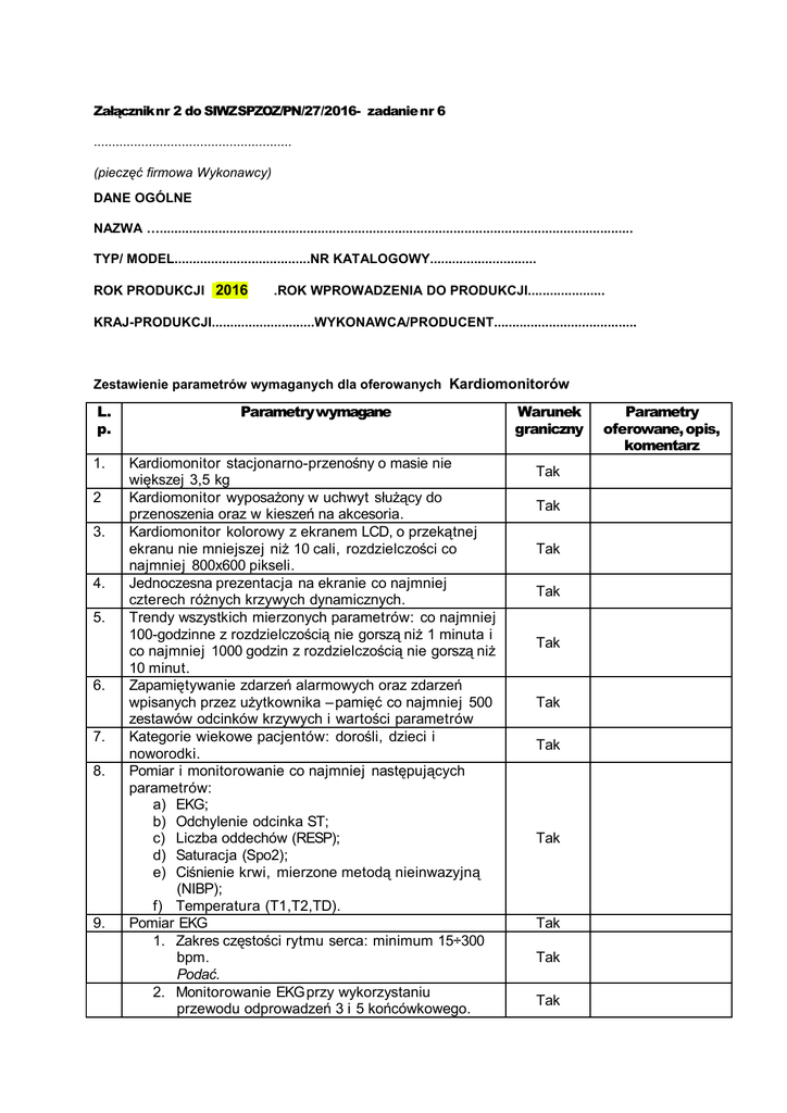 Załącznik nr 2 do SIWZSPZOZ/PN/27/2016- zadanie nr 6 ...................................................... (pieczęć firmowa Wykonawcy) DANE OGÓLNE NAZWA …................................................................................................................................. TYP/ MODEL.....................................NR KATALOGOWY............................. ROK PRODUKCJI 2016 .ROK WPROWADZENIA DO PRODUKCJI..................... KRAJ-PRODUKCJI............................WYKONAWCA/PRODUCENT....................................... Zestawienie parametrów wymaganych dla oferowanych Kardiomonitorów L. p. 1. 2 3. 4. 5. 6. 7. 8. 9. Parametry wymagane Kardiomonitor stacjonarno-przenośny o masie nie większej 3,5 kg Kardiomonitor wyposażony w uchwyt służący do przenoszenia oraz w kieszeń na akcesoria. Kardiomonitor kolorowy z ekranem LCD, o przekątnej ekranu nie mniejszej niż 10 cali, rozdzielczości co najmniej 800x600 pikseli. Jednoczesna prezentacja na ekranie co najmniej czterech różnych krzywych dynamicznych. Trendy wszystkich mierzonych parametrów: co najmniej 100-godzinne z rozdzielczością nie gorszą niż 1 minuta i co najmniej 1000 godzin z rozdzielczością nie gorszą niż 10 minut. Zapamiętywanie zdarzeń alarmowych oraz zdarzeń wpisanych przez użytkownika – pamięć co najmniej 500 zestawów odcinków krzywych i wartości parametrów Kategorie wiekowe pacjentów: dorośli, dzieci i noworodki. Pomiar i monitorowanie co najmniej następujących parametrów: a) EKG; b) Odchylenie odcinka ST; c) Liczba oddechów (RESP); d) Saturacja (Spo2); e) Ciśnienie krwi, mierzone metodą nieinwazyjną (NIBP); f) Temperatura (T1,T2,TD). Pomiar EKG 1. Zakres częstości rytmu serca: minimum 15÷300 bpm. Podać. 2. Monitorowanie EKG przy wykorzystaniu przewodu odprowadzeń 3 i 5 końcówkowego. Warunek graniczny Tak Tak Tak Tak Tak Tak Tak Tak Tak Tak Tak Parametry oferowane, opis, komentarz 10. 11. 3. Dokładność pomiaru częstości rytmu: nie gorsza niż+/- 1%. Podać. 4. Prędkości kreślenia co najmniej do wyboru: 6,25 mm/s; 12,5 mm/s; 25 mm/s; 50 mm/s. Podać. 5. Detekcja stymulatora z graficznym zaznaczeniem na krzywej EKG. 6. Czułość: co najmniej 0,125 cm/mV; 0,25 cm/mV; 0,5 cm/mV; 1,0 cm/mV; 2 cm/mV; 4,0 cm/mV; auto. wymienić. 7. Analiza odchylenia odcinka ST w siedmiu odprowadzeniach jednocześnie w zakresie od -2,0 do +2,0 mV. Możliwość ustawienia jednostki pomiarowej mm. 8. Prezentacja zmian odchylenia ST w postaci wzorcowych odcinków ST z nanoszonymi na nie bieżącymi odcinkami lub w formie wykresów kołowych 9. Monitorowanie odcinka QT 10. Analiza zaburzeń rytmu (co najmniej 23), z rozpoznawaniem co najmniej następujących zaburzeń: a) Bradykardia b) Tachykardia c) Asystolia d) Tachykardia komorowa e) Migotanie komór f) Migotanie przedsionków g) Stymulator nie przechwytuje h) Stymulator nie generuje impulsów i) Salwa komorowa j) PVC/min wysokie Pomiar oddechów (RESP). 1. Zakres pomiaru: minimum 5-120 oddechów /min Podać. 2. Dokładność pomiaru: nie gorsza niż +/- 2 oddech /min 3. Prędkość kreślenia: co najmniej 6,25 mm/s; 12,5 mm/s; 25mm/s, 50 mm/s. Podać 4. Możliwość wyboru odprowadzeń do monitorowania respiracji Pomiar saturacji (SpO2). 1. Zakres pomiaru saturacji: 0÷100% 2. Zakres pomiaru pulsu: co najmniej 20÷300/min. Podać. 3. Dokładność pomiaru saturacji w zakresie 70÷100%: nie gorsza niż +/- 3%. Podać. 4. Funkcja pozwalająca na jednoczesny pomiar SpO2 i nieinwazyjnego ciśnienia bez wywoływania Tak Tak Tak Tak Tak Tak Tak Tak Tak Tak Tak Tak Tak Tak Tak Tak Tak Tak 12. 13. 14. 15. 16. 17. alarmu SpO2 w momencie pompowania mankietu na kończynie na której założony jest czujnik 5. Alarm desaturacji Pomiar ciśnienia krwi metodą nieinwazyjną (NIBP). 1. Oscylometryczna metoda pomiaru. 2. Zakres pomiaru ciśnienia: co najmniej 15÷270 mmHg. Podać. 3. Zakres pomiaru pulsu wraz z NIBP: co najmniej 40÷240 bpm. 4. Dokładność pomiaru: nie gorsza niż +/- 5mmHg. Podać. 5. Tryb pomiaru: a) AUTO; b) Ręczny. 6. Zakres programowania interwałów w trybie AUTO: co najmniej 1÷480 minut. Podać. 7. Możliwość wstępnego ustawienia ciśnienia w mankiecie Pomiar temperatury (TEMP) 1. Zakres pomiarowy: co najmniej 25÷42˚C. Podać. 2. Dokładność pomiaru: nie gorsza niż +/- 0,1˚C. Podać. 3. Jednoczesne wyświetlanie co najmniej trzech wartości : 2 temperatury ciała i temperatura różnicowa Wyposażenie kardiomonitora w akcesoria pomiarowe. 1. Kabel EKG 5-odprowadzeniowy 2. Przewód łączący do mankietów do pomiaru NIBP 3. Mankiet średni do pomiaru NIBP 4. Czujnik SpO2 na palec dla dorosłych typu klips 5. Czujnik temperatury powierzchniowy Obsługa kardiomonitora przy pomocy, pokrętła, przycisków oraz poprzez ekran dotykowy. 3-stopniowy system alarmów monitorowanych parametrów. 1. Akustyczne i wizualne sygnalizowanie wszystkich alarmów. 2. Możliwość zawieszenia stałego lub czasowego alarmów. 3. Wybór czasowego zawieszenia alarmów – co najmniej 5 czasów do wyboru. 4. Ustawianie różnych poziomów alarmowania dla poszczególnych parametrów. 5. Ustawianie głośności sygnalizacji alarmowej (co najmniej 10 poziomów do wyboru) oraz wzorca dźwiękowej sygnalizacji (co najmniej 3 wzorce do wyboru) Ręczne i automatyczne (na żądanie obsługi) ustawienie granic alarmowych w odniesieniu do aktualnego stanu monitorowanego pacjenta. Tak Tak Tak Tak Tak Tak Tak Tak Tak Tak Tak Tak Tak Tak Tak Tak Tak Tak Tak Tak Tak Tak Tak Tak Tak Tak Tak 18. 19. 20. 21. 22. 23. Funkcja analizy zmian częstości akcji serca z ostatnich 24 godzin informacje o wartościach HR: średniej, średniej za dnia, średniej w nocy, maksymalnej, minimalnej oraz prawidłowej (w granicach ustawionych alarmów). Funkcja analizy NIBP z ostatnich 24 godzin informacje o wartościach ciśnienia: średniej, średniej za dnia, średniej w nocy, maksymalnej za dnia, maksymalnej w nocy, minimalnej za dnia, minimalnej w 