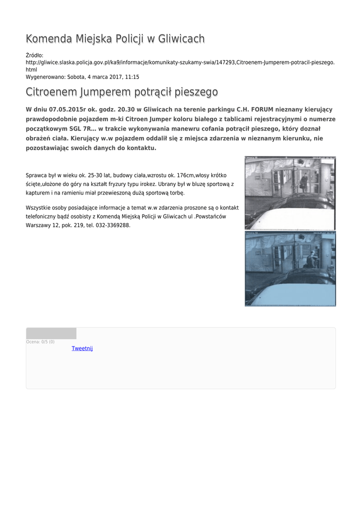 Komenda Miejska Policji w Gliwicach Źródło: http://gliwice.slaska.policja.gov.pl/ka9/informacje/komunikaty-szukamy-swia/147293,Citroenem-Jumperem-potracil-pieszego. html Wygenerowano: Sobota, 4 marca 2017, 11:15 Citroenem Jumperem potrącił pieszego W dniu 07.05.2015r ok. godz. 20.30 w Gliwicach na terenie parkingu C.H. FORUM nieznany kierujący prawdopodobnie pojazdem m-ki Citroen Jumper koloru białego z tablicami rejestracyjnymi o numerze początkowym SGL 7R… w trakcie wykonywania manewru cofania potrącił pieszego, który doznał obrażeń ciała. Kierujący w.w pojazdem oddalił się z miejsca zdarzenia w nieznanym kierunku, nie pozostawiając swoich danych do kontaktu. Sprawca był w wieku ok. 25-30 lat, budowy ciała,wzrostu ok. 176cm,włosy krótko ścięte,ułożone do góry na kształt fryzury typu irokez. Ubrany był w bluzę sportową z kapturem i na ramieniu miał przewieszoną dużą sportową torbę. Wszystkie osoby posiadające informacje a temat w.w zdarzenia proszone są o kontakt telefoniczny bądź osobisty z Komendą Miejską Policji w Gliwicach ul .Powstańców Warszawy 12, pok. 219, tel. 032-3369288. Ocena: 0/5 (0) Tweetnij