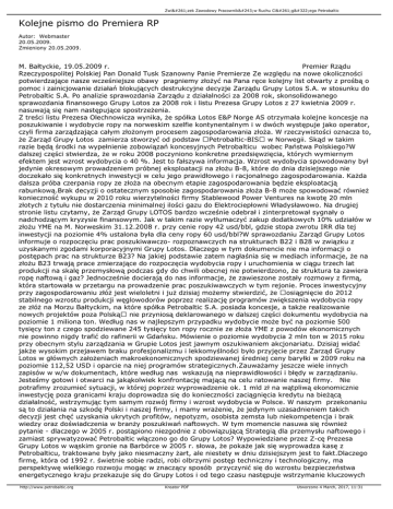 Związek Zawodowy Pracowników Ruchu Ciągłego Petrobaltic Kolejne pismo do Premiera RP Autor: Webmaster 20.05.2009. Zmieniony 20.05.2009. M. Bałtyckie, 19.05.2009 r. Premier Rządu Rzeczypospolitej Polskiej Pan Donald Tusk Szanowny Panie Premierze Ze względu na nowe okoliczności potwierdzające nasze wcześniejsze obawy pragniemy złożyć na Pana ręce kolejny list otwarty z prośbą o pomoc i zainicjowanie działań blokujących destrukcyjne decyzje Zarządu Grupy Lotos S.A. w stosunku do Petrobaltic S.A. Po analizie sprawozdania Zarządu z działalności za 2008 rok, skonsolidowanego sprawozdania finansowego Grupy Lotos za 2008 rok i listu Prezesa Grupy Lotos z 27 kwietnia 2009 r. nasuwają się nam następujące spostrzeżenia. Z treści listu Prezesa Olechnowicza wynika, że spółka Lotos E&P Norge AS otrzymała kolejne koncesje na poszukiwanie i wydobycie ropy na norweskim szelfie kontynentalnym i w dwóch występuje jako operator, czyli firma zarządzająca całym złożonym procesem zagospodarowania złoża. W rzeczywistości oznacza to, że Zarząd Grupy Lotos zamierza stworzyć od podstaw Petrobaltic-BIS w Norwegii. Skąd w takim razie będą środki na wypełnienie zobowiązań koncesyjnych Petrobalticu wobec Państwa Polskiego?W dalszej części stwierdza, że w roku 2008 poczyniono konkretne przedsięwzięcia, których wymiernym efektem jest wzrost wydobycia o 40 %. Jest to fałszywa informacja. Wzrost wydobycia spowodowany był jedynie okresowym prowadzeniem próbnej eksploatacji na złożu B-8, które do dnia dzisiejszego nie doczekało się konkretnych inwestycji w celu jego prawidłowego i racjonalnego zagospodarowania. Każda dalsza próba czerpania ropy ze złoża na obecnym etapie zagospodarowania będzie eksploatacją rabunkową.Brak decyzji o ostatecznym sposobie zagospodarowania złoża B-8 może spowodować również konieczność wykupu w 2010 roku wierzytelności firmy Stablewood Power Ventures na kwotę 20 mln złotych z tytułu nie dostarczenia minimalnej ilości gazu do Elektrociepłowni Władysławowo. Na drugiej stronie listu czytamy, że Zarząd Grupy LOTOS bardzo wcześnie odebrał i zinterpretował sygnały o nadchodzącym kryzysie finansowym. Jak w takim razie wytłumaczyć zakup dodatkowych 10% udziałów w złożu YME na M. Norweskim 31.12.2008 r. przy cenie ropy 42 usd/bbl, gdzie stopa zwrotu IRR dla tej inwestycji na poziomie 4% ustalona była dla ceny ropy 60 usd/bbl?W sprawozdaniu Zarząd Grupy Lotos informuje o rozpoczęciu prac poszukiwawczo- rozpoznawczych na strukturach B22 i B28 w związku z uzyskanymi zgodami korporacyjnymi Grupy Lotos. Dlaczego w tym dokumencie nie ma informacji o postępach prac na strukturze B23? Na jakiej podstawie zatem nagłaśnia się w mediach informacje, że na złożu B23 trwają prace zmierzające do rozpoczęcia wydobycia ropy i uruchomienia w ciągu trzech lat produkcji na skalę przemysłową podczas gdy do chwili obecnej nie potwierdzono, że struktura ta zawiera ropę naftową i gaz? Jednocześnie docierają do nas informacje, że zawieszone zostały rozmowy z firmą, która startowała w przetargu na prowadzenie prac poszukiwawczych w tym rejonie. Proces inwestycyjny przy zagospodarowaniu złóż jest wieloletni i już dzisiaj możemy stwierdzić, że osiągnięcie do 2012 stabilnego wzrostu produkcji węglowodorów poprzez realizację programów zwiększenia wydobycia ropy ze złóż na Morzu Bałtyckim, na które spółka Petrobaltic S.A. posiada koncesje, a także realizowanie nowych projektów poza Polską nie przyniosą deklarowanego w dalszej części dokumentu wydobycia na poziomie 1 miliona ton. Według nas w najlepszym przypadku wydobycie może być na poziomie 500 tysięcy ton z czego spodziewane 245 tysięcy ton ropy rocznie ze złoża YME z powodów ekonomicznych nie powinno nigdy trafić do rafinerii w Gdańsku. Mówienie o poziomie wydobycia 2 mln ton w 2015 roku przy obecnym stylu zarządzania w Grupie Lotos jest jawnym oszukiwaniem akcjonariatu. Dzisiaj widać jakże wysokim przejawem braku profesjonalizmu i lekkomyślności było przyjęcie przez Zarząd Grupy Lotos w głównych założeniach makroekonomicznych spodziewanej średniej ceny baryłki w 2009 roku na poziomie 112,52 USD i oparcie na niej programów strategicznych.Zauważamy jeszcze wiele innych zapisów w w/w dokumentach, które według nas wskazują na nieprawidłowości i błędy w zarządzaniu. Jesteśmy gotowi i otwarci na jakąkolwiek konfrontację mającą na celu ratowanie naszej firmy. Nie potrafimy zrozumieć sytuacji, w której poprzez wyprowadzenie ok. 1 mld zł na wątpliwą ekonomicznie inwestycję poza granicami kraju doprowadza się do konieczności zaciągnięcia kredytu na bieżącą działalność, wstrzymując tym samym rozwój firmy i wzrost wydobycia w Polsce. W naszym przekonaniu są to działania na szkodę Polski i naszej firmy, i mamy wrażenie, że jedynym uzasadnieniem takich decyzji jest chęć uzyskania ukrytych profitów, nepotyzm, osobista zemsta lub niekompetencja i brak wiedzy oraz doświadczenia w branży poszukiwań naftowych. W tym momencie nasuwa się również pytanie - dlaczego w 2005 r. postąpiono niezgodnie z obowiązującą Strategią dla przemysłu naftowego i zamiast sprywatyzować Petrobaltic włączono go do Grupy Lotos? Wypowiedziane przez Z-cę Prezesa Grupy Lotos w wąskim gronie na Barbórce w 2005 r. słowa, że pokaże jak się wyprowadza kasę z Petrobalticu, traktowane były jako niesmaczny żart, ale niestety w dniu dzisiejszym jest to fakt.Dlaczego firmę, która od 1992 r. świetnie sobie radzi, robi olbrzymi postęp techniczny i technologiczny, ma perspektywę wielkiego rozwoju mogąc w znaczący sposób przyczynić się do wzrostu bezpieczeństwa energetycznego kraju przekazuje się do Grupy Lotos i od tego czasu następuje wstrzymanie kluczowych http://www.petrobaltic.org Kreator PDF Utworzono 4 March, 2017, 11:31 Związek Zawodowy Pracowników Ruchu Ciągłego Pe