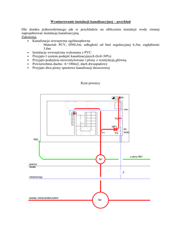 Wymiarowanie instalacji kanalizacyjnej – przykład Dla domku jednorodzinnego jak w przykładzie na obliczenia instalacji wody zimnej zaprojektować instalację kanalizacyjną. Założenia: • Kanalizacja zewnętrzna ogólnospławna – Materiał: PCV, DN0,5m, odległość od linii regulacyjnej 6,5m, zagłębienie 3,0m • Instalacja wewnętrzna wykonana z PVC • Przyjęto I system podejść kanalizacyjnych (h/d=50%) • Przyjęto podejścia niewentylowane i piony z wentylacją główną • Powierzchnia dachu: A=180m2, dach dwuspadowy • Przyjęto dwa piony spustowe kanalizacji deszczowej Rzut piwnicy PII cwu PI Tr2 WP1 Tr1 Tr3 ZA WOD RS2 z pionu RS1 St1 granica działki Z WODOCIĄG KANAŁ OGÓLNOSPŁAWNY St2 Rzut parteru Rzut poddasza Obliczenia 1. Kanalizacja sanitarna 1.1. Dobór średnic podejść i pionów a) Pion PI • Podejścia pojedyncze Ilość DU [l/s] Zlewozmywak (Zz) 1 0,8 Umywalka (U) 1 0,5 Miska ustępowa (Mu) 1 2,5 Wanna (W) 1 0,8 Pralka aut. (P) 1 0,8 5,4 ΣDU Urządzenie lub przybór DN [m] 0,07 0,05 0,10 0,05 0,05 imin [%] 2,0 l/s Podejścia zbiorowe: U+W: ΣDU = 1,3 l/s→ Ponieważ DUmax=0,8l/s więc Qww=0,8l/s stąd przyjęto DN0,05m U+W+P: ΣDU = 2,1 l/s→ Ponieważ DUmax=0,8l/s więc Qww=0,8l/s stąd przyjęto DN0,05m U+W+P+Mu: ΣDU = 4,6 l/s→ Ponieważ DUmax=2,5l/s więc Qww=2,5l/s stąd przyjęto DN0,10m Średnica dla pionu PI: ΣDU = 5,4 l/s→ Ponieważ DUmax=2,5l/s więc Qww=2,5l/s stąd przyjęto DN0,10m na podstawie tab. 11 w PNEN 12056-2:2000 b) Pion PII • Podejścia pojedyncze Urządzenie lub przybór Umywalka (U) Miska ustępowa (Mu) ΣDU Ilość DU [l/s] 1 0,5 1 2,5 3,0 DN imin [m] [%] 0,04 0,10 2,0 l/s Średnica dla pionu PII: ΣDU = 3,0 l/s→ Ponieważ DUmax=2,5l/s więc Qww=2,5l/s stąd przyjęto DN0,10m na podstawie tab. 11 w PNEN 12056-2:2000 1.2. Dobór średnic dla przewodów odpływowych odc PI-Tr1 PII-Tr2 Z-Tr2 WP1-Tr3 Tr2-Tr3 Tr3-Tr1 Tr1-St1 i Q0 v0 ΣDU DUmax Qww DN α [l/s] [l/s] [l/s] [m] [%] [l/s] [m/s] 5,4 3,0 0,8 1,5 3,8 5,3 10,7 2,5 2,5 0,8 1,5 2,5 2,5 2,5 2,5 2,5 0,8 1,5 2,5 2,5 2,5 0,10 0,10 0,07 0,07 0,10 0,10 0,10 2,0 2,0 2,0 2,0 2,0 2,0 2,0 7,85 7,85 3,67 3,67 7,85 7,85 7,85 1,0 1,0 0,83 0,83 1,0 1,0 1,0 β h/d 0,32 0,9 0,4 0,32 0,9 0,4 0,22 0,8 0,32 0,41 0,95 0,45 0,32 0,9 0,4 0,32 0,9 0,4 0,32 0,9 0,4 vrz L Rp Rk [m/s] [m] [m npm] [mnpm] 0,9 0,9 0,67 0,79 0,9 0,9 0,9 Rk= Rp-i·L KOREKTA Z-Tr2 0,8 0,8 0,8 0,07 2,5 4,06 0,92 0,2 0,78 0,3 0,72 2. Kanalizacja deszczowa A) Powierzchnia dachu odwadniana przez pion RS1 lub RS2: AP=0,5·A = 0,5 ·180 = 90 m2 Do odprowadzenia wód opadowych z dachu zastosowano rynny w systemie BRYZA 125 o średnicy 125mm firmy Cellfast prowadzone ze spadkiem 0,5% w kierunku pionu spustowego RS1 i RS2. B) Wyznaczenie obliczeniowego natężenia przepływu ścieków dla jednego pionu: Qr = C·AP· r = 1·90·0,03 = 2,7 l/s Dobrano średnicę rur spustowych 90mm wg katalogu systemu rynnowego BRYZA. 2.2. Dobór średnic dla przewodów odpływowych Odcinek RS1-St1 lub RS2-St1 Qr = 2,7 l/s dobrano średnicę przewodu odpływowego DN 0,1m, zastosowano spadek i=2% Dla DN= 0,1m i spadku i=2% odczytano: Q0=7,85l/s oraz v0=1,0 m/s Zatem: α=0,34, β =0,92, h/d = 0,42 a obliczona prędkość rzeczywista: vrz = 0,92 m/s 3. Kanalizacja ogólnospławna A) Wyznaczenie obliczeniowego natężenia przepływu ścieków ogólnych i dobór średnicy przykanalika (odcinek St1-St2) Qt = Qww+2Qr= 2,5 +2 ·2,7=7,9 l/s Dla przepływu Qt=7,9 l/s dobrano: DN=0,15m, i=1,5% Zatem: Q0=20,15 l/s, v0=1,14 m/s Zatem: α=0,39, β =0,94, h/d = 0,45 a obliczona prędkość rzeczywista: vrz = 1,07 m/s Sprawdzenie, czy dla przepływu tylko ścieków Qww vrz≥0,7 m/s: Qww =2,5 l/s DN=0,15m, i=1,5% Zatem: Q0=20,15 l/s, v0=1,14 m/s Zatem: α=0,12, β =0,68, h/d = 0,25 a obliczona prędkość rzeczywista: vrz = 0,78 m/s