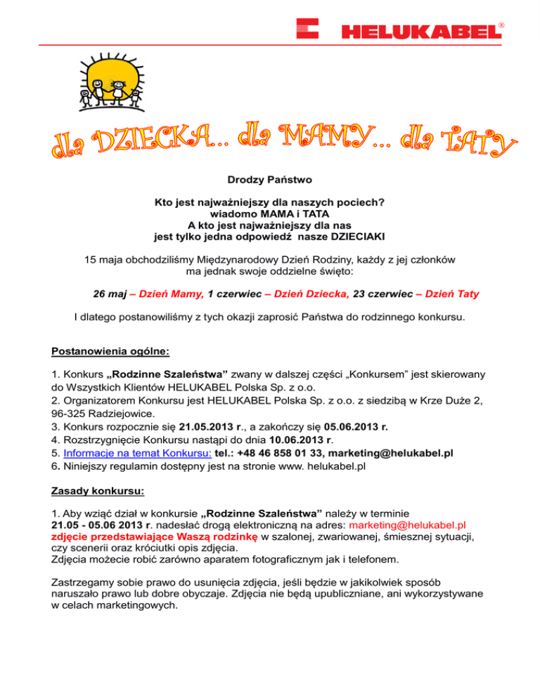 Drodzy Państwo Kto jest najważniejszy dla naszych pociech? wiadomo MAMA i TATA A kto jest najważniejszy dla nas jest tylko jedna odpowiedź nasze DZIECIAKI 15 maja obchodziliśmy Międzynarodowy Dzień Rodziny, każdy z jej członków ma jednak swoje oddzielne święto: 26 maj – Dzień Mamy, 1 czerwiec – Dzień Dziecka, 23 czerwiec – Dzień Taty I dlatego postanowiliśmy z tych okazji zaprosić Państwa do rodzinnego konkursu. Postanowienia ogólne: 1. Konkurs „Rodzinne Szaleństwa” zwany w dalszej części „Konkursem” jest skierowany do Wszystkich Klientów HELUKABEL Polska Sp. z o.o. 2. Organizatorem Konkursu jest HELUKABEL Polska Sp. z o.o. z siedzibą w Krze Duże 2, 96-325 Radziejowice. 3. Konkurs rozpocznie się 21.05.2013 r., a zakończy się 05.06.2013 r. 4. Rozstrzygnięcie Konkursu nastąpi do dnia 10.06.2013 r. 5. Informacje na temat Konkursu: tel.: +48 46 858 01 33, [email protected] 6. Niniejszy regulamin dostępny jest na stronie www. helukabel.pl Zasady konkursu: 1. Aby wziąć dział w konkursie „Rodzinne Szaleństwa” należy w terminie 21.05 - 05.06 2013 r. nadesłać drogą elektroniczną na adres: [email protected] zdjęcie przedstawiające Waszą rodzinkę w szalonej, zwariowanej, śmiesznej sytuacji, czy scenerii oraz króciutki opis zdjęcia. Zdjęcia możecie robić zarówno aparatem fotograficznym jak i telefonem. Zastrzegamy sobie prawo do usunięcia zdjęcia, jeśli będzie w jakikolwiek sposób naruszało prawo lub dobre obyczaje. Zdjęcia nie będą upubliczniane, ani wykorzystywane w celach marketingowych. Nagroda: 1. Komisja konkursowa spośród nadesłanych zdjęć wyłoni 5 najciekawszych, najśmieszniejszych zdjęć, które zostaną nagrodzone. Nagrodą w konkursie jest: 5 zestawów w skład których wchodzą: 3 VOUCHERY na filmy 2D i 3D do kin CINEMA CITY oraz IMAX do wykorzystania na terenie całej Polski (dla jednej rodziny) Vouchery są ważne przez cały tydzień w kinach IMAX lub Cinema City. Jeden Voucher wymienia się w kasie kina na jeden bilet. Voucher nie upoważnia do pierwszeństwa w obsłudze przy kasie, ani nie gwarantuje miejsca na sali, zachęcamy do wcześniejszej rezerwacji biletu na odpowiedni seans. Vouchery obowiązują także na premiery i pokazy przedpremierowe, nie obowiązują natomiast na pokazy specjalne, maratony, filmy wyświetlane w salach VIP oraz w Cinema Park. 2. Nagroda zostanie przesłana drogą pocztową lub kurierem w ciągu 7 dni na adres wskazany przez zwycięzcę. Postanowienia końcowe: 1. Uczestnik przystępując do konkursu deklaruje jednocześnie zapoznanie się z regulaminem konkursowym i zgadza się z jego treścią. 2. Uczestnik wyraża zgodę na przetwarzanie swoich danych osobowych niezbędnych na potrzeby niniejszego konkursu. 3. Konkurs nie podlega przepisom ustawy z dnia 29 lipca 1992 roku o grach i zakładach wzajemnych (Dz. U. z 1994 roku Nr 4, poz. 27 z późn. zm.) W kwestiach nieuregulowanych niniejszym regulaminem stosuje się przepisy Kodeksu Cywilnego. W razie pytań i wątpliwości dodatkowe informacje na temat konkursu można uzyskać pod numerami tel. 46 858 01 33, 46 858 0160 lub pod adresami e-mailowymi: [email protected], [email protected] ZAPRASZAMY HELUKABEL Polska Sp. z o.o.