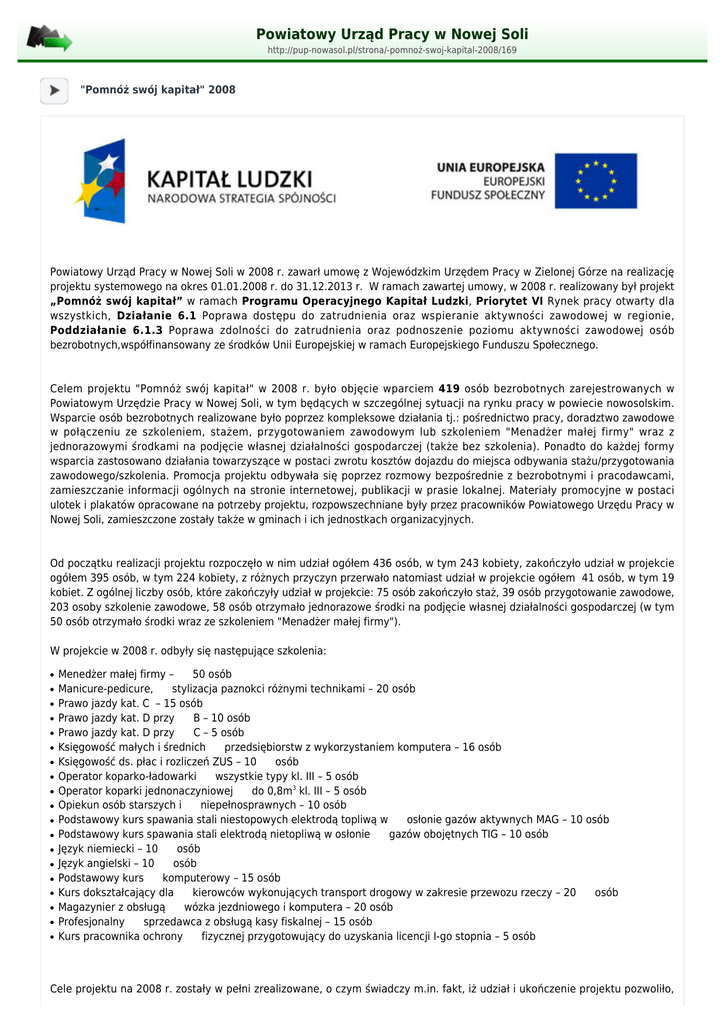 Powiatowy Urząd Pracy w Nowej Soli http://pup-nowasol.pl/strona/-pomnoż-swoj-kapital-2008/169 "Pomnóż swój kapitał" 2008 Powiatowy Urząd Pracy w Nowej Soli w 2008 r. zawarł umowę z Wojewódzkim Urzędem Pracy w Zielonej Górze na realizację projektu systemowego na okres 01.01.2008 r. do 31.12.2013 r. W ramach zawartej umowy, w 2008 r. realizowany był projekt „Pomnóż swój kapitał” w ramach Programu Operacyjnego Kapitał Ludzki, Priorytet VI Rynek pracy otwarty dla wszystkich, Działanie 6.1 Poprawa dostępu do zatrudnienia oraz wspieranie aktywności zawodowej w regionie, Poddziałanie 6.1.3 Poprawa zdolności do zatrudnienia oraz podnoszenie poziomu aktywności zawodowej osób bezrobotnych,współfinansowany ze środków Unii Europejskiej w ramach Europejskiego Funduszu Społecznego. Celem projektu "Pomnóż swój kapitał" w 2008 r. było objęcie wparciem 419 osób bezrobotnych zarejestrowanych w Powiatowym Urzędzie Pracy w Nowej Soli, w tym będących w szczególnej sytuacji na rynku pracy w powiecie nowosolskim. Wsparcie osób bezrobotnych realizowane było poprzez kompleksowe działania tj.: pośrednictwo pracy, doradztwo zawodowe w połączeniu ze szkoleniem, stażem, przygotowaniem zawodowym lub szkoleniem "Menadżer małej firmy" wraz z jednorazowymi środkami na podjęcie własnej działalności gospodarczej (także bez szkolenia). Ponadto do każdej formy wsparcia zastosowano działania towarzyszące w postaci zwrotu kosztów dojazdu do miejsca odbywania stażu/przygotowania zawodowego/szkolenia. Promocja projektu odbywała się poprzez rozmowy bezpośrednie z bezrobotnymi i pracodawcami, zamieszczanie informacji ogólnych na stronie internetowej, publikacji w prasie lokalnej. Materiały promocyjne w postaci ulotek i plakatów opracowane na potrzeby projektu, rozpowszechniane były przez pracowników Powiatowego Urzędu Pracy w Nowej Soli, zamieszczone zostały także w gminach i ich jednostkach organizacyjnych. Od początku realizacji projektu rozpoczęło w nim udział ogółem 436 osób, w tym 243 kobiety, zakończyło udział w projekcie ogółem 395 osób, w tym 224 kobiety, z różnych przyczyn przerwało natomiast udział w projekcie ogółem 41 osób, w tym 19 kobiet. Z ogólnej liczby osób, które zakończyły udział w projekcie: 75 osób zakończyło staż, 39 osób przygotowanie zawodowe, 203 osoby szkolenie zawodowe, 58 osób otrzymało jednorazowe środki na podjęcie własnej działalności gospodarczej (w tym 50 osób otrzymało środki wraz ze szkoleniem "Menadżer małej firmy"). W projekcie w 2008 r. odbyły się następujące szkolenia: ● ● ● ● ● ● ● ● ● ● ● ● ● ● ● ● ● ● ● Menedżer małej firmy – 50 osób Manicure-pedicure, stylizacja paznokci różnymi technikami – 20 osób Prawo jazdy kat. C – 15 osób Prawo jazdy kat. D przy B – 10 osób Prawo jazdy kat. D przy C – 5 osób Księgowość małych i średnich przedsiębiorstw z wykorzystaniem komputera – 16 osób Księgowość ds. płac i rozliczeń ZUS – 10 osób Operator koparko-ładowarki wszystkie typy kl. III – 5 osób Operator koparki jednonaczyniowej do 0,8m3 kl. III – 5 osób Opiekun osób starszych i niepełnosprawnych – 10 osób Podstawowy kurs spawania stali niestopowych elektrodą topliwą w osłonie gazów aktywnych MAG – 10 osób Podstawowy kurs spawania stali elektrodą nietopliwą w osłonie gazów obojętnych TIG – 10 osób Język niemiecki – 10 osób Język angielski – 10 osób Podstawowy kurs komputerowy – 15 osób Kurs dokształcający dla kierowców wykonujących transport drogowy w zakresie przewozu rzeczy – 20 osób Magazynier z obsługą wózka jezdniowego i komputera – 20 osób Profesjonalny sprzedawca z obsługą kasy fiskalnej – 15 osób Kurs pracownika ochrony fizycznej przygotowujący do uzyskania licencji I-go stopnia – 5 osób Cele projektu na 2008 r. zostały w pełni zrealizowane, o czym świadczy m.in. fakt, iż udział i ukończenie projektu pozwoliło, 86 osobom podjąć zatrudnienie, natomiast 58 osobom –samozatrudnienie. Ponadto 203 osoby uzyskały zaświadczenie z tytułu ukończenia szkolenia zawodowego, 72 osoby uzyskały zaświadczenie z tytułu ukończenia stażu, 42 osoby z tytułu ukończenia przygotowania zawodowego, 50 osób z tytułu ukończenia szkolenia „Menadżer malej firmy”. Osoby uczestniczące w projekcie podwyższyły dzięki temu swoje kwalifikacje zawodowe poprzez nabycie nowych umiejętności lub poszerzenie dotychczas posiadanych. Wnioskowana wartość projektu realizowanego przez Powiatowy Urząd Pracy w Nowej Soli w 2008 r. wyniosła 800,10 zł. 2 065