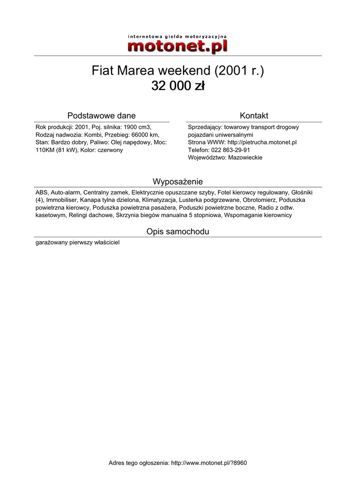 Fiat Marea weekend (2001 r.) 32 000 zł Podstawowe dane Kontakt Rok produkcji: 2001, Poj. silnika: 1900 cm3, Rodzaj nadwozia: Kombi, Przebieg: 66000 km, Stan: Bardzo dobry, Paliwo: Olej napędowy, Moc: 110KM (81 kW), Kolor: czerwony Sprzedający: towarowy transport drogowy pojazdani uniwersalnymi Strona WWW: http://pietrucha.motonet.pl Telefon: 022 863-29-91 Województwo: Mazowieckie Wyposażenie ABS, Auto-alarm, Centralny zamek, Elektrycznie opuszczane szyby, Fotel kierowcy regulowany, Głośniki (4), Immobiliser, Kanapa tylna dzielona, Klimatyzacja, Lusterka podgrzewane, Obrotomierz, Poduszka powietrzna kierowcy, Poduszka powietrzna pasażera, Poduszki powietrzne boczne, Radio z odtw. kasetowym, Relingi dachowe, Skrzynia biegów manualna 5 stopniowa, Wspomaganie kierownicy Opis samochodu garażowany pierwszy właściciel Adres tego ogłoszenia: http://www.motonet.pl/?8960