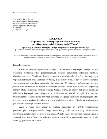Recenzja - prof. J. Wolnicki - Wydział Biologii i Ochrony Środowiska
