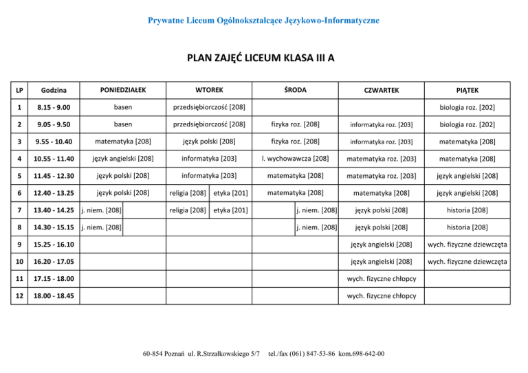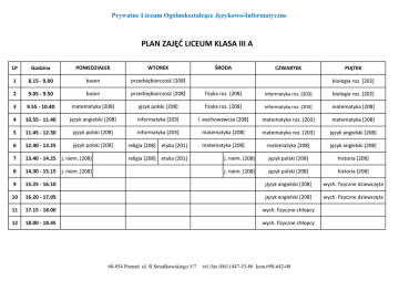 Prywatne Liceum Ogólnokształcące Językowo-Informatyczne PLAN ZAJĘĆ LICEUM KLASA III A LP Godzina PONIEDZIAŁEK WTOREK 1 8.15 - 9.00 basen przedsiębiorczośd [208] 2 9.05 - 9.50 basen przedsiębiorczośd [208] fizyka roz. [208] informatyka roz. [203] biologia roz. [202] 3 9.55 - 10.40 matematyka [208] język polski [208] fizyka roz. [208] informatyka roz. [203] matematyka [208] 4 10.55 - 11.40 język angielski [208] informatyka [203] l. wychowawcza [208] matematyka roz. [203] matematyka [208] 5 11.45 - 12.30 język polski [208] informatyka [203] matematyka [208] matematyka roz. [203] język angielski [208] 6 12.40 - 13.25 język polski [208] religia [208] etyka [201] matematyka [208] matematyka [208] język angielski [208] 7 13.40 - 14.25 j. niem. [208] j. niem. [208] język polski [208] historia [208] 8 14.30 - 15.15 j. niem. [208] j. niem. [208] język polski [208] historia [208] 9 15.25 - 16.10 język angielski [208] wych. fizyczne dziewczęta 10 16.20 - 17.05 język angielski [208] wych. fizyczne dziewczęta 11 17.15 - 18.00 wych. fizyczne chłopcy 12 18.00 - 18.45 wych. fizyczne chłopcy religia [208] etyka [201] 60-854 Poznań ul. R.Strzałkowskiego 5/7 ŚRODA CZWARTEK PIĄTEK biologia roz. [202] tel./fax (061) 847-53-86 kom.698-642-00