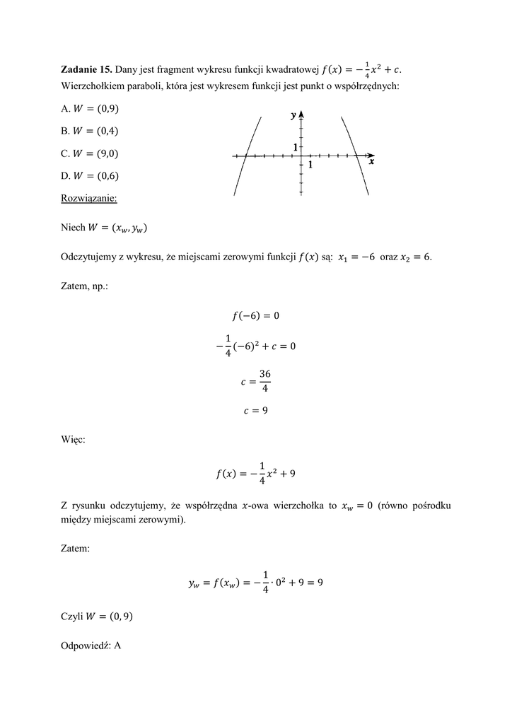 ଵ Zadanie 15. Dany jest fragment wykresu funkcji kwadratowej ଶ . ସ Wierzchołkiem paraboli, która jest wykresem funkcji jest punkt o współrzędnych: A. 0,9 B. 0,4 C. 9,0 D. 0,6 Rozwiązanie: Niech ௪ , ௪ Odczytujemy z wykresu, że miejscami zerowymi funkcji są: ଵ 6 oraz ଶ 6. Zatem, np.: 6 0 1 6ଶ 0 4 36 4 9 Więc: 1 ଶ 9 4 Z rysunku odczytujemy, że współrzędna -owa wierzchołka to ௪ 0 (równo pośrodku między miejscami zerowymi). Zatem: 1 ௪ ௪ ∙ 0ଶ 9 9 4 Czyli 0, 9 Odpowiedź: A