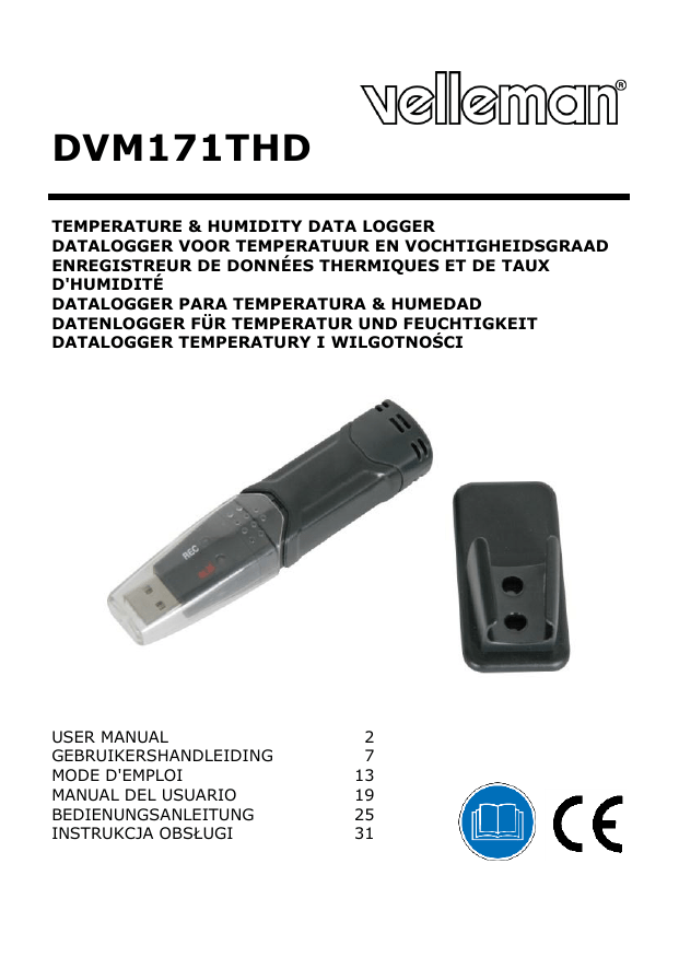 DVM171THD TEMPERATURE & HUMIDITY DATA LOGGER DATALOGGER VOOR TEMPERATUUR EN VOCHTIGHEIDSGRAAD ENREGISTREUR DE DONNÉES THERMIQUES ET DE TAUX D'HUMIDITÉ DATALOGGER PARA TEMPERATURA & HUMEDAD DATENLOGGER FÜR TEMPERATUR UND FEUCHTIGKEIT DATALOGGER TEMPERATURY I WILGOTNOŚCI USER MANUAL GEBRUIKERSHANDLEIDING MODE D'EMPLOI MANUAL DEL USUARIO BEDIENUNGSANLEITUNG INSTRUKCJA OBSŁUGI 2 7 13 19 25 31 DVM171THD USER MANUAL 1. Introduction To all residents of the European Union Important environmental information about this product This symbol on the device or the package indicates that disposal of the device after its lifecycle could harm the environment. Do not dispose of the unit (or batteries) as unsorted municipal waste; it should be taken to a specialized company for recycling. This device should be returned to your distributor or to a local recycling service. Respect the local environmental rules. If in doubt, contact your local waste disposal authorities. Thank you for choosing Velleman! Please read the manual thoroughly before bringing this device into service. If the device was damaged in transit, do not install or use it and contact your dealer. 2. Safety Instructions Keep this device away from rain, moisture, splashing and dripping liquids. 3. Keep this device away from children and unauthorized users. Protect this device from shocks and abuse. Avoid brute force when operating the device. Keep this device away from dust and extreme temperatures. General Guidelines Refer to the Velleman® Service and Quality Warranty on the last pages of this manual. This device is battery-operated, using one 3.6 V lithium battery (½ AA). Familiarise yourself with the functions of the device before actually using it. All modifications of the device are forbidden for safety reasons. Damage caused by user modifications to the device is not covered by the warranty. Only use the device for its intended purpose. Using the device in an unauthorised way will void the warranty. Damage caused by disregard of certain guidelines in this manual is not covered by the warranty and the dealer will not accept responsibility for any ensuing defects or problems. Do not use outside the technical specifications (see §10). 4. Features memory for 32 000 readings (16 000 temperature and 16 000 humidity readings) dew point indication status indication USB interface for setup and data download user-programmable alarm thresholds for temperature and humidity V. 04 – 06/07/2016 2 ©Velleman nv DVM171THD 5. analysis software: software in English only, for Windows® XP, Vista, Windows 7, 8.1 and 10 (32 and 64 bit) multi-mode to start logging long battery life selectable measuring cycle: 2 s, 5 s, 10 s, 30 s, 1 min, 5 min, 10 min, 30 min, 1 h, 2 h, 3 h, 6 h, 12 h, 24 h. Use 1. 2. 3. 4. 5. 6. 7. protective cover USB connector to PC port start button RH and temperature sensors alarm LED (red/yellow) recording LED (green) mounting bracket 1. First, install the data logger software on a personal computer, by inserting the enclosed disc into the CD drive and following the instructions on the screen. 2. Remove the protective cover [1] from the data logger, plug the data logger into a free USB slot on the personal computer and start the data logger software. 3. Set up the data logger software and press the Setup button. Refer to the help function of the data logger software (Help > Help topics…) for more information on the use of the software and setup of the data logger. 4. Remove the data logger from the USB slot and place back the protective cover [1]. 5. Place the device in a location where recording of ambient temperature and/or relative humidity is required. Refer to the technical specifications for allowed operating temperature range. V. 04 – 06/07/2016 3 ©Velleman nv DVM171THD 6. If the data logger is set up to start manually (delayed start), the green LED [6] will flash two times every 10 seconds. Press the Start button [3] until the green [6] and yellow LED [5] flash once (together). The data logger starts logging and the green LED [6] will flash every 10 seconds (increase this value through the setup procedure to increase battery life). 7. To download the data into the personal computer, start the data logger software, remove the protective cover [1] and plug the data logger into a free USB slot. Refer to the help function of the data logger software (Help > Help topics…) for more information on downloading and handling the data from the data logger. 6. Troubleshooting Both LEDs are off Logging is not active or battery is low. Start logging or replace battery. Green REC LED [6], flashes 1 x every 10 seconds Logging, no alarm condition. 1x Green REC LED [6], flashes 2 x every 10 seconds Delayed start mode. 2x 1x 2x 1x 1x 2x 1x Red ALM LED [5], flashes 1 x every 10 seconds Logging, humidity lower limit exceeded. Red ALM LED [5], flashes 2 x every 10 seconds Logging, humidity upper limit exceeded. Red ALM LED [5], flashes 1 x every 60 seconds Low battery. Logging will stop, replace battery and download data. Yellow ALM LED [5], flashes 1 x every 10 seconds Logging, temperature lower limit exceeded. Yellow ALM LED [5], flashes 2 x every 10 seconds Logging, temperature higher limit exceeded. Yellow ALM LED [5], flashes 1 x every 60 seconds Logger memory full. Logging will stop, download data. V. 04 – 06/07/2016 4 ©Velleman nv DVM171THD Notes: In case of one alarm, the green REC LED [6] and the red or yellow ALM LED [5] will blink alternately every 10 seconds. When two alarms occur (e.g. humidity alarm and temperature alarm), only the ALM LED [5] will blink, showing alternately the first and second alarm every 10 seconds. However, the unit cannot show both the upper and lower alarm. For example, if both the upper and lower humidity limits have been exceeded during one test period, the unit indicates either the upper or the lower alarm. Download the data to your PC to see the details of the alarms. When the battery is low