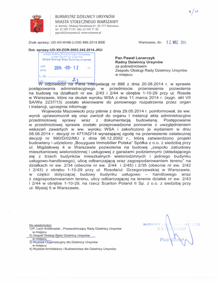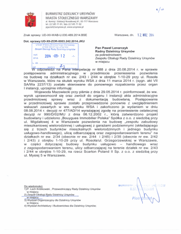 BURMISTRZ DZIELNICY URSYNÓW MIASTA STOŁECZNEGO WARSZAWY al. Komisji Edukacji Narodowej 61, 02-777 Warszawa tel, 22 545 71 01, faks 22 545 71 02 [email protected], www.ursynow.pl Znak sprawy: UD-XII-WAB-U.030.489.2014.BSE Warszawa, dn. 1 2. WRl. 2014 Dot. sprawy: UD-XII-ZOR-0003.242.2014.JKU Urząd Miasta S:O!cczr:cgo Warszawy Urz ac Dz:ch:cy \..J'syr:ów Zespól Obslugi Rady Dzielnicy Ursynów wpł. dnia L. 2014 -09- 1 2 oz zal. odpis .. 2.S -1- . Pan Paweł Lenarczyk Radny Dzielnicy Ursynów za pośrednictwem Zespołu Obsługi Rady Dzielnicy Ursynów w miejscu . powie Zl pelację nr 888 z dnia 20.08.2014 r. W sprawie postępowania administracyjnego w przedmiocie przeniesienia pozwolenia na budowę na działkach nr ew. 2/43 i 2/44 w obrębie 1-10-29 przy ul. Rosoła w Warszawie, które na skutek wyroku WSA z dnia 11 marca 2014 r. (sygn. akt VII SAlWa 2237/13) zostało skierowane do ponownego rozpatrzenia przez organ I instancji, uprzejmie informuję: Wojewoda Mazowiecki przy piśmie z dnia 29.05.2014 r. poinformował, że ww. wyrok uprawomocnił się oraz zwrócił do organu I instancji akta administracyjne przedmiotowej sprawy wraz z dokumentacją budowlaną. Postępowanie w przedmiotowej sprawie zostało przeprowadzone ponownie z uwzględnieniem wskazań zawartych w ww. wyroku WSA i zakończono je wydaniem w dniu 08.08.2014 r. decyzji nr 477/AD/14 wyrażającej zgodę na przeniesienie ostatecznej decyzji nr 990/D/02/MU z dnia 06.12.2002 r., którą zatwierdzono projekt budowlany i udzielono .Bouyques Immobilier Polska" Spółka z 0.0. z siedzibą przy ul. Migdałowej 4 w Warszawie pozwolenia na budowę "zespołu zabudowy mieszkaniowej wielorodzinnej i usługowej z garażami podziemnymi (składającego się z trzech budynków mieszkalnych wielorodzinnych i jednego budynku usługowo-handlowego), ulicą odbarczającą oraz zagospodarowaniem terenu" na działkach nr ew. 2/34 (obecnie nr ew. 2/44 i 2/45) i 2/35 (obecnie nr ew. 2/42 i 2/43) z obrębu 1-10-29 przy ul. Rosoła/ul. Grzegorzewskiej w Warszawie, w części dotyczącej budowy budynku usługowo handlowego wraz z zagospodarowaniem terenu, ulicy odbarczającej na terenie działek nr ew. 2/43 i 2/44 w obrębie 1-10-29, na rzecz Scarton Poland II Sp. z 0.0. z siedzibą przy ul. Mysiej 5 w Warszawie. O Do wiadomości: 1)P. Lech Królikowski, Przewodniczący Rady Dzielnicy Ursynów w miejscu 2) Zespół Obsłl.igLĘady Dzielnicy Ursynów w miejscu 3) Wydział Organizacyjny dla Dzielnicy Ursynów w miejscu 4) Wydział Architektury i Budownictwa dla Dzielnicy Ursynów; D\JNtI11~'rl" f\ .. _ .. Pi