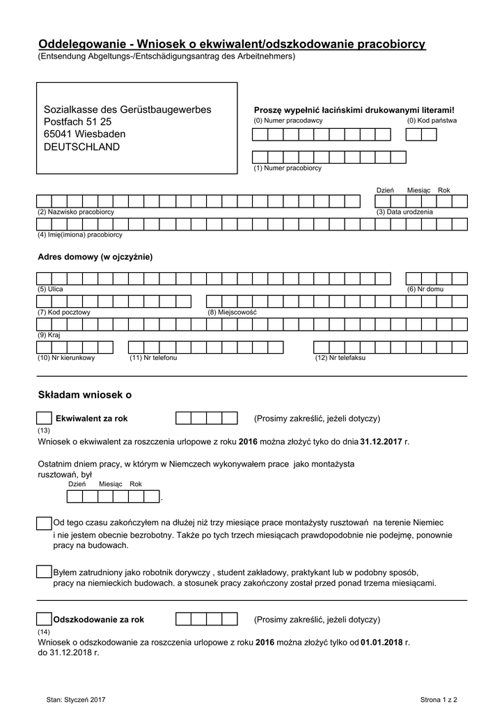 Oddelegowanie - Wniosek o ekwiwalent/odszkodowanie pracobiorcy (Entsendung Abgeltungs-/Entschädigungsantrag des Arbeitnehmers) Sozialkasse des Gerüstbaugewerbes Postfach 51 25 65041 Wiesbaden DEUTSCHLAND Proszę wypełnić łacińskimi drukowanymi literami! (0) Numer pracodawcy (0) Kod państwa (1) Numer pracobiorcy Dzień (2) Nazwisko pracobiorcy Miesiąc Rok (3) Data urodzenia (4) Imię(imiona) pracobiorcy Adres domowy (w ojczyźnie) (5) Ulica (6) Nr domu (7) Kod pocztowy (8) Miejscowość (9) Kraj (10) Nr kierunkowy (11) Nr telefonu (12) Nr telefaksu Składam wniosek o Ekwiwalent za rok (Prosimy zakreślić, jeżeli dotyczy) (13) Wniosek o ekwiwalent za roszczenia urlopowe z roku 2016 można złożyć tyko do dnia 31.12.2017 r. Ostatnim dniem pracy, w którym w Niemczech wykonywałem prace jako montażysta rusztowań, był Dzień Miesiąc Rok . Od tego czasu zakończyłem na dłużej niż trzy miesiące prace montażysty rusztowań na terenie Niemiec i nie jestem obecnie bezrobotny. Także po tych trzech miesiącach prawdopodobnie nie podejmę, ponownie pracy na budowach. Byłem zatrudniony jako robotnik dorywczy , student zakładowy, praktykant lub w podobny sposób, pracy na niemieckich budowach. a stosunek pracy zakończony został przed ponad trzema miesiącami. Odszkodowanie za rok (Prosimy zakreślić, jeżeli dotyczy) (14) Wniosek o odszkodowanie za roszczenia urlopowe z roku 2016 można złożyć tylko od 01.01.2018 r. do 31.12.2018 r. Stan: Styczeń 2017 Strona 1 z 2 Oddelegowanie - Wniosek o ekwiwalent/odszkodowanie pracobiorcy (1) Numer pracobiorcy Rachunek bankowy Przysługujący/e mi ekwiwalent/odszkodowanie ma zostać przelany/e na następujący rachunek bankowy: (15) Nazwa banku (16) Kod pocztowy (17) Miejscowość (18) Kraj (19) Kod bankowy /klucz bankowy / kod banku (20) Numer rachunku (21) SWIFT-CODE / BIC (22) IBAN (23) Posiadacz rachunku bankowego (Jeżeli pracobiorca nie jest posiadaczem powyższego rachunku bankowego, proszę załączyć do swojego wniosku kopię swojego paszportu w celu udowodnienia tożsamności. Ekwiwalent i odszkodowanie są wypłatami SOKA Gerüstbau bezpośrednio na rzecz pracobiorcay , niezależnie od pracodawcy.) Do dokumentów należy dołączyć: Podpisany przez pracodawcę wyciąg z kąta pracownika. Moim podpisem zapewniam jako pracobiorca zgodność moich danych. (24) Data / Podpis pracobiorcy Stan: Styczeń 2017 Strona 2 z 2