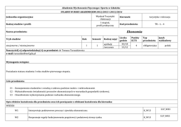 Akademia Wychowania Fizycznego i Sportu w Gdańsku SYLABUS W ROKU AKADEMICKIM 2012/2013 i 2013/2014 Jednostka organizacyjna: Wydział Turystyki i Rekreacji Kierunek: Rodzaj studiów i profil: I stopień, profil praktyczny Kod przedmiotu: turystyka i rekreacja TR – L - 4 Ekonomia Nazwa przedmiotu: Tryb studiów Rok stacjonarne / niestacjonarne I Semestr 1 Rodzaj zajęć wykłady ćwiczenia Liczba godzin 30/18 15/12 Punkty ECTS 4 Typ przedmiotu obligatoryjny Język wykładowy polski Nauczyciel(-e) odpowiedzialny(-i) za przedmiot: dr Tomasz Taraszkiewicz e-mail: [email protected] Wymagania wstępne: Posiadanie statusu studenta I roku studiów pierwszego stopnia. Cele przedmiotu: C1 - Zaznajomienie studentów z wiedzą z zakresu podstaw makro- i mikroekonomii. C2 - Wykształtowanie świadomości procesów ekonomicznych w warunkach gospodarki rynkowej. C3 - Umożliwienie wykorzystania podstaw rachunku ekonomicznego. Opis efektów kształcenia dla przedmiotu oraz ich powiązanie z efektami kształcenia dla kierunku: WIEDZA W1 Interpretuje podstawowe procesy i zjawiska ekonomiczne. K_W13 W2 Rozpoznaje reguły funkcjonowania popytowej i podażowej strony rynku. K_W13 S1P_W03 S1P_W03 UMIEJĘTNOŚCI U1 Analizuje mechanizmy gospodarcze w obszarze makro- i mikroekonomii. U2 Rozpoznaje zasady funkcjonowania podmiotów rynkowych. U3 Ocenia zjawiska gospodarcze na podstawie wskaźników ekonomicznych. K_U09 S1P_U02 S1P_U03 K_U09 S1P_U02 S1P_U03 K_U09 S1P_U02 S1P_U03 K_K06, S1P_K04 S1P_K07 K_K06, S1P_K04 S1P_K07 KOMPETENCJE K1 K2 Wykorzystuje nabyte kompetencje ekonomiczne dla korzyści personalnych i społecznych. Ocenia wpływ podejmowanych działań ekonomicznych na społeczeństwo, gospodarstwo rodzinne, zakład pracy. Kryteria i metody oceny osiągniętych efektów kształcenia: W1 – analiza aktualnych procesów, kolokwium, egzamin W2 – kolokwium, egzamin U1 – analiza aktualnych procesów, kolokwium, egzamin U2 – analiza aktualnych procesów, kolokwium, egzamin U3 – analiza aktualnych procesów, kolokwium, egzamin K1 – kolokwium, egzamin K2 – kolokwium, egzamin Przy ocenianiu efektów kształcenia pod uwagę brane są: aktywność na zajęciach, pisemne kolokwium zaliczeniowe, egzamin pisemny. Na aktywność na zajęciach składają się: - omawianie wybranych zadań domowych, - udział w przeglądzie najważniejszych wydarzeń gospodarczych tygodnia, z analizą ich wpływu na sytuację w kraju i na świecie, - studia przypadków lokalnych, krajowych i zagranicznych z rozwiązywaniem problemów decyzyjnych. Pisemne kolokwium zaliczeniowe – test wyboru – stanowi zestaw pytań odnoszących się do problematyki przedmiotu omawianej na ćwiczeniach. Na ocenę końcową z ćwiczeń składają się: ocena aktywności na zajęciach (40%) i ocena z kolokwium końcowego (60%). Otrzymanie pozytywnej oceny końcowej z ćwiczeń uwarunkowane jest uzyskaniem ocen składowych przynajmniej na poziomie dostatecznym. Pisemny egzamin końcowy – test wyboru – stanowi zestaw pytań odnoszących się do problematyki przedmiotu omawianej na ćwiczeniach i wykładach. Przystąpienie do egzaminu uwarunkowane jest uzyskaniem pozytywnej oceny z ćwiczeń. Aby uzyskać zaliczenie przedmiotu na ocenę dostateczną student musi osiągnąć wszystkie wymienione w programie efekty kształcenia. Metody i formy realizacji przedmiotu: Wykłady: prezentacja, metoda sytuacyjna, studium przypadków, dyskusja moderowana. Ćwiczenia: prezentacja, metoda sytuacyjna, twórczego myślenia, studium przypadków, dyskusja moderowana. Treści kształcenia: Wykłady: 1. Wprowadzenie teoretyczne. Typologia rynków. Zamknięty obieg pieniężny i rzeczowy w gospodarce. Gospodarka rynkowa, ekonomiczne myślenie, rzadkość, ograniczoność zasobów. 2. Krzywa możliwości produkcyjnych. Czynniki produkcji, koszt alternatywny. Efektywność ekonomiczna 3. Teoria popytu i podaży. Wielkość, krzywa, rodzaje, determinanty popytu. Wielkość, krzywa, rodzaje, determinanty podaży. Nadwyżka rynkowa. Niedobór rynkowy, cena maksymalna i minimalna. 4. Elastyczności w ekonomii cz. 1. Elastyczność cenowa popytu, elastyczność cenowa podaży. 5. Elastyczności w ekonomii cz. 2. Elastyczność dochodowa popytu, elastyczność krzyżowa, krzywa Engla. 6. Teoria konsumenta. I i II prawo Gossena. Równowaga konsumenta. Krańcowa stopa substytucji, krzywe obojętności dla różnych dóbr. 7. Teoria produkcji. Produkt krańcowy, przeciętny i całkowity, prawo malejącej produktywności. Elastyczność produkcji względem czynnika zmiennego. Najtańsza kombinacja czynników wytwórczych. 8. Koszty ekonomiczne. Koszty własne, społeczne, całkowite, stałe, zmienne, przeciętne, krańcowe, jawne, ukryte, amortyzacja, księgowe, zysk księgowy, normalny, ekonomiczny, stopy procentowe nominalne i realne. 9. Modele rynkowe. Determinanty występowania, warunki funkcjonowania, podobieństwa i różnice w modelach rynkowych: konkurencji doskonałej, monopolistycznej, monopolu, oligopolu; różnicowanie cen, zmowa, kartel. 10. Rachunek dochodu narodowego. PKB, PNB. Konsumpcja, inwestycje, oszczędności, wydatki rządowe, handel zagraniczny. Wzrost gospodarczy. Cykle koniunkturalne. Gospodarka międzynarodowa i europejska. Globalizacja. 11. Inflacja i bezrobocie. Przyczyny, rodzaje, skutki, przeciwdziałanie. 12. Pieniądz i system bankowy. Bank centralny i polityka monetarna. 13. Polityka budżetowa. Budżet państwa. Deficyt budżetowy i dług publiczny. System podatkowy. Ćwiczenia: 1. Wprowadzenie teoretyczne. Typologia rynków. Zamknięty obieg pieniężny i rzeczowy w gospodarce. Gospodarka rynkowa, ekonomiczne myślenie, rzadkość, ograniczoność zasobów. 2. Krzywa możliwości produkcyjnych. Czynniki produkcji, koszt alternatywny. Efektywność ekonomiczna 3. Teoria popytu i podaży. Wielkość, krzywa, rodzaje, determinanty popytu. Wielkość, krzywa, rodzaje, determinanty podaży. Nadwyżka rynkowa. Niedobór rynkowy, cena mak
