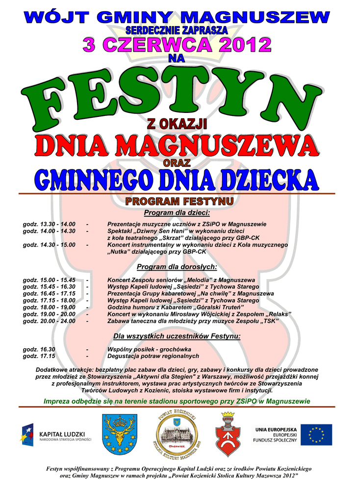 Program dla dzieci: godz. 13.30 - 14.00 godz. 14.00 - 14.30 - godz. 14.30 - 15.00 - Prezentacje muzyczne uczniów z ZSiPO w Magnuszewie Spektakl „Dziwny Sen Hani” w wykonaniu dzieci z koła teatralnego „Skrzat” działającego przy GBP-CK Koncert instrumentalny w wykonaniu dzieci z Koła muzycznego „Nutka” działającego przy GBP-CK Program dla dorosłych: godz. 15.00 - 15.45 godz. 15.45 - 16.30 godz. 16.45 - 17.15 godz. 17.15 - 18.00 godz. 18.00 - 19.00 godz. 19.00 - 20.00 godz. 20.00 - 24.00 - Koncert Zespołu seniorów „Melodia” z Magnuszewa Występ Kapeli ludowej „Sąsiedzi” z Tychowa Starego Prezentacja Grupy kabaretowej „Na chwilę” z Magnuszewa Występ Kapeli ludowej „Sąsiedzi” z Tychowa Starego Godzina humoru z Kabaretem „Góralski Truteń” Koncert w wykonaniu Mirosławy Wójcickiej z Zespołem „Relaks” Zabawa taneczna dla młodzieży przy muzyce Zespołu „TSK” Dla wszystkich uczestników Festynu: godz. 16.30 godz. 17.15 - Wspólny posiłek - grochówka Degustacja potraw regionalnych Dodatkowe atrakcje: bezpłatny plac zabaw dla dzieci, gry, zabawy i konkursy dla dzieci prowadzone przez młodzież ze Stowarzyszenia „Aktywni dla Stegien" z Warszawy, możliwość przejażdżki konnej z profesjonalnym instruktorem, wystawa prac artystycznych twórców ze Stowarzyszenia Twórców Ludowych z Kozienic, stoiska wystawowe firm i instytucji. Impreza odbędzie się na terenie stadionu sportowego przy ZSiPO w Magnuszewie Festyn współfinansowany z Programu Operacyjnego Kapitał Ludzki oraz ze środków Powiatu Kozienickiego oraz Gminy Magnuszew w ramach projektu „Powiat Kozienicki Stolica Kultury Mazowsza 2012”