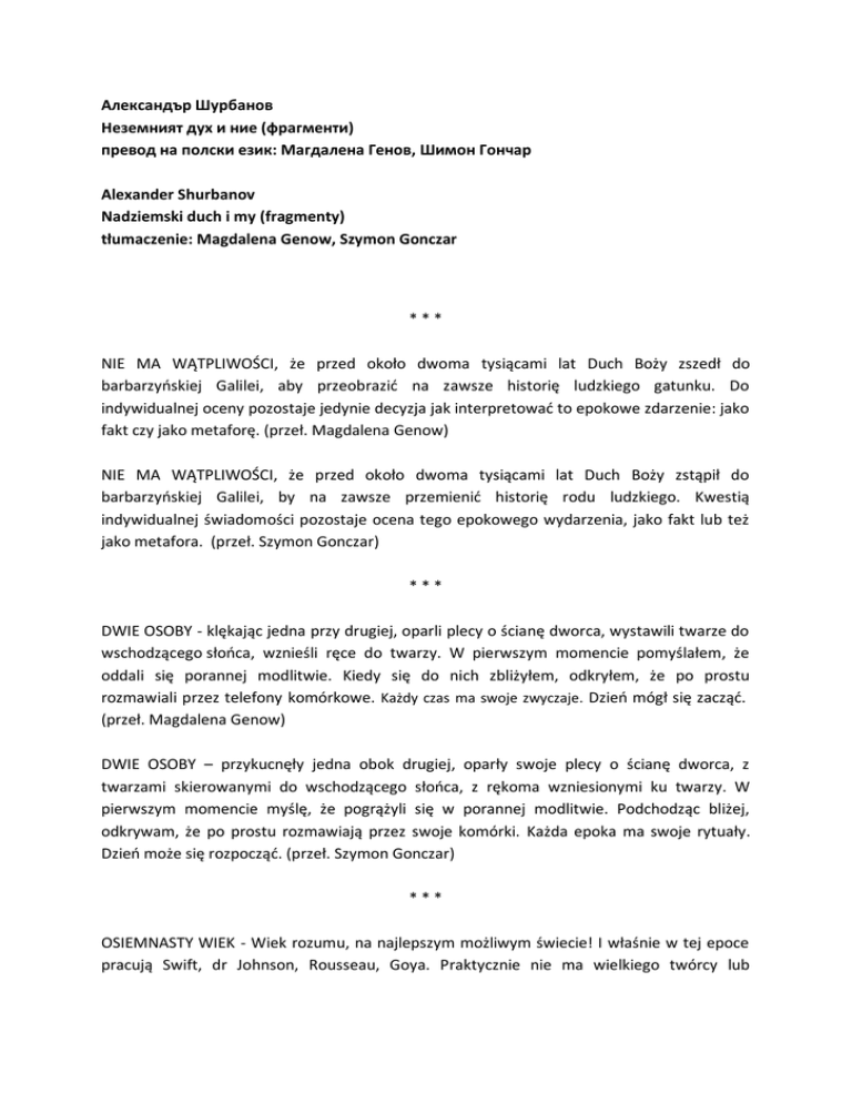 Александър Шурбанов Неземният дух и ние (фрагменти) превод на полски език: Магдалена Генов, Шимон Гончар Alexander Shurbanov Nadziemski duch i my (fragmenty) tłumaczenie: Magdalena Genow, Szymon Gonczar *** NIE MA WĄTPLIWOŚCI, że przed około dwoma tysiącami lat Duch Boży zszedł do barbarzyńskiej Galilei, aby przeobrazić na zawsze historię ludzkiego gatunku. Do indywidualnej oceny pozostaje jedynie decyzja jak interpretować to epokowe zdarzenie: jako fakt czy jako metaforę. (przeł. Magdalena Genow) NIE MA WĄTPLIWOŚCI, że przed około dwoma tysiącami lat Duch Boży zstąpił do barbarzyńskiej Galilei, by na zawsze przemienić historię rodu ludzkiego. Kwestią indywidualnej świadomości pozostaje ocena tego epokowego wydarzenia, jako fakt lub też jako metafora. (przeł. Szymon Gonczar) *** DWIE OSOBY - klękając jedna przy drugiej, oparli plecy o ścianę dworca, wystawili twarze do wschodzącego słońca, wznieśli ręce do twarzy. W pierwszym momencie pomyślałem, że oddali się porannej modlitwie. Kiedy się do nich zbliżyłem, odkryłem, że po prostu rozmawiali przez telefony komórkowe. Każdy czas ma swoje zwyczaje. Dzień mógł się zacząć. (przeł. Magdalena Genow) DWIE OSOBY – przykucnęły jedna obok drugiej, oparły swoje plecy o ścianę dworca, z twarzami skierowanymi do wschodzącego słońca, z rękoma wzniesionymi ku twarzy. W pierwszym momencie myślę, że pogrążyli się w porannej modlitwie. Podchodząc bliżej, odkrywam, że po prostu rozmawiają przez swoje komórki. Każda epoka ma swoje rytuały. Dzień może się rozpocząć. (przeł. Szymon Gonczar) *** OSIEMNASTY WIEK - Wiek rozumu, na najlepszym możliwym świecie! I właśnie w tej epoce pracują Swift, dr Johnson, Rousseau, Goya. Praktycznie nie ma wielkiego twórcy lub myśliciela, który nie byłby szalony lub na granicy szaleństwa. Widocznie ludzka natura nie może znieść nadmiaru optymizmu lżej niż wpadając w pesymizm. (przeł. Magdalena Genow) OSIEMNASTY WIEK – Wiek rozumu, najlepszego ze wszystkich możliwych światów! I właśnie w tej epoce tworzy Swift, dr Johnson, Rousseau, Goya. Nie ma wielkiego twórcy czy też myśliciela, który nie był szalony, lub znajdowałby się na krawędzi rozumu. Zdaje się, że natura ludzka nie może znieść przeciążenia optymizmem łatwiej, aniżeli pesymizmem. (przeł. Szymon Gonczar) *** CZYM JEST CZŁOWIEK - łysiejącym zwierzęciem czy upadłym aniołem? W obydwu przypadkach poszkodowany i ekskomunikowany. W sercu tli się niejasne wspomnienie jakiejś wiecznej straty, jakiegoś tępego niesłabnącego bólu, paląca rana - jakby śladu czegoś, wyrwanego z korzeniami. (przeł. Magdalena Genow) CZYM JEST CZŁOWIEK – wyłysiałym zwierzęciem czy upadłym aniołem? W obu przypadkach jest poszkodowany i odseparowany. W jego sercu tli się niewyraźne wspomnienie jakiejś przedwiecznej straty, tępy nieustanny ból, ziejąca rana – jako ślad po czymś wyrwanym z korzeniami. (przeł. Szymon Gonczar) *** KIEDY ŚNISZ o bliskich, ulubionych ludziach dwadzieścia - trzydziści lat po ich śmierci, to jakby byli obok ciebie i nigdy się z nimi nie rozłączałeś, jak to się dzieje, że nawet przez chwilę nie zdajesz sobie sprawy z prawdy? Nieprawdaż, że umysł, który śni jest tym samym, który cię prowadzi za jawie? Jak i dlaczego w całości wyłącza, wymazuje z siebie ten niby bezpowrotnie miniony czas. A może czas nie jest zwykłym dopełnieniem, czwartym wymiarem naszego bytu, tylko samo przez się wyraża pewną, złożoną przestrzeń z niezliczoną ilością kierunków, którą tylko sen może otworzyć i które są dla nas śmiertelnie niedostępne w naszej, płaskiej, jednostronnej jawie? (przeł. Magdalena Genow) KIEDY ŚNISZ o swoich bliskich, ukochanych osobach dwadzieścia-trzydzieści lat po ich śmierci, jakby wciąż byli przy tobie i nigdy się z nimi nie rozdzieliłeś, jak to jest, że nawet przez chwilę nie przypominasz sobie prawdy? Czy rozum, który śni, jest tym samym, który prowadzi cię na jawie? Jak i dlaczego całkowicie usuwa, wymazuje z siebie niby to bezpowrotnie miniony czas? Lub też czas nie jest po prostu jakimś dodatkowym, czwartym wymiarem naszego istnienia, lecz sam w sobie przedstawia jedną wielowymiarową przestrzeń z mnóstwem kierunków, które może otworzyć tylko sen i które stają się fatalnie niedostępne dla nas w płaskiej, jednokierunkowej jawie? (przeł. Szymon Gonczar) *** PORANEK jest jasny i słoneczny. Na jeszcze nierozkwitłych, rzadkich koronach dalekich drzew wiszą ciemne sfery - jak zaplątane w gałęzie kosmate balony. To są gniazda wron. Pytam się, dlaczego ptaki wolą zakładać swoje domy tam, jak najwyżej nad ziemią. Na pewno ten wybór ma proste praktyczne przyczyny: na przykład z góry jest prościej wylecieć, a i wrogów jest mniej. Jednak dla nas, ludzi, ptasia wysokość ma daleko bardziej przesądne znaczenie. Jeśli nie ona, czy kiedykolwiek wpadłoby nam do głowy, że oprócz chodzenia po ziemi, moglibyśmy też latać po niebie? Po niebie i nad nim. I co ważniejsze - czy nasze myśli byłyby skłonne sobie wyobrazić, że tam, nad nami mogą istnieć inni, niewidzialne na ten czas stworzenia i osady? Że oprócz horyzontalnego istnieje także wertykalny świat... (przeł. Magdalena Genow) RANEK jest czysty i słoneczny. W niepokrytych jeszcze liśćmi, rzadkich koronach dalekich drzew wiszą ciemne kule – niczym zaplątane w gałęziach, pokryte mchem balony. To są gniazda wron. Pytam się dlaczego ptaki te wolą budować swoje domy, jak nawyżej od ziemi. Z pewnością wybór ten ma swoje praktyczne przyczyny: na przykład na górze łatwiej jest im wzlecieć, a i wrogów jest mniej. Ale dla nas ludzi ptasia wysokość ma bardziej istotne znaczenie. Gdyby jej nie było, to czy przyszłoby nam kiedykolwiek na myśl, że oprócz pełzania