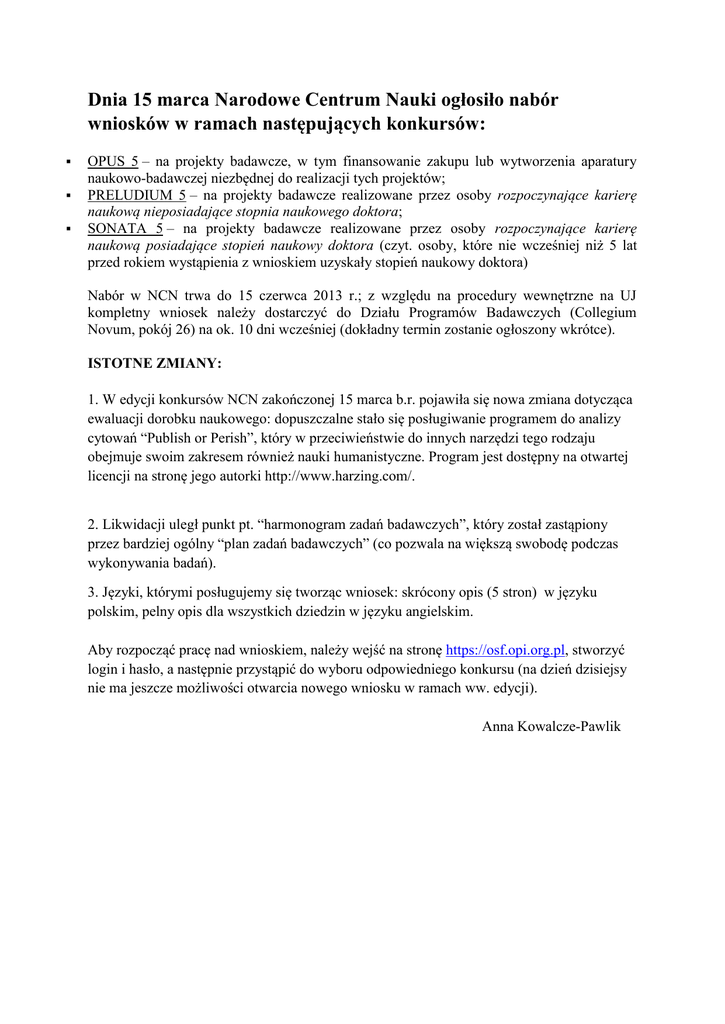 Dnia 15 marca Narodowe Centrum Nauki ogłosiło nabór wniosków w ramach następujących konkursów: OPUS 5 – na projekty badawcze, w tym finansowanie zakupu lub wytworzenia aparatury naukowo-badawczej niezbędnej do realizacji tych projektów; PRELUDIUM 5 – na projekty badawcze realizowane przez osoby rozpoczynające karierę naukową nieposiadające stopnia naukowego doktora; SONATA 5 – na projekty badawcze realizowane przez osoby rozpoczynające karierę naukową posiadające stopień naukowy doktora (czyt. osoby, które nie wcześniej niż 5 lat przed rokiem wystąpienia z wnioskiem uzyskały stopień naukowy doktora) Nabór w NCN trwa do 15 czerwca 2013 r.; z względu na procedury wewnętrzne na UJ kompletny wniosek należy dostarczyć do Działu Programów Badawczych (Collegium Novum, pokój 26) na ok. 10 dni wcześniej (dokładny termin zostanie ogłoszony wkrótce). ISTOTNE ZMIANY: 1. W edycji konkursów NCN zakończonej 15 marca b.r. pojawiła się nowa zmiana dotycząca ewaluacji dorobku naukowego: dopuszczalne stało się posługiwanie programem do analizy cytowań “Publish or Perish”, który w przeciwieństwie do innych narzędzi tego rodzaju obejmuje swoim zakresem również nauki humanistyczne. Program jest dostępny na otwartej licencji na stronę jego autorki http://www.harzing.com/. 2. Likwidacji uległ punkt pt. “harmonogram zadań badawczych”, który został zastąpiony przez bardziej ogólny “plan zadań badawczych” (co pozwala na większą swobodę podczas wykonywania badań). 3. Języki, którymi posługujemy się tworząc wniosek: skrócony opis (5 stron) w języku polskim, pelny opis dla wszystkich dziedzin w języku angielskim. Aby rozpocząć pracę nad wnioskiem, należy wejść na stronę https://osf.opi.org.pl, stworzyć login i hasło, a następnie przystąpić do wyboru odpowiedniego konkursu (na dzień dzisiejsy nie ma jeszcze możliwości otwarcia nowego wniosku w ramach ww. edycji). Anna Kowalcze-Pawlik