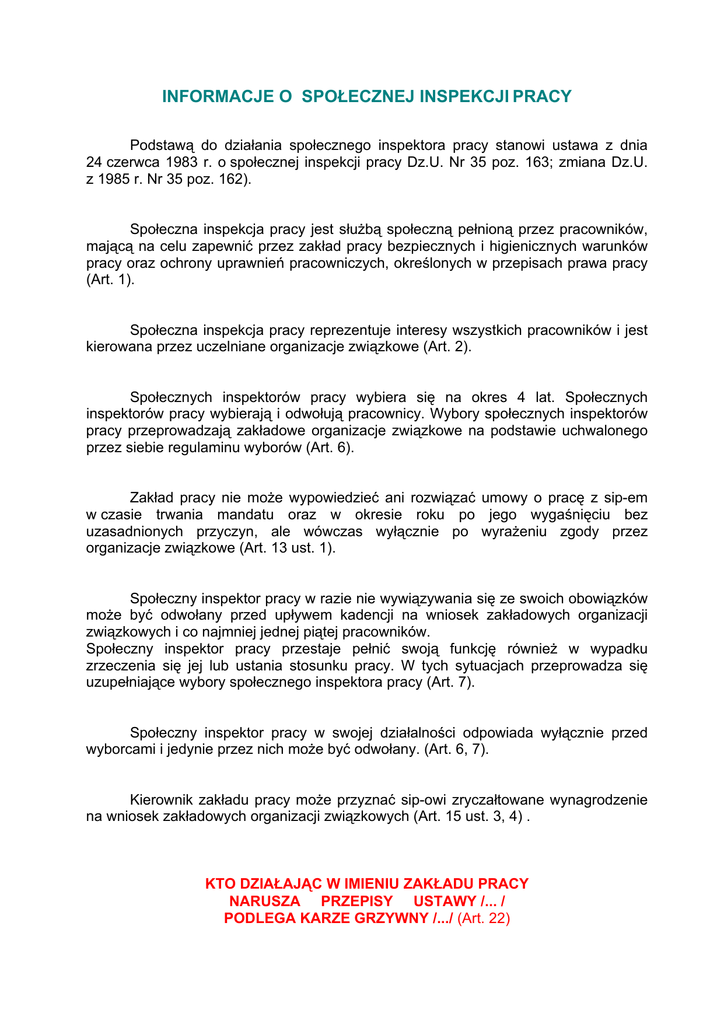 INFORMACJE O SPOŁECZNEJ INSPEKCJI PRACY Podstawą do działania społecznego inspektora pracy stanowi ustawa z dnia 24 czerwca 1983 r. o społecznej inspekcji pracy Dz.U. Nr 35 poz. 163; zmiana Dz.U. z 1985 r. Nr 35 poz. 162). Społeczna inspekcja pracy jest służbą społeczną pełnioną przez pracowników, mającą na celu zapewnić przez zakład pracy bezpiecznych i higienicznych warunków pracy oraz ochrony uprawnień pracowniczych, określonych w przepisach prawa pracy (Art. 1). Społeczna inspekcja pracy reprezentuje interesy wszystkich pracowników i jest kierowana przez uczelniane organizacje związkowe (Art. 2). Społecznych inspektorów pracy wybiera się na okres 4 lat. Społecznych inspektorów pracy wybierają i odwołują pracownicy. Wybory społecznych inspektorów pracy przeprowadzają zakładowe organizacje związkowe na podstawie uchwalonego przez siebie regulaminu wyborów (Art. 6). Zakład pracy nie może wypowiedzieć ani rozwiązać umowy o pracę z sip-em w czasie trwania mandatu oraz w okresie roku po jego wygaśnięciu bez uzasadnionych przyczyn, ale wówczas wyłącznie po wyrażeniu zgody przez organizacje związkowe (Art. 13 ust. 1). Społeczny inspektor pracy w razie nie wywiązywania się ze swoich obowiązków może być odwołany przed upływem kadencji na wniosek zakładowych organizacji związkowych i co najmniej jednej piątej pracowników. Społeczny inspektor pracy przestaje pełnić swoją funkcję również w wypadku zrzeczenia się jej lub ustania stosunku pracy. W tych sytuacjach przeprowadza się uzupełniające wybory społecznego inspektora pracy (Art. 7). Społeczny inspektor pracy w swojej działalności odpowiada wyłącznie przed wyborcami i jedynie przez nich może być odwołany. (Art. 6, 7). Kierownik zakładu pracy może przyznać sip-owi zryczałtowane wynagrodzenie na wniosek zakładowych organizacji związkowych (Art. 15 ust. 3, 4) . KTO DZIAŁAJĄC W IMIENIU ZAKŁADU PRACY NARUSZA PRZEPISY USTAWY /... / PODLEGA KARZE GRZYWNY /.../ (Art. 22) Społeczni Inspektorzy Pracy mają prawo (Art. 4, 8, 10, 17, 18): 1. wstępu o każdym czasie do pomieszczeń i urządzeń zakładu pracy, 2. kontrolować przestrzeganie przepisów prawa pracy, 3. żądać informacji oraz okazania dokumentów w sprawach wchodzących w zakres jego działania, 4. informować przełożonych o nieprzestrzeganiu przepisów prawa pracy wpisując uwagi w księdze uwag, 5. zwracać się o czasowe odsunięcie pracownika wykonującego pracę w sposób niebezpieczny lub bez dostatecznej znajomości przepisów i zasad bhp, 6. brać udział w ustalaniu okoliczności i przyczyn wypadków przy pracy, 7. brać udział w analizowaniu przyczyn wypadków przy pracy i zachorowań na choroby zawodowe, 8. opiniować projekty planów poprawy warunków bhp i planów rehabilitacji zawodowej oraz kontrolować realizację tych planów, 9. uczestniczyć w przeprowadzaniu społecznych przeglądów warunków pracy, 10.uczestniczyć w kontrolach dotyczących ochrony środowiska naturalnego, 11.wnioskować o przeprowadzenie przez Państwową Inspekcją Pracy kontroli lub wszczęcie postępowania w sprawach o wykroczenia, 12.uczestniczyć w kontrolach przeprowadzanych na terenie zakładu pracy przez PIP, 13.uczestniczyć w podsumowaniu kontroli (jej wyników) przeprowadzonych przez PIP, 14.korzystać z pomocy PIP. Zakład pracy ma obowiązek (Art. 12, 14, 15) : 1. założyć księgi uwag oraz księgę uwag i zaleceń, 2. ustalić miejsce przechowywania ksiąg (kierownik zakładu pracy), 3. zapewnić odpowiednie warunki realizacji zadań, 4. ponosić koszty związane z działalnością sip-a, 5. zwolnić sip-a z zajęć służbowych w celu uczestnictwa w naradach i szkoleniach oraz wykonywania swoich czynności w godzinach pracy z zachowaniem prawa do wynagrodzenia. Zakładowe organizacje związkowe kierują SIP (Art. 2, 6, 7, 13, 15), a mianowicie: 1. ustalają strukturę organizacyjną społecznej inspekcji pracy, 2. uchwalają regulamin wyborów i przeprowadzają wybory, 3. wnioskują do kierownika zakładu pracy o przyznanie sip-owi zryczałtowanego wynagrodzenia, 4. wnioskuję o odwołanie sip-a, 5. wyrażają zgodę na rozwiązanie stosunku pracy bez wypowiedzenia z winy sip-a.