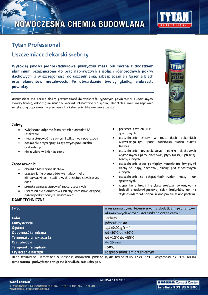 Tytan Professional Uszczelniacz dekarski srebrny Wysokiej jakości jednoskładnikowa plastyczna masa bitumiczna z dodatkiem aluminium przeznaczona do prac naprawczych i izolacji różnorodnych pokryd dachowych, a w szczególności do uszczelniania, zabezpieczania i łączenia blach oraz elementów metalowych. Po utwardzeniu tworzy gładką, srebrzystą powłokę. Uszczelniacz ma bardzo dobrą przyczepnośd do większości typowych powierzchni budowlanych. Tworzy trwałą, odporną na zmienne warunki atmosferyczne spoinę. Dodatek aluminium zapewnia zwiększoną odpornośd na promienie UV i starzenie. Nie zawiera azbestu. Zalety zwiększona odpornośd na promieniowanie UV i starzenie można stosowad na suchych i wilgotnych podłożach doskonale przyczepny do typowych powierzchni budowlanych nie zawiera włókien azbestu Zastosowanie obróbka blacharska dachów uszczelnianie przewodów wentylacyjnych, klimatyzacyjnych, spalinowych przechodzących przez dach szeroka gama zastosowao motoryzacyjnych uszczelnianie elementów z blachy, kominów, okapów, pasów podrynnowych, wiatrownic połączenia rynien i rur spustowych uszczelnianie złączy w materiałach dekarskich wszystkiego typu (papa, dachówka, blacha, blachy faliste) uszczelnianie przeciekających pokryd dachowych wykonanych z papy, dachówki, płyty falistej i płaskiej, blachy i innych uszczelnianie złącz pomiędzy materiałami kryjącymi dachy np. papy, dachówki, blachy, płyt azbestowych i innych uszczelnianie na połączeniach rynien, koszy i rur spustowych wypełnianie bruzd i styków podczas wykonywania izolacji przeciwwilgociowej ścian budynków np. na styku fundament-ściana, ściana piwnic-ściana parteru DANE TECHNICZNE Skład Kolor Konsystencja Gęstośd Odpornośd termiczna Temperatura nakładania Czas obróbki Temperatura zapłonu Czyszczenie narzędzi mieszanina żywic bitumicznych z dodatkiem pigmentów aluminiowych w rozpuszczalnikach organicznych srebrny półstała pasta 1,1 ±0,02 g/cm3 od -50°C do +90°C od +10°C do +35°C do 15 min +50°C rozpuszczalnikiem organicznym Dane techniczne i informacje o sposobie stosowania podane są dla temperatury +23°C ±2°C i wilgotności ok. 60%. Niższa temperatura i podwyższona wilgotnośd wydłuża czas schnięcia. D/UDS/05092011 SPOSÓB UŻYCIA Przygotowanie podłoża Łączone powierzchnie powinny byd czyste, wolne od kurzu, bez smarów i olejów oraz innych zanieczyszczeo obniżających przyczepnośd szczeliwa. Na wilgotnych i wysychających powierzchniach utrzymuje się również dobre przyleganie. Usunąd wszystkie luźne cząsteczki osłabiające przyczepnośd do powierzchni łączonych. Do związania luźnych drobin kurzu i pyłu z podłoża można zastosowad podkład bitumiczny. Spoiny wygładzamy czystą i gładką w detergentach np. mydła i wody. szpatułką mocząc OGRANICZENIA STOSOWANIA Nie stosowad w kontakcie ze smołą i do pap smołowych. Nałożoną masę chronid przed intensywnym suszeniem, nasłonecznieniem, opadami atmosferycznymi i mrozem do czasu całkowitego związania. Przed użyciem należy zapoznad się z kartą techniczną producenta i wykonad próbę. PRZECHOWYWANIE I OPAKOWANIE Projektowanie szczeliny Minimalny kontakt z powierzchnią uszczelnianą powinien wynosid 4 mm, zalecany 6 mm. Minimalna zalecana szerokośd złącza ruchomego powinna wynosid 6 mm. W przypadku głębokich spoin można je wypełnid pianką poliuretanową. Wprowadzenie pianki lub taśmy powoduje dwustronne przyleganie szczeliwa i umożliwia uszczelnieniu pracę razem ze złączem. W spoinach pachwinowych, minimalna przylegalnośd szczeliwa do każdej z powierzchni łączonych powinna wynosid 6 mm. Aplikacja Szczeliwa układamy za pomocą wyciskaczy bezpośrednio z kartuszy 310 ml. W celu uniknięcia zabrudzenia okolic szczeliny oraz utrzymania równej linii stosujemy taśmę malarską, którą usuwamy natychmiast po zakooczeniu obróbki szczeliwa. Przed użyciem kartusza należy obciąd koocówkę pozostawiając częśd gwintu do wkręcania dyszy wylotowej. Dyszę wylotową obciąd pod kątem ostrym na szerokośd spoiny. Włożyd kartusz do wyciskacz i przez wyciskanie układad spoinę. Okres przechowywania do 24 miesięcy w suchych i chłodnych pomieszczeniach w szczelnie oryginalnie zamkniętych opakowaniach w temperaturze od +5°C do +20°C. Produkt może byd przechowywany w temperaturze do -10°C, ale przed użyciem musi byd przez co najmniej 24 godz. w temperaturze powyżej +15°C. WYDAJNOŚD I ZUŻYCIE WYMIAR FUGI szerokośd [mm] głębokośd [mm] 4 5 6 8 10 12 15 20 4 5 6 6 6 6 8 10 KARTUSZ 310 ml WYSTARCZY NA ok. [mb] 19,38 12,40 8,61 6,46 5,17 4,31 2,58 1,55 Podane zużycie jest szacunkowe, ponieważ, nie uwzględnia ubytków i strat w trakcie wykonywania prac, jak również strat związanych z obróbką. Kolor Pojemnośd Opakowanie Kod kreskowy Ilośd sztuk w kartonie srebrny 310 ml Kartusz 5903518007330 12 Ostrzeżenia i zalecenia BHP PRZED ZASTOSOWANIEM NALEŻY ZAPOZNAD SIĘ Z KARTĄ BEZPIECZEOSTWA PRODUKTU LUB PRZECZYTAD ETYKIETĘ NA OPAKOWANIU. Data sporządzenia 05.09.2011 Powyższe dane, zalecenia i wskazówki opierają się na naszej najlepszej wiedzy, badaniach oraz doświadczeniach i zostały udzielone w dobrej wierze, zgodnie z zasadami obowiązującymi w naszej firmie i u naszych dostawców. Zaproponowane sposoby postępowania uznane są za powszechne, jednak każdy z użytkowników tego materiału powinien upewnid się na wszelkie możliwe sposoby, włącznie ze sprawdzeniem produktu koocowego w odpowiednich warunkach, o przydatności dostarczanych materiałów dla osiągnięcia celów przez niego zamierzonych. Ani Spółka, ani jej upoważnieni przedstawiciele nie mogą ponosid odpowiedzialności za jakiekolwiek straty poniesione na skutek nieprawidłowego, bądź błędnego użycia jej materiałów. D/UDS/05092011