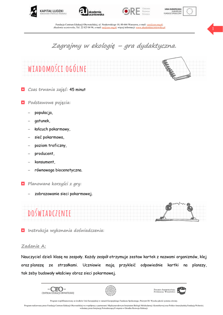 Fundacja Centrum Edukacji Obywatelskiej, ul. Noakowskiego 10, 00-666 Warszawa, e-mail: [email protected]; Akademia uczniowska, Tel. 22 825 04 96, e-mail: [email protected]; więcej informacji: www.akademiauczniowska.pl 1 Zagrajmy w ekologię – gra dydaktyczna. Czas trwania zajęć: 45 minut Podstawowe pojęcia: - populacja, - gatunek, - łańcuch pokarmowy, - sieć pokarmowa, - poziom troficzny, - producent, - konsument, - równowaga biocenotyczna. Planowane korzyści z gry: - zobrazowanie sieci pokarmowej. Instrukcja wykonania doświadczenia: Zadanie A: Nauczyciel dzieli klasę na zespoły. Każdy zespół otrzymuje zestaw kartek z nazwami organizmów, klej oraz planszę ze strzałkami. Uczniowie mają przykleić odpowiednie kartki na planszy, tak żeby budowały właściwy obraz sieci pokarmowej. Program współfinansowany ze środków Unii Europejskiej w ramach Europejskiego Funduszu Społecznego, Priorytet III: Wysoka jakość systemu oświaty. Program realizowany przez Fundację Centrum Edukacji Obywatelskiej we współpracy z partnerami: Międzynarodowym Instytutem Biologii Molekularnej i Komórkowej oraz Polsko-Amerykańską Fundacją Wolności; wdrażany przez Instytucję Pośredniczącą II stopnia w Ośrodku Rozwoju Edukacji. Fundacja Centrum Edukacji Obywatelskiej, ul. Noakowskiego 10, 00-666 Warszawa, e-mail: [email protected]; Akademia uczniowska, Tel. 22 825 04 96, e-mail: [email protected]; więcej informacji: www.akademiauczniowska.pl Nazwy organizmów: - kuna, - sokół, - lis, - sikorka, - żaba, - biedronka, - mszyca, - gąsienica motyla, - mysz, - ślimak, - rośliny uprawne. Program współfinansowany ze środków Unii Europejskiej w ramach Europejskiego Funduszu Społecznego, Priorytet III: Wysoka jakość systemu oświaty. Program realizowany przez Fundację Centrum Edukacji Obywatelskiej we współpracy z partnerami: Międzynarodowym Instytutem Biologii Molekularnej i Komórkowej oraz Polsko-Amerykańską Fundacją Wolności; wdrażany przez Instytucję Pośredniczącą II stopnia w Ośrodku Rozwoju Edukacji. 2 Fundacja Centrum Edukacji Obywatelskiej, ul. Noakowskiego 10, 00-666 Warszawa, e-mail: [email protected]; Akademia uczniowska, Tel. 22 825 04 96, e-mail: [email protected]; więcej informacji: www.akademiauczniowska.pl Uczniowie odpowiadają na pytania: 1. Rośliny uprawne zostały spryskane pestycydem zabijającym mszyce. Co stanie się z populacją biedronek? Jaki wpływ powyższa zmiana wywrze na populację łasic? 2. Do przepływającej w pobliżu rzeki dostały się toksyczne odpady z farbiarni tkanin. Chemikalia spowodowały całkowite wyginiecie populacji żab. Jak wpłynie to na schemat sieci pokarmowej? 3. Czy usunięcie któregoś z konsumentów pierwszego rzędu może spowodować całkowite wyginiecie którejś z populacji konsumentów wyższego rzędu? Co stałoby się gdyby podobną zmianę wprowadzić w prostym łańcuchu pokarmowym? Opcjonalnie uczniowie mogą wykonać postery, rysując wizerunki roślin i zwierząt, a następnie naklejając je na kolorową planszę z obrazem pola i pobliskiego lasu. Uwagi dla nauczyciela: Przed rozpoczęciem kolejnych gier warto omówić z uczniami pojecie modelu. Uświadomić im, że prosta symulacja z jednej strony jest w stanie uchwycić pewne prawidłowości, jakie zachodzą w przyrodzie, z drugiej strony często w sposób znaczący upraszcza rzeczywistość. W proponowanych poniżej grach pomijamy sytuację, w której nakładają się na siebie następujące po sobie pokolenia: pokolenie rodziców umiera natychmiast po wydaniu na świat potomstwa. Nie dyskutujemy też procesu rozmnażania płciowego: zakładamy, że przy nieograniczonych zasobach środowiska jeden osobnik dorosły, produkuje dwa organizmy potomne. Uproszczeniu ulega również kwestia nisz ekologicznych: przyjmujemy, że jeden lis zajmuje tyle samo miejsca, co jeden królik, oraz ilości materii przekazywanej z jednego ogniwa łańcuch pokarmowego do kolejnego: lis, aby przeżyć i wydąć na świat potomstwo musi zjeść tylko jednego królika. Mimo ograniczeń i uproszczeń modelu, proponowane gry znakomicie ilustrują wzajemną kontrolę liczebności populacji organizmów powiązanych zależnościami pokarmowymi. Program współfinansowany ze środków Unii Europejskiej w ramach Europejskiego Funduszu Społecznego, Priorytet III: Wysoka jakość systemu oświaty. Program realizowany przez Fundację Centrum Edukacji Obywatelskiej we współpracy z partnerami: Międzynarodowym Instytutem Biologii Molekularnej i Komórkowej oraz Polsko-Amerykańską Fundacją Wolności; wdrażany przez Instytucję Pośredniczącą II stopnia w Ośrodku Rozwoju Edukacji. 3 Fundacja Centrum Edukacji Obywatelskiej, ul. Noakowskiego 10, 00-666 Warszawa, e-mail: [email protected]; Akademia uczniowska, Tel. 22 825 04 96, e-mail: [email protected]; więcej informacji: www.akademiauczniowska.pl 4 Zadanie B: Gra zakłada symulację liczebności populacji królików i lisów w ekosystemie o ograniczonych zasobach. Uczniowie przed rozpoczęciem gry powinni zastanowić się, w jaki sposób rośnie populacja lisów, kiedy w ekosystemie nie ma żadnych ograniczeń zasobów naturalnych (wykładniczo). Oraz odpowiedzieć na pytanie, czy możliwa jest sytuacja, w której liczebności populacji lisów i królików będą się stale utrzymywały na tym samym poziomie? Reguły gry: Zakładamy, że ekosystem jest w stanie pomieścić w sumie jedenaście lisów i królików. Do tego, żeby lis się rozmnożył musi zjeść jednego królika. Wtedy wydaje na świat dwa młode lisy, sam zaś umiera. Jeśli nie uda mu się znaleźć królika - umiera, nie wydając na świat potomstwa, a jego miejsce zajmuje królik. Grę zaczynamy w momencie, kiedy w badanym ekosystemie znajduje się jeden lis i dziesięć królików. Uczniowie badają liczebność lisów i królików w kolejnych pokoleniach, a następnie zapisują uzyskane wyniki w postaci wykresu. Proponowany sposób opracowa