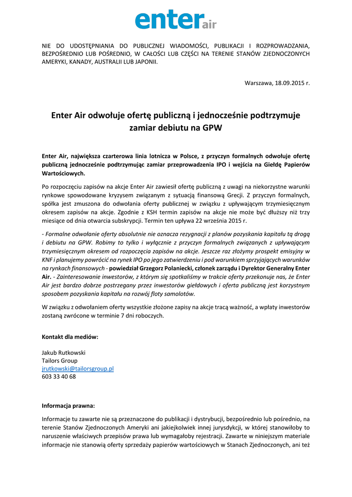 NIE DO UDOSTĘPNIANIA DO PUBLICZNEJ WIADOMOŚCI, PUBLIKACJI I ROZPROWADZANIA, BEZPOŚREDNIO LUB POŚREDNIO, W CAŁOŚCI LUB CZĘŚCI NA TERENIE STANÓW ZJEDNOCZONYCH AMERYKI, KANADY, AUSTRALII LUB JAPONII. Warszawa, 18.09.2015 r. Enter Air odwołuje ofertę publiczną i jednocześnie podtrzymuje zamiar debiutu na GPW Enter Air, największa czarterowa linia lotnicza w Polsce, z przyczyn formalnych odwołuje ofertę publiczną jednocześnie podtrzymując zamiar przeprowadzenia IPO i wejścia na Giełdę Papierów Wartościowych. Po rozpoczęciu zapisów na akcje Enter Air zawiesił ofertę publiczną z uwagi na niekorzystne warunki rynkowe spowodowane kryzysem związanym z sytuacją finansową Grecji. Z przyczyn formalnych, spółka jest zmuszona do odwołania oferty publicznej w związku z upływającym trzymiesięcznym okresem zapisów na akcje. Zgodnie z KSH termin zapisów na akcje nie może być dłuższy niż trzy miesiące od dnia otwarcia subskrypcji. Termin ten upływa 22 września 2015 r. - Formalne odwołanie oferty absolutnie nie oznacza rezygnacji z planów pozyskania kapitału tą drogą i debiutu na GPW. Robimy to tylko i wyłącznie z przyczyn formalnych związanych z upływającym trzymiesięcznym okresem od rozpoczęcia zapisów na akcje. Jeszcze raz złożymy prospekt emisyjny w KNF i planujemy powrócić na rynek IPO po jego zatwierdzeniu i pod warunkiem sprzyjających warunków na rynkach finansowych - powiedział Grzegorz Polaniecki, członek zarządu i Dyrektor Generalny Enter Air. - Zainteresowanie inwestorów, z którym się spotkaliśmy w trakcie oferty przekonuje nas, że Enter Air jest bardzo dobrze postrzegany przez inwestorów giełdowych i oferta publiczną jest korzystnym sposobem pozyskania kapitału na rozwój floty samolotów. W związku z odwołaniem oferty wszystkie złożone zapisy na akcje tracą ważność, a wpłaty inwestorów zostaną zwrócone w terminie 7 dni roboczych. Kontakt dla mediów: Jakub Rutkowski Tailors Group [email protected] 603 33 40 68 Informacja prawna: Informacje tu zawarte nie są przeznaczone do publikacji i dystrybucji, bezpośrednio lub pośrednio, na terenie Stanów Zjednoczonych Ameryki ani jakiejkolwiek innej jurysdykcji, w której stanowiłoby to naruszenie właściwych przepisów prawa lub wymagałoby rejestracji. Zawarte w niniejszym materiale informacje nie stanowią oferty sprzedaży papierów wartościowych w Stanach Zjednoczonych, ani też papiery wartościowe nie mogą być oferowane i sprzedawane w Stanach Zjednoczonych bez rejestracji lub zwolnienia z rejestracji zgodnie z amerykańską Ustawą o Papierach Wartościowych z 1933 r. z późniejszymi zmianami oraz jej zasadami i przepisami, w tym przepisami Regulacji S. Nie jest zamierzona rejestracja jakiejkolwiek części oferty w Stanach Zjednoczonych Ameryki ani przeprowadzenie oferty publicznej papierów wartościowych w Stanach Zjednoczonych Ameryki. Informacje tu zawarte nie stanowią oferty sprzedaży ani zachęty do składania ofert kupna, ani też nie nastąpi sprzedaż papierów wartościowych w żadnej jurysdykcji, w której oferta taka, zachęta lub sprzedaż byłaby bezprawna przed rejestracją, zwolnieniem z rejestracji lub upoważnieniem na podstawie przepisów o papierach wartościowych danej jurysdykcji. Zawarte w niniejszym materiale informacje służą celom marketingowym i informacyjnym i nie stanowią oferty sprzedaży ani zachęty bądź zaproszenia do nabywania lub składania zapisów na jakiekolwiek papiery wartościowe. Prospekt emisyjny („Prospekt”), sporządzony w związku z ofertą publiczną i ubieganiem się o dopuszczenie oraz wprowadzenie papierów wartościowych Enter Air S.A. („Spółka”) do obrotu na Giełdzie Papierów Wartościowych w Warszawie S.A. („GPW”), zatwierdzony przez Komisje Nadzoru Finansowego w dniu 15 czerwca 2015 r., wraz ze wszystkimi aneksami i komunikatami aktualizującymi, jest jedynym prawnie wiążącym dokumentem zawierającym informacje o Spółce i publicznej ofercie jej akcji w Polsce („Oferta”). Papiery wartościowe objęte Prospektem nie mogą być oferowane poza granicami Rzeczypospolitej Polskiej (w tym na terenie innych państw Unii Europejskiej oraz Stanów Zjednoczonych Ameryki, Kanady, Australii i Japonii). Prospekt został udostępniony na stronach internetowych Spółki (www.enterair.pl) i Oferującego (www.ipopemasecurities.pl.)