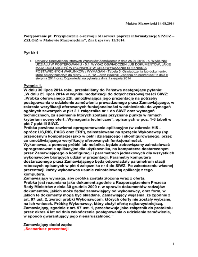 Maków Mazowiecki 14.08.2014 Postępowanie pt. Przyspieszenie e-rozwoju Mazowsza poprzez informatyzację SPZOZ – ZZLOiZ w Makowie Mazowieckim”, Znak sprawy 15/2014. Pyt Nr 1 1. Dotyczy: Specyfikacja Istotnych Warunków Zamówienia z dnia 25.07.2014 - 5. WARUNKI UDZIAŁU W POSTĘPOWANIU - 5.1. WYKAZ OŚWIADCZEŃ LUB DOKUMENTÓW, JAKIE MAJĄ DOSTARCZYĆ WYKONAWCY W CELU WYKAZANIA SPEŁNIANIA POSTAWIONYCH WARUNKÓW / WYMAGAŃ - Tabela 5. Oświadczenia lub dokumenty, które należy załączyć do oferty. – L.p. 12 – oraz złącznik „Zadania do prezentacji” z dnia 6 sierpnia 2014 oraz Odpowiedzi na pytania z dnia 1 sierpnia 2014 Pytanie 1. W dniu 30 lipca 2014 roku, przesłaliśmy do Państwa następujące pytanie: „W dniu 25 lipca 2014 w wyniku modyfikacji do dotychczasowej treści SIWZ: „Próbka oferowanego ZSI, umożliwiająca jego prezentację na potrzeby postępowania o udzielenie zamówienia prowadzonego przez Zamawiającego, w zakresie weryfikacji oferowanych funkcjonalności w odniesieniu do wymagań ogólnych zawartych w pkt 2.1 załącznika nr 1 do SIWZ oraz wymagań technicznych, za spełnienie których zostaną przyznane punkty w ramach kryterium oceny ofert „Wymagania techniczne”, opisanych w poz. 1-6 tabeli w pkt 7 ppkt III SIWZ. Próbka powinna zawierać oprogramowanie aplikacyjne (w zakresie HIS oprócz LIS,RIS, PACS oraz ERP), zainstalowane na sprzęcie Wykonawcy (np. przenośnym komputerze) jako w pełni działającego i skonfigurowanego, przez co umożliwiającego weryfikację oferowanych funkcjonalności. Wykonawca, z pomocą próbki lub nośnika, będzie zobowiązany zainstalować oprogramowanie aplikacyjne dla użytkownika, na komputerze dostarczonym przez Zamawiającego o konfiguracji i parametrach jednakowych dla wszystkich wykonawców biorących udział w prezentacji. Parametry komputera dostarczonego przez Zamawiającego będą odpowiadały parametrom stacji roboczych opisanych w pkt 4 załącznika nr 4 do SIWZ. Po zakończeniu własnej prezentacji każdy wykonawca usunie zainstalowaną aplikację z tego komputera. Zamawiający wymaga, aby próbka została złożona wraz z ofertą. Próbka jest rozumiana jako dokument zgodnie z Rozporządzeniem Prezesa Rady Ministrów z dnia 30 grudnia 2009 r. w sprawie dokumentów rodzajów dokumentów, jakich może żądać zamawiający od wykonawcy, oraz form, w jakich te dokumenty mogą być składane. Zamawiający wyjaśnia, że zgodnie z art. 97 ust. 2, zwróci próbki Wykonawcom, których oferty nie zostały wybrane, na ich wniosek. Próbkę Wykonawcy, który złożył ofertę najkorzystniejszą, Zamawiający, zgodnie z art. 97 ust. 1, przechowuje jako załącznik do protokołu przez okres 4 lat od dnia zakończenia postępowania o udzielenie zamówienia, w sposób gwarantujący jego nienaruszalność.” Zamawiający dodał zapis: „Scenariusz prezentacji 1 1) Prezentacje będą odbywały się w godzinach 10.00 – 14.30 w siedzibie Zamawiającego. 2) Wykonawcy zostaną powiadomieni o terminie i dokładnym miejscu prezentacji na 3 dni robocze przed planowanym terminem. 3) Wykonawca po uruchomieniu prezentacji otrzyma 30 zadań do wykonania, których wykonanie będzie weryfikacją spełnienia wymaganych funkcjonalności systemu HIS i ERP (moduły wymienione w punkcie pkt. 2 - HIS i pkt. 3 ERP Zał. Nr 1 specyfikacji ). Zamawiający dokona wyboru 30 zadań do wykonania przez Wykonawcę w ten sposób że z każdego modułu, o którym mowa dokona wyboru do prezentacji co najmniej jednej funkcjonalności, nie więcej jednak niż 3. Prezentacja jednej funkcjonalności oznacza jedno zadanie. Zadanie zostanie uznane za wykonane jeżeli wykonawca osiągnie efekt przewidziany dla danej funkcjonalności np: a) realizacja funkcjonalności planowanie i zlecanie z aplikacji zlecenia (Zał. Nr 1 pkt. 2.6) zostanie uznana za wykonaną jeżeli wykonawca po wprowadzeniu do systemu zlecenia na leki uzyska ujawnienie tej informacji w karcie zlecenia pielęgniarek następnie dokona realizacji zlecenia co w efekcie powinno doprowadzić do zdjęcia leku ze stanu apteczki oddziałowej. Wykonanie tych czynności powinno również znaleźć swój skutek w kalkulacji kosztów leczenia pacjenta. 4) Wszyscy Wykonawcy otrzymają jednakowe zadania do zaprezentowania. 5) Kolejność prezentacji określana będzie zgodnie z atrakcyjnością cenową ofert. 6) W prezentacjach Ze strony Wykonawcy upełnomocniona osoba. 7) Ze strony Zamawiającego uczestniczyć będzie Komisja Przetargowa oraz osoby upoważnione przez Kierownika Jednostki 8) Komisja sporządzi protokół z prezentacji z potwierdzeniem zgodności z wymaganiami lub braku ich spełnienia. 9) Prezentacja będzie utrwalona w formie zapisu video. 10) Wykonawca musi zabezpieczyć możliwość dokonania wydruku (z zabezpieczeniem do 500 stron papieru).” Skutkiem powyższej zmiany SIWZ nastąpiła sprzeczność, ponieważ w/w przedmiotowe zapisy wzajemnie się wykluczają. Zgodnie z pierwotnym zapisem Zamawiający wymagał, aby próbka zawierała oprogramowanie aplikacyjne HIS, a prezentacja obejmowała weryfikację oferowanych funkcjonalności w odniesieniu do wymagań ogólnych zawartych w pkt 2.1 załącznika nr 1 do SIWZ oraz wymagań technicznych, za spełnienie których zostaną przyznane punkty w ramach kryterium oceny ofert „Wymagania techniczne”, opisanych w poz. 1-6 tabeli w pkt 7 ppkt III SIWZ. Dodany zapis stanowi, że Wykonawca po uruchomieniu prezentacji otrzyma 30 zadań do wykonania, których wykonanie będzie weryfikacją spełnienia wymaganych funkcjonalności systemu HIS i ERP (moduły wymienione w punkcie pkt. 2 - HIS i pkt. 3 ERP Zał. Nr 1 specyfikacji). Prosimy o wyjaśnienie, jaki jest zakres próbki po dokonaniu w/w modyfikacji SIWZ. Obecna sprzeczność SIWZ uniemożliwia przygotowanie próbki i złożenie oferty. Ponadto tą modyfikacją Zamawiający znacząco rozszerza zakres, jaki ma obejmować próbka, a czas jaki pozostał Wykonawcom na przygotowa