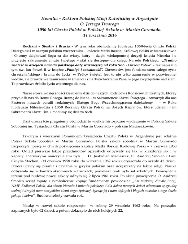 Homilia – Rektora Polskiej Misji Katolickiej w Argentynie O. Jerzego Twaroga 1050 lat Chrztu Polski w Polskiej Szkole w Martin Coronado. 11 września 2016 Kochani – Siostry i Bracia - W tym roku obchodzimy Jubileusz 1050-lecia Chrztu Polski. Dlatego dziś w naszym polskim wieczerniku – kościele Matki Boskiej Królowej Polski w Maciaszkowie - Chcemy dziękować Bogu za dar wiary, który – dzięki wiekopomnej decyzji księcia Mieszka I o przyjęciu sakramentu chrztu świętego – stał się dostępny dla całego Narodu Polskiego. „Trudno znaleźć w dziejach narodu polskiego datę ważniejszą od roku 966 - Chrzest Polski” – tak napisał o tym św. Jan Paweł II w książce „Pamięć i tożsamość”. Chrzest św. jest fundamentem całego życia chrześcijańskiego i bramą do życia w Trójcy Świętej. Jest to nie tylko zanurzenie w poświęconej wodzie, ale prawdziwe zanurzenie w śmierci i zmartwychwstaniu Pana, w Jego zwycięstwie nad złem. To prawdziwe źródło życia wiecznego dla nas. Nasze słowa wdzięczności kierujemy dziś do naszych Rodziców i Rodziców chrzestnych, którzy przynieśli nas do Domu Bożego. Bramę do Nieba – w Sakramencie Chrztu Świętego – otworzyli dla nas Pasterze naszych parafii rodzinnych. Dlatego Bogu Wszechmogącemu dziękujemy - w Roku Jubileuszu Miłosierdzia i 1050 Rocznicy Chrztu Polski, za Bożych Kapłanów, który udzielili nam Sakramentu Chrztu św. i modlimy się dziś za Nich. Dziś uroczyście pragniemy obchodzić to wielkie historyczne wydarzenie w Polskiej Szkole Sobotniej im. Tysiąclecia Chrztu Polski w Martin Coronado – polskim Maciaszkowie. Trwałym i wiecznym Pomnikiem Tysiąclecia Chrztu Polski w Argentynie jest właśnie Polska Szkoła Sobotnia w Martin Coronado. Polska szkoła sobotnia w Martin Coronado rozpoczęła pracę w chwili poświęcenia kaplicy Matki Boskiej Królowej Poski – 7 czerwca 1958 roku. Odtąd pierwsze lekcje przedmiotów ojczystych odbywały się tak w klasztorze jak i w kaplicy. Pierwszymi nauczycielami byli O. Justynian Maciaszek, O. Andrzej Smoleń i Pani Cecylia Stachoń. Od czerwca 1958 roku do września 1962 roku uczęszczało do szkoły 42 dzieci. Dzieci uczyły się pisania i czytania w języku polskim oraz uczęszczały na lekcje religi. Nauka odbywała się w bardzo skromnych warunkach, ponieważ brak było sal szkolnych. Poświęcenie terenu pod budowę nowej szkoły odbyło się 2 lipca 1961 roku. Po akcie poświęcenia O. Andrzej Smoleń wziął łopatę i symbolicznie kopiąc fundamenty powiedział: „Ku większej chwale Bożej, NMP Królowej Polski, dla sławy Narodu i imienia polskiego i dla dobra naszych dzieci odrzucam tę grudkę wolnej i drogiej nam wszystkim ziemi argentyńskiej, życząc jej i nam obfitych i błogich owoców z tego dzieła pokoju i dobra”. Budowa szkoły trawała rok. Naukę w nowej szkole rozpoczęto w sobotę 29 września 1962 roku. Na początku zapisanych było 62 dzieci, a potem dołączyło do nich kolejnych 22. Było to wielkie osiągnięcie. Kierowniczką szkoły została Pani Cecylia Stachoń, a pracowało w niej 6 nauczycieli. Wśród organizacji polskich przy Ośrodku w Maciaszkowie ważną rolę spełniała i spełnia dziś Polska Szkoła Sobotnia im. Tysiąclecia Chrztu Polski. Jej nieprzerwalna działalność wychowawcza świadczy o wysiłku OO. Franciszkanów i społeczeństwa polskiego w krzewieniu i przekazywaniu dzieciom i młodzieży polskiej kultury oraz w umacnianiu poczucia narodowego. Dziś – pragniemy podziękować na ręcę obecnej Kierowniczki szkoły Pani Teresie Uzarowicz Bąk – wszystkim nauczycielom tej szkoły, którzy przez te wszystkie lata charytatywnie pracowali w polskiej szkole sobotniej w Maciaszkowie. Dziękujemy rodzicom i dzieciom, którzy wyszli z tej szkoły wychowani w polskiej kulturze. I na koniec życzenia dla Nauczycieli, rodziców i dzieci. Posłużę się słowami Papieża Franciszka jakie wypowiedział w czasie światowych dni młodzieży w Krakowie w lipcu tego roku. Dzieci i młodzież są nadzieją przyszłości świata i Kościoła, ale pod warunkami: pierwszy to pamięć. Zawsze zadawajcie sobie to pytanie: skąd pochodzę. Pamięć o moim narodzie, pamięć o mojej rodzinie, pamięć o całej mojej historii. Młody człowiek pozbawiony pamięci nie jest nadzieją przyszłości. Rozmawiajcie z rodzicami, z osobami starszymi, ale zwłaszcza rozmawiajcie z dziadkami. Zatem, jeśli chcesz być nadzieją przyszłości musisz przejąć pochodnię od swojego dziadka i babci. Pytajcie ich, bo oni są mądrością narodu. Tak więc, pierwszy warunek, żeby być nadzieją, to pamiętać. Drugi warunek. Skoro jestem nadzieją przyszłości i pamiętam o przeszłości, to zostaje teraźniejszość. Jaki mam być w teraźniejszości? Masz być odważny, śmiały, nie przestraszyć się. Zatem, w teraźniejszości: odwaga i śmiałość. A więc, „Pamięć!” , „Odwaga”i „Nadzieja” to przesłanie dla dzisiejszych dzieci i młodzieży. Do rodziców dzieci i młodzieży, Ojciec święty Franciszek powiedział w Krakowie z okna papieskiego przy ul. Franciszkańskiej: Co zrobić, żeby małżeństwo - rodzina zawsze zmierzała do przodu, pokonując wszelkie trudności. Zachęcam was, żebyście zawsze korzystali z trzech słów, które wyrażają trzy postawy, a które pomogą wam, przeżyć życie małżenskie. Małżeństwo jest czymś tak pięknym, że musimy o nie dbać, bo przecież jest ono na zawsze. Te trzy słowa to: POZWÓL, DZIĘKUJE I PRZEPRASZAM / PERMISO, GRACIAS Y PERDON/. Niech te słowa będą codziennie i jak najczęściej wypowiadane w rodzinach. Niech Pan Bóg błogosławi Polskiej Szkole Sobotniej im. Tysiąclecia Chrztu Polski w Maciaszkowie, a Matka Boża Królowa Polski otacza ją Matczynym płaszczem na kolejne pokolenia. Wszystkim życzymy – staropolskie Szczęść Boże.