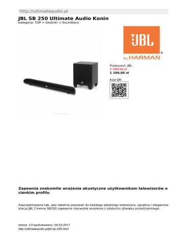 http://ultimateaudio.pl JBL SB 250 Ultimate Audio Konin kategoria: TOP > Głośniki > Soundbary Producent: JBL 1 799,00 zł 1 199,00 zł Kod QR: Zapewnia znakomite wrażenia akustyczne użytkownikom telewizorów o cienkim profilu Zaprojektowana tak, aby idealnie pasować do każdego płaskiego telewizora, zgrabna i elegancka stacja JBL Cinema SB250 zapewnia niezwykłe wrażenia z odsłuchu dźwięku przestrzennego. strona: 1/2 wydrukowano: 04-03-2017 http://ultimateaudio.pl/jbl-sb-250.html Można ją bezprzewodowo podłączyć do kompaktowych subwooferów o wysokiej mocy, a także jednym przewodem do telewizora. Może poprawić doznania estetyczne dzięki technologii strumieniowania bezprzewodowego Bluetooth, takiej jak JBL SoundShift™, która współpracuje jednocześnie z telewizorem i bezprzewodowym urządzeniem przenośnym, dzięki czemu możesz automatycznie przełączać źródło audio z telewizora na smartfon i tablet lub odwrotnie. Urządzenie JBL Cinema SB250 potrafi obsługiwać system zdalnego sterowania dźwiękiem dowolnego telewizora, co zapewnia uproszczone sterowanie systemem kina domowego. Przełącznik korekty, instalowany na ścianie lub stawiany na stole, może dostosować stację SB250 do każdego rodzaju instalacji, zaś niezależne sterowanie głośnością subwoofera umożliwia odtwarzanie niskich tonów w zależności od upodobań. Zestaw zawiera: 1 1 1 1 1 1 1 1 zestaw Cinema SB250 Soundbar bezprzewodowy subwoofer JBL pilot zdalnego sterowania analogowy przewód 3,5 mm przewód optyczny przewodnik szybkiego startu karta gwarancyjna karta charakterystyki strona: 2/2 wydrukowano: 04-03-2017 http://ultimateaudio.pl/jbl-sb-250.html