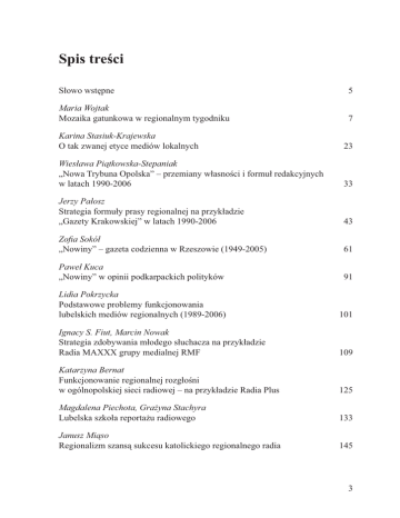 6SLVWUHĞFL 6áRZRZVWĊSQH 5 Maria Wojtak 0R]DLNDJDWXQNRZDZUHJLRQDOQ\PW\JRGQLNX 7 Karina Stasiuk-Krajewska 2WDN]ZDQHMHW\FHPHGLyZORNDOQ\FK 3 :LHVáDZD3LąWNRZVND6WHSDQLDk Ä1RZD7U\EXQD2SROVND´±SU]HPLDQ\ZáDVQRĞFLLIRUPXáUHGDNF\MQ\FK ZODWDFK 3 -HU]\3DáRVz 6WUDWHJLDIRUPXá\SUDV\UHJLRQDOQHMQDSU]\NáDG]LH Ä*D]HW\.UDNRZVNLHM´ZODWDFK 3 =R¿D6RNyá Ä1RZLQ\´±JD]HWDFRG]LHQQDZ5]HV]RZLH 3DZHá.XFa Ä1RZLQ\´ZRSLQLLSRGNDUSDFNLFKSROLW\NyZ /LGLD3RNU]\FNa 3RGVWDZRZHSUREOHP\IXQNFMRQRZDQLD OXEHOVNLFKPHGLyZUHJLRQDOQ\FK ,JQDF\6)LXW0DUFLQ1RZDk 6WUDWHJLD]GRE\ZDQLDPáRGHJRVáXFKDF]DQDSU]\NáDG]LH 5DGLD0$;;;JUXS\PHGLDOQHM50) Katarzyna Bernat )XQNFMRQRZDQLHUHJLRQDOQHMUR]JáRĞQL ZRJyOQRSROVNLHMVLHFLUDGLRZHM±QDSU]\NáDG]LH5DGLD3OXV 5 0DJGDOHQD3LHFKRWD*UDĪ\QD6WDFK\Ua /XEHOVNDV]NRáDUHSRUWDĪXUDGLRZHJR 3 -DQXV]0LąVo 5HJLRQDOL]PV]DQVąVXNFHVXNDWROLFNLHJRUHJLRQDOQHJRUDGLD 5 3 0DUWD:URĔVND5\V]DUG3ĊF]NRZVNi :L]HUXQHNQDXF]\FLHODNUHRZDQ\SU]H]PHGLDUHJLRQDOQH WRNRKHUHQFMDDGLDIRU\]DFMDF]\]DJURĪHQLHZUHODFMDFKVSRáHF]Q\FK" 3 8UV]XOD*UXFD0LąVLk (GXNDFMDPRUDOQD]DSRĞUHGQLFWZHPPHGLyZORNDOQ\FK $JDWD)LMXWK ']LDáDQLDSXEOLFUHODWLRQVU]HF]QLNDSUDVRZHJRRUD]=HVSRáX GV3URPRFML8QLZHUV\WHWX0DULL&XULH6NáRGRZVNLHM $GDP-DFKLPF]\k ,QWHUQHWRZHDUFKLZDUHJLRQDOQHMSUDV\ 7 -RODQWD']LHUĪ\ĔVND0LHOF]DUHk =PLDQ\WHU\WRULDOQHMRUJDQL]DFML3ROVNL]URNXDORNDOQH ĞURGNLNRPXQLNRZDQLDPDVRZHJR6WXGLXPSU]\SDGNX&]ĊVWRFKRZ\ 5 ,ORQD%LHUQDFND/LJLĊ]a :áDG]DVDPRU]ąGRZDZSUDVLHORNDOQHMQDSU]\NáDG]LH Ä7\JRGQLND']LHUĪRQLRZVNLHJR´Ä*D]HW\:URFáDZVNLHM´ LÄ6áRZD3ROVNLHJR´ 3 5HQDWD-RFK\PHk -DNORNDOQHJD]HW\SR]\VNXMąF]\WHOQLNyZF]\OLU\ZDOL]DFMD Ä.UHDWRUD´]Ä3U]HáRPHP´ 5 :RMFLHFK)XUPDn 3DUDGRNVSUDV\VDPRU]ąGRZHMQDSU]\NáDG]LH Ä%U]R]RZVNLHM*D]HW\3RZLDWRZHM´ 7 5DIDá3RODk .RQWURODZáDG]\ORNDOQHMSU]H]SUDVĊORNDOQąZRSLQLLPLHV]NDĔFyZ SRZLDWXGĊELFNLHJR 7 0DUFLQ-XU]\VWa 0HGLDORNDOQH±U]HWHOQ\ÄGRVWDZFDLQIRUPDFML´ÄWXEDSURSDJDQGRZD´ ZUĊNDFKZáDG]\F]\WHĪSROHG\VNXVMLLQWHOHNWXDOQ\FK $QDOL]DQDSU]\NáDG]LHIXQNFMRQRZDQLDJPLQQHJRSHULRG\NX Ä.ZDUWDOQLN&]XGHFNL´