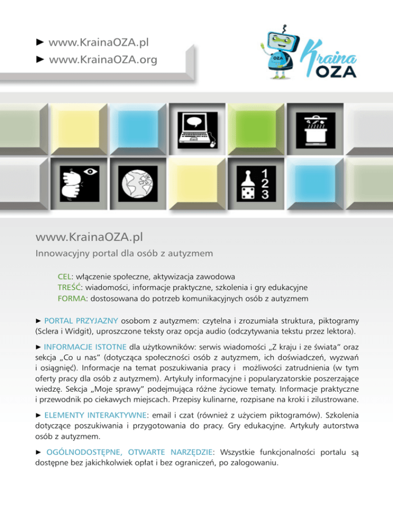▶ www.KrainaOZA.pl ▶ www.KrainaOZA.org www.KrainaOZA.pl Innowacyjny portal dla osób z autyzmem CEL: włączenie społeczne, aktywizacja zawodowa TREŚĆ: wiadomości, informacje praktyczne, szkolenia i gry edukacyjne FORMA: dostosowana do potrzeb komunikacyjnych osób z autyzmem ▶ PORTAL PRZYJAZNY osobom z autyzmem: czytelna i zrozumiała struktura, piktogramy (Sclera i Widgit), uproszczone teksty oraz opcja audio (odczytywania tekstu przez lektora). ▶ INFORMACJE ISTOTNE dla użytkowników: serwis wiadomości „Z kraju i ze świata” oraz sekcja „Co u nas” (dotycząca społeczności osób z autyzmem, ich doświadczeń, wyzwań i osiągnięć). Informacje na temat poszukiwania pracy i możliwości zatrudnienia (w tym oferty pracy dla osób z autyzmem). Artykuły informacyjne i popularyzatorskie poszerzające wiedzę. Sekcja „Moje sprawy” podejmująca różne życiowe tematy. Informacje praktyczne i przewodnik po ciekawych miejscach. Przepisy kulinarne, rozpisane na kroki i zilustrowane. ▶ ELEMENTY INTERAKTYWNE: email i czat (również z użyciem piktogramów). Szkolenia dotyczące poszukiwania i przygotowania do pracy. Gry edukacyjne. Artykuły autorstwa osób z autyzmem. ▶ OGÓLNODOSTĘPNE, OTWARTE NARZĘDZIE: Wszystkie funkcjonalności portalu są dostępne bez jakichkolwiek opłat i bez ograniczeń, po zalogowaniu. ▶ MOŻLIWOŚCI WYKORZYSTANIA PORTALU: dostępne, proste w użyciu, bezpłatne narzędzie, z którego można korzystać zarówno indywidualnie, na przykład w domu, jak i w szkołach, ośrodkach, na warsztatach, do wzbogacenia zajęć. Umożliwia dodawanie treści i stworzenie własnej lokalnej ministrony w ramach sekcji „Grupy i organizacje”. ▶ MOŻLIWOŚĆ WSPÓŁTWORZENIA PORTALU: nadsyłania informacji o wydarzeniach, arty- kułów, informowania o swojej działalności, wymiany doświadczeń i dyskutowania na Forum Kraina Oza. www.KrainaOZA.org Portal dla otoczenia osób z autyzmem: terapeutów, nauczycieli, studentów, rodziców i opiekunów, instytucji wspierających i edukacyjnych, potencjalnych pracodawców K R A Kariera Rozwój Aktywizacja I N Innowacyjność Niezależność A Akceptacja O Z A Osób z Autyzmem Portal utworzono w ramach innowacyjnego projektu pt. Edu-Autyzm, współfinansowanego ze środków Unii Europejskiej w ramach Programu Operacyjnego Kapitał Ludzki i realizowanego przez Fundację Wspólnota Nadziei we współpracy z Małopolskim Związkiem Pracodawców Lewiatan, belgijskim stowarzyszeniem WAI-NOT oraz flamandzkim uniwersytetem Thomas More (KU Leuven). Projekt współfinansowany ze środków Unii Europejskiej w ramach Europejskiego Funduszu Społecznego CZŁOWIEK – NAJLEPSZA INWESTYCJA
