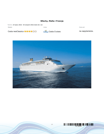 Włochy, Malta i Francja Termin: 24 lipiec 2016 - 04 sierpień 2016 (ilość dni: 12) Statek: Costa neoClassica Linia: Cena od: Costa Cruises na zapytanie/os. 1/3 EV:38205 TRASA REJSU dzień 1 dzień 2 dzień 3 dzień 4 dzień 5 dzień 6 dzień 7 dzień 8 dzień 9 dzień 10 dzień 11 dzień 12 Data Port Wpłynięcie Wypłynięcie niedziela 24.07.2016 Savona --:-- 19:00 poniedziałek 25.07.2016 Portoferraio, Elba 08:00 18:00 14:00 --:-- --:-- 23:59 08:00 18:00 08:00 18:00 08:00 18:00 08:00 18:00 09:00 20:00 08:00 18:00 08:00 18:00 08:00 --:-- Włochy Włochy Capri wtorek 26.07.2016 Włochy środa 27.07.2016 Włochy Capri czwartek 28.07.2016 Salerno piątek 29.07.2016 Katania, Sycylia sobota 30.07.2016 Valletta niedziela 31.07.2016 Trapani poniedziałek 01.08.2016 Olbia, Sardynia wtorek 02.08.2016 Propriano, Korsyka środa 03.08.2016 czwartek 04.08.2016 Włochy Włochy Malta Włochy Włochy Francja Tulon Francja Savona Włochy CENNIK 2/3 EV:38205 Legenda Cena katalogowa Classic 4 657.87zł Premium 4 879.89zł Opłaty portowe Cena promocyjna 710.45zł Uwaga! Ceny za osobę w kabinie dwuosobowej. Cena zawiera: zakwaterowanie w kabinie wybranej kategorii; wyżywienie - 3 główne posiłki, przekąski między posiłkami; napoje serwowane do śniadania i w bufetach samoobsługowych; serwis bagażowy podczas wejścia i zejścia ze statku; serwis kabinowy; korzystanie ze wszystkich urządzeń sportowo - rekreacyjnych znajdujących się na pokładzie statku (basen, jacuzzi, sala fitness, itp.); udział we wszystkich imprezach organizowanych na statku (przedstawienia w teatrze, koncerty, programy animacyjne itp.). Cena nie zawiera: kosztów dojazdu do portu; opłat portowych; ewentualnych noclegów w hotelu przed/po rejsie i transferów; wycieczek fakultatywnych w trakcie rejsu; korzystania z barów, mini baru w kabinie oraz napojów zamawianych w restauracji; korzystania z punktów usługowych (fryzjer, pralnia, fotograf, salon piękności i odnowy biologicznej, internet) i wydatków osobistych; napiwków dla obsługi na statku (kwota uzależniona od długości rejsu); ubezpieczenia KL, NNW i bagaż, kosztów wiz (tam gdzie wymagane). Uwagi: Od 01.12.2015 na wszystkich rejsach Costa Cruises (z min. 5 noclegów) można zarezerwować następujące pakiety all inclusive: dla dzieci 4-17 lat Giovani od 15.99€/os./dzień, dla dorosłych: Brindiamo od 24.99€/os./dzień, Piu Gusto od 27.99€/os./dzień, Intenditore od 45.99€/os./dzień (pakiet musi być wykupiony przez każdą osobę zakwaterowaną w kabinie - można zakupić w biurze przed rejsem). Na Państwa życzenie zarezerwujemy przelot, transfery do/z portu, parking, dodatkowe noclegi oraz zadbamy o odpowiednie ubezpieczenie podróżne. 3/3 EV:38205